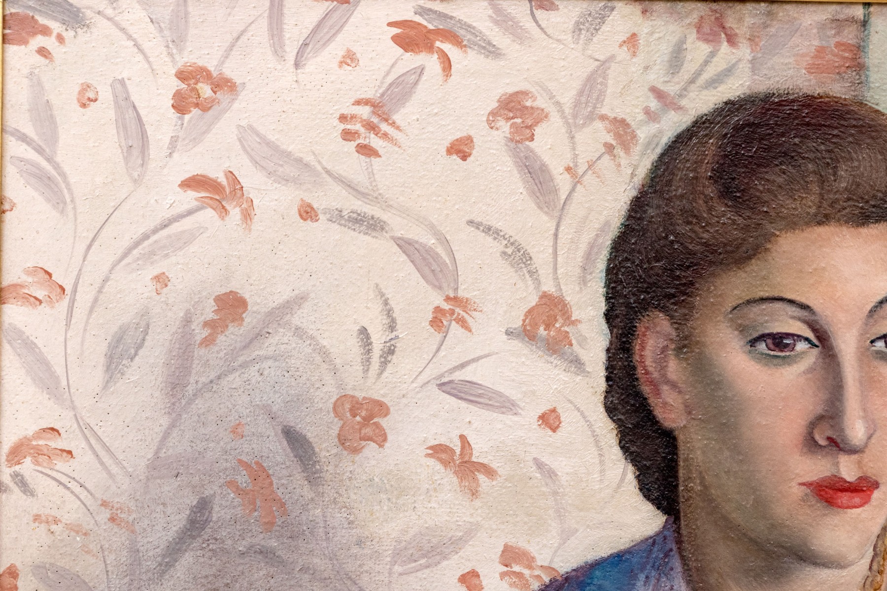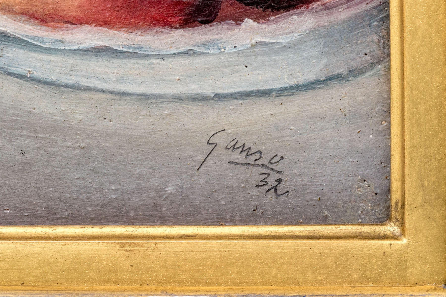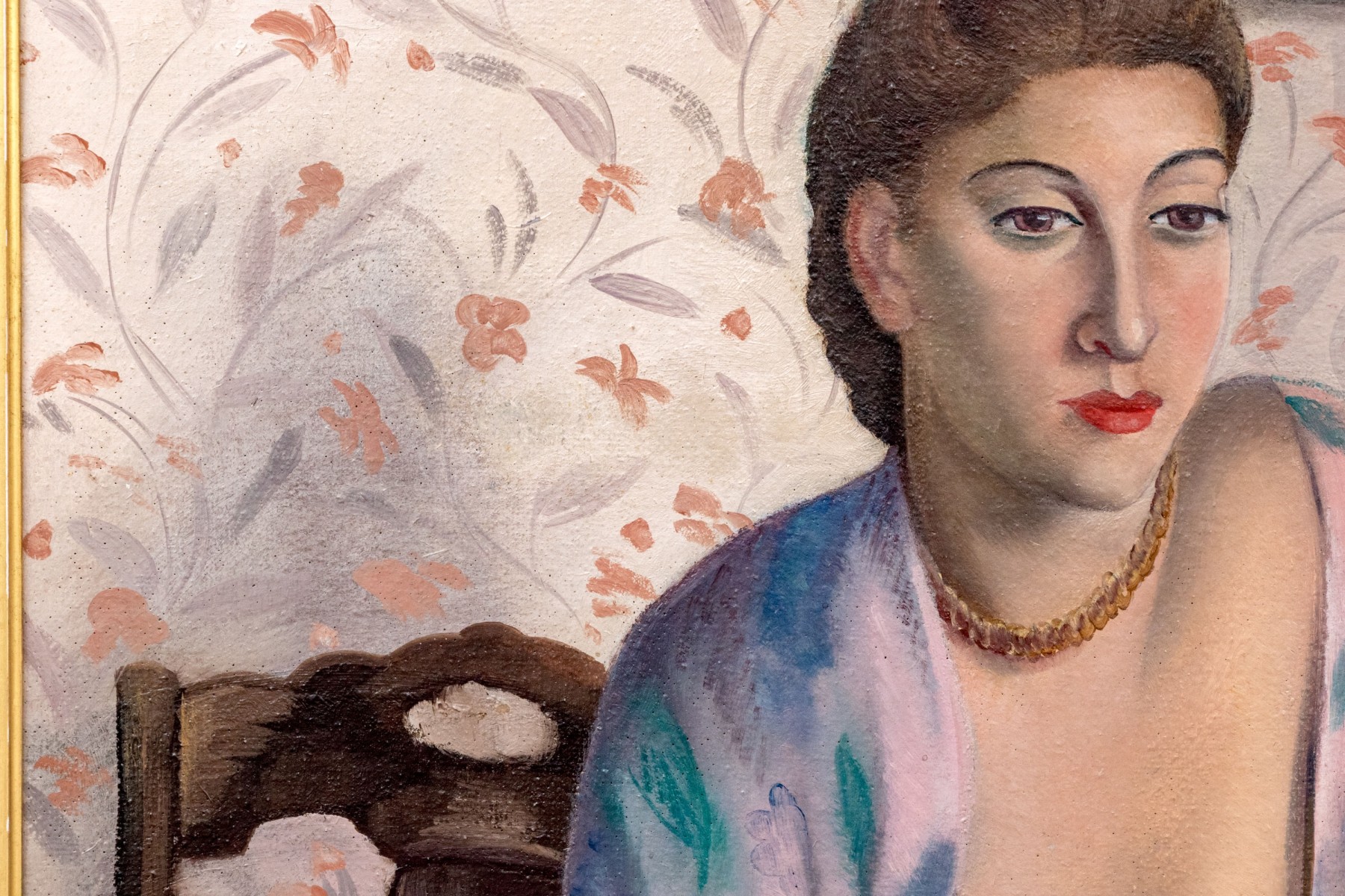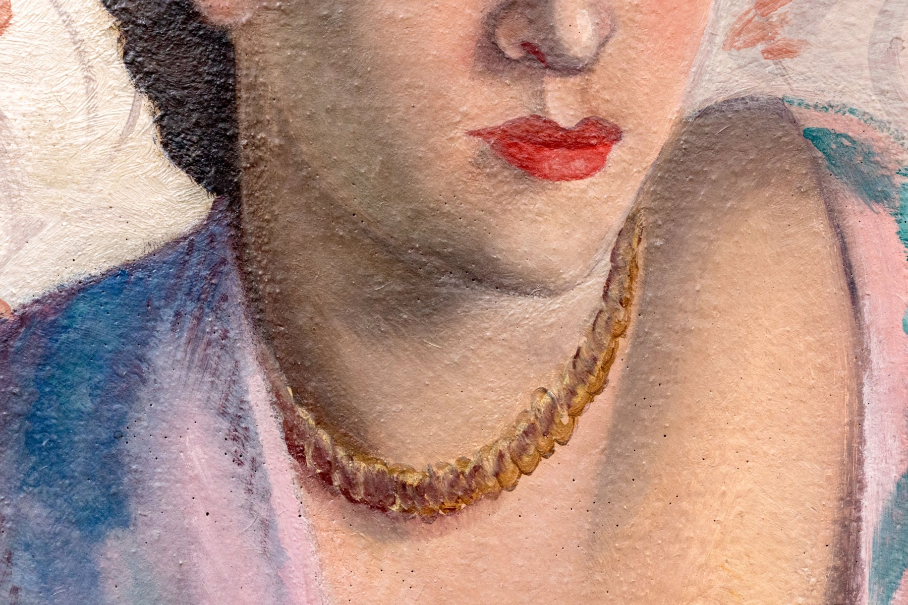 Emil Ganso (German-American, 1895-1941) "Breakfast" oil painting on masonite depicting a female nude draping a pink, green, and blue robe or shawl around her shoulders wearing a gold necklace seated at a table with arms crossed. The figure leans forward in a brown wood fiddle splat chair at a breakfast table covered with a white tablecloth set with a bowl of peaches. The tablecloth features a floral pattern the compliments pale pink wallpaper with vining patterns. Signed lower right and dated 1932.