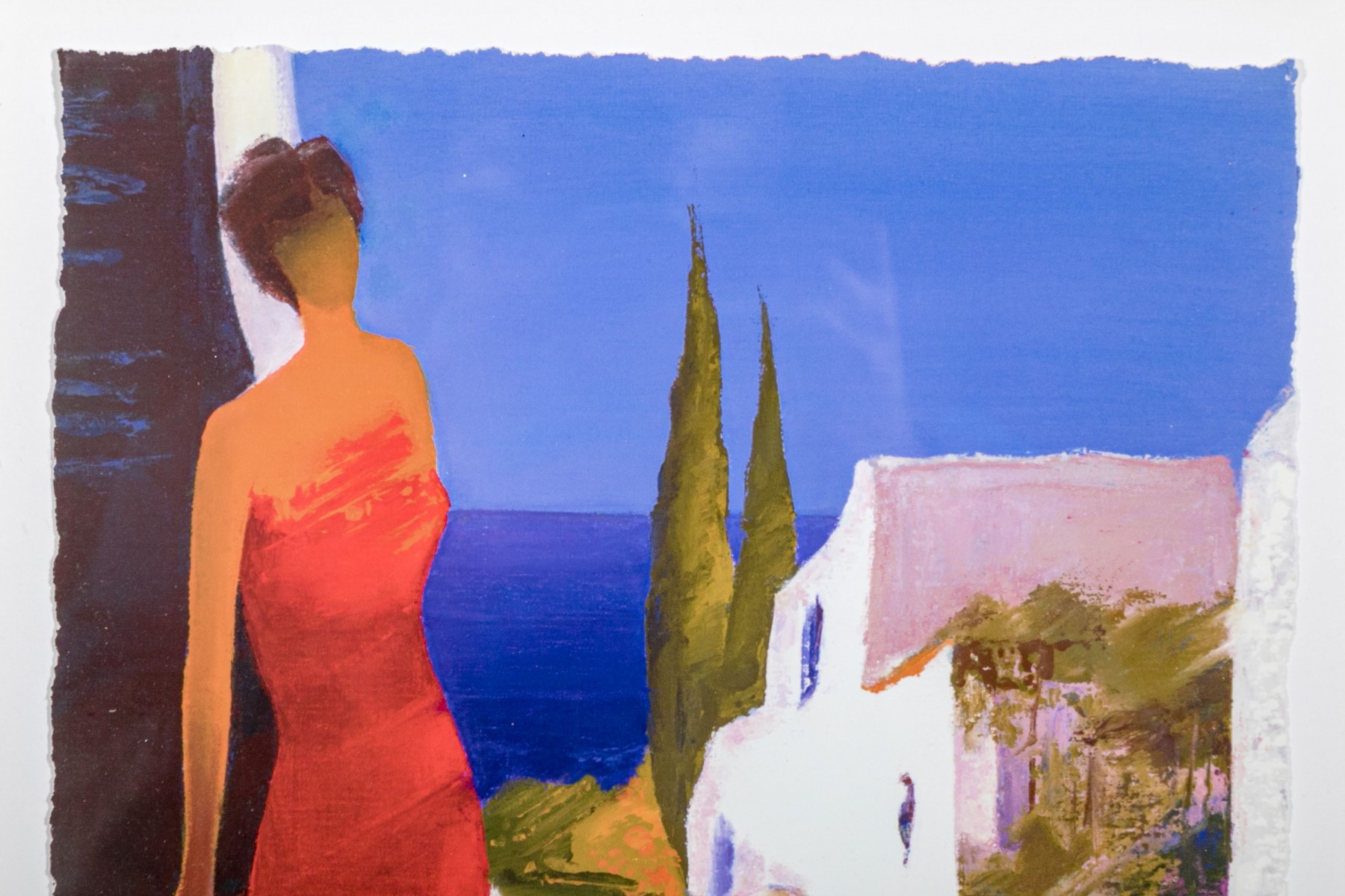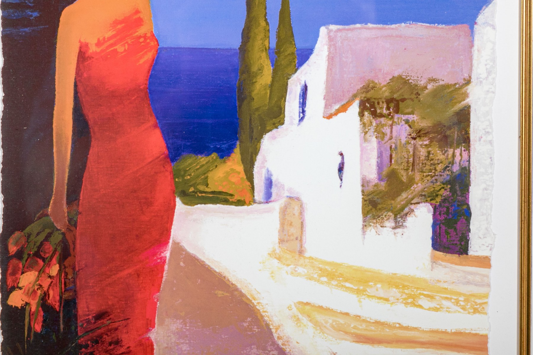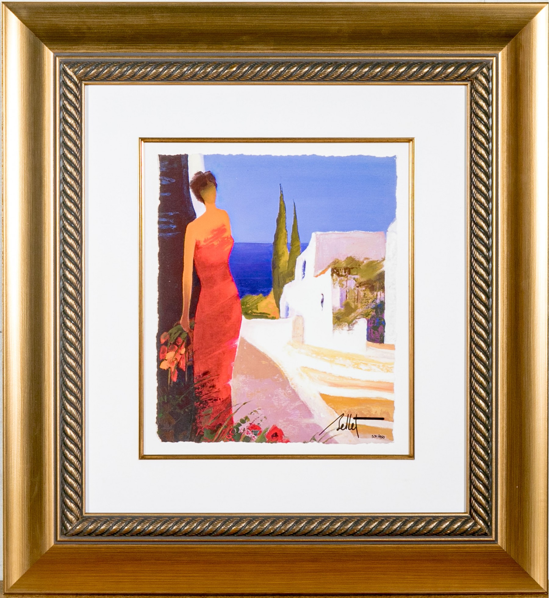 Signed and numbered 531/950 lower right. Label on verso, A beauty wearing a long red gown standing near white island houses. Presented in a deep gilt frame with glass.