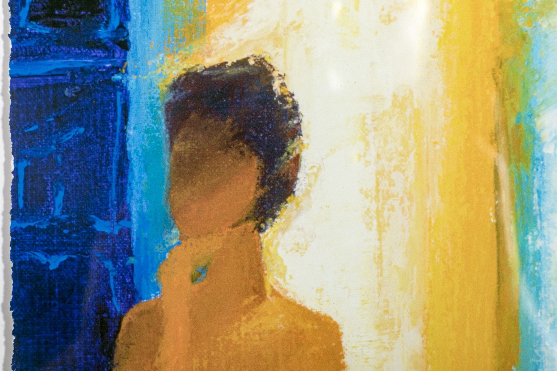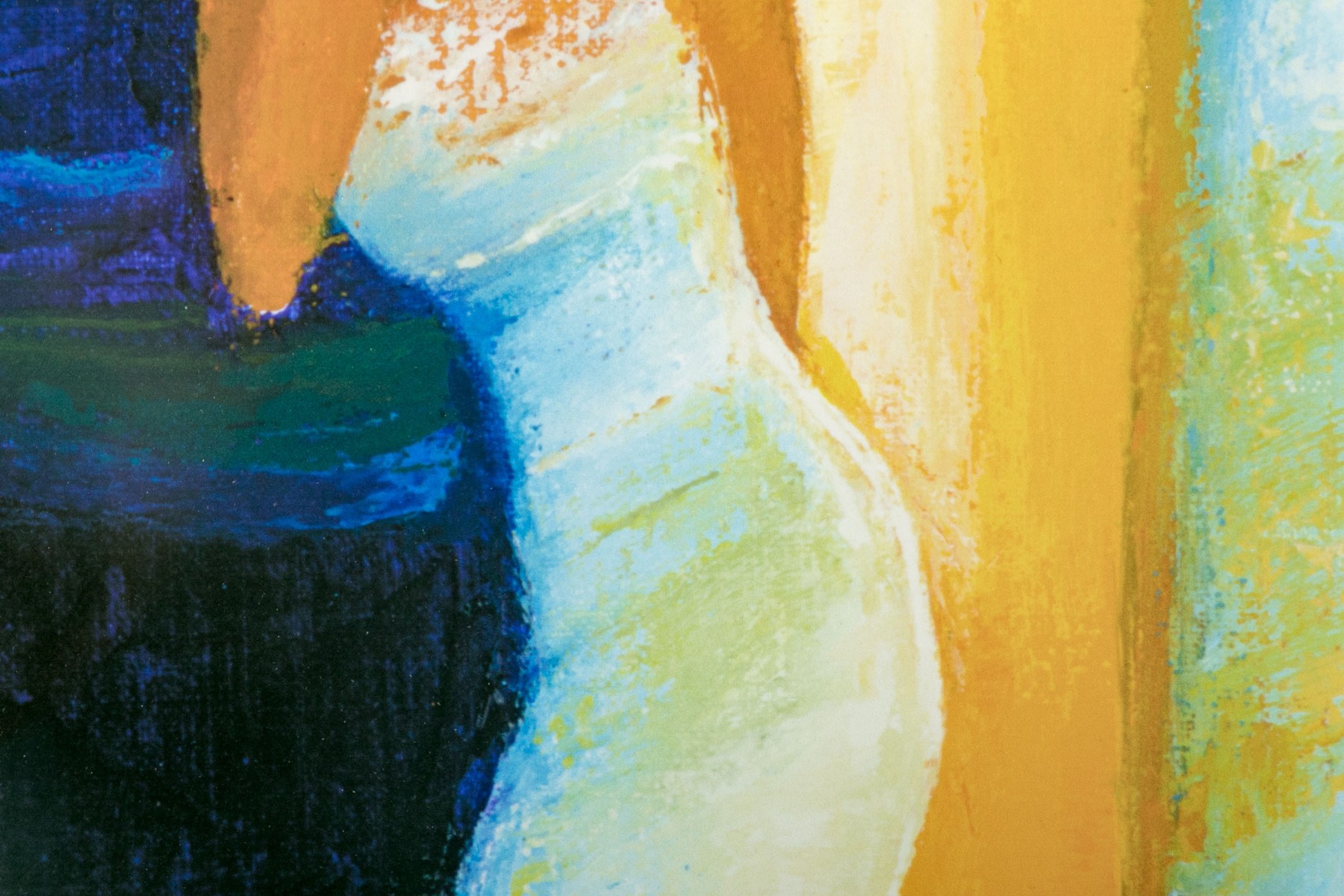 The second print with the beauty wearing a white and blue gown stands at intermission. Signed and numbered 516/950 below.
