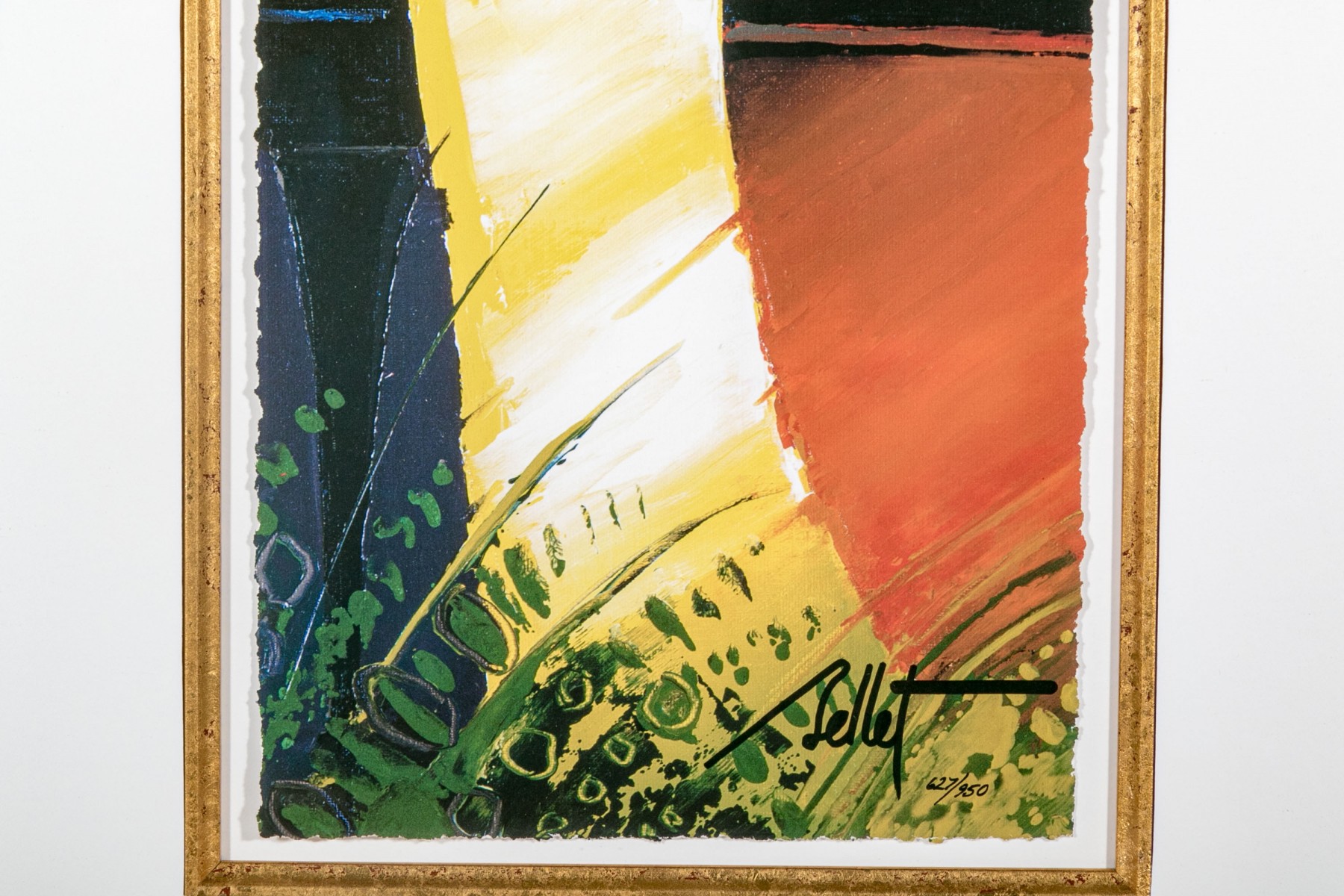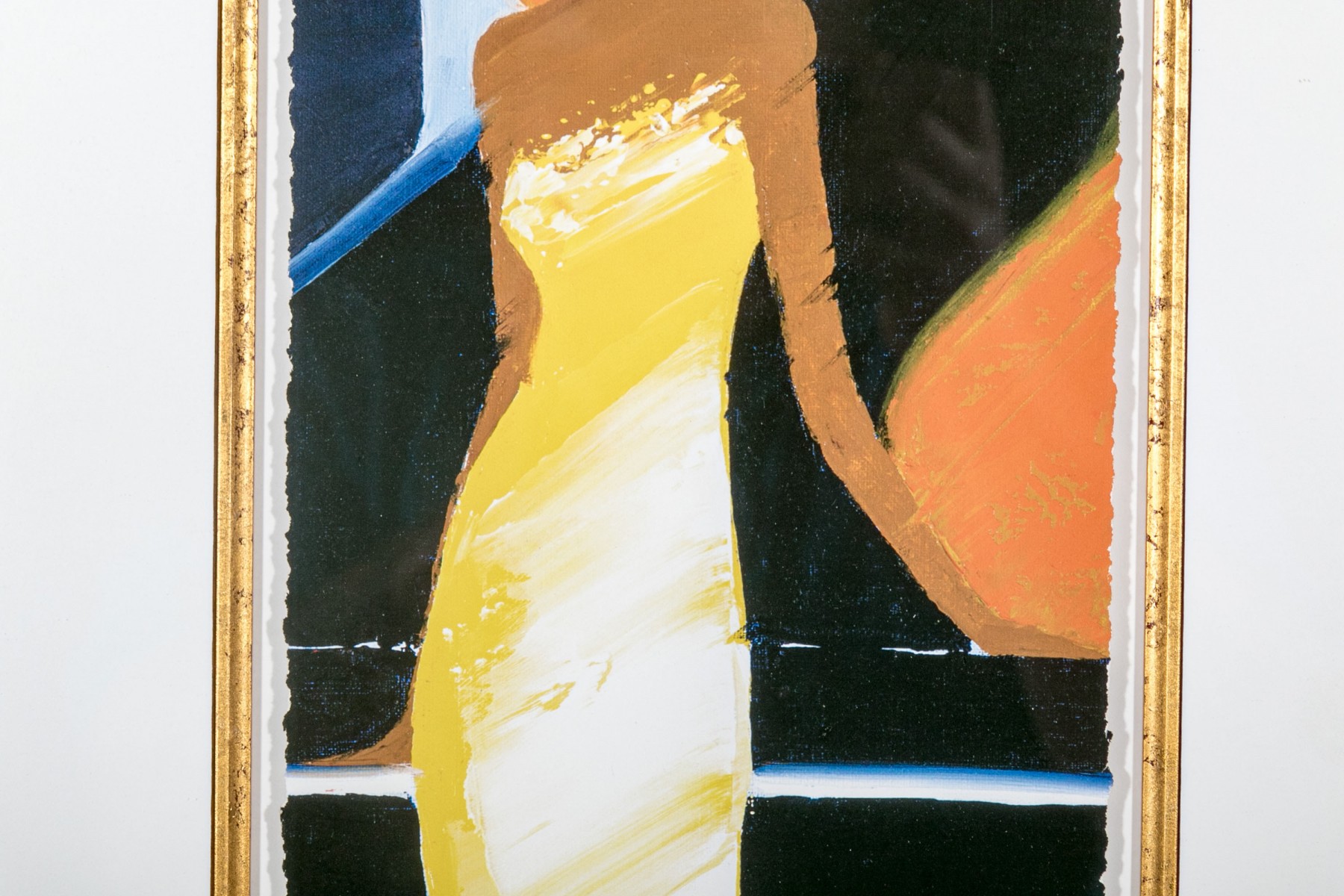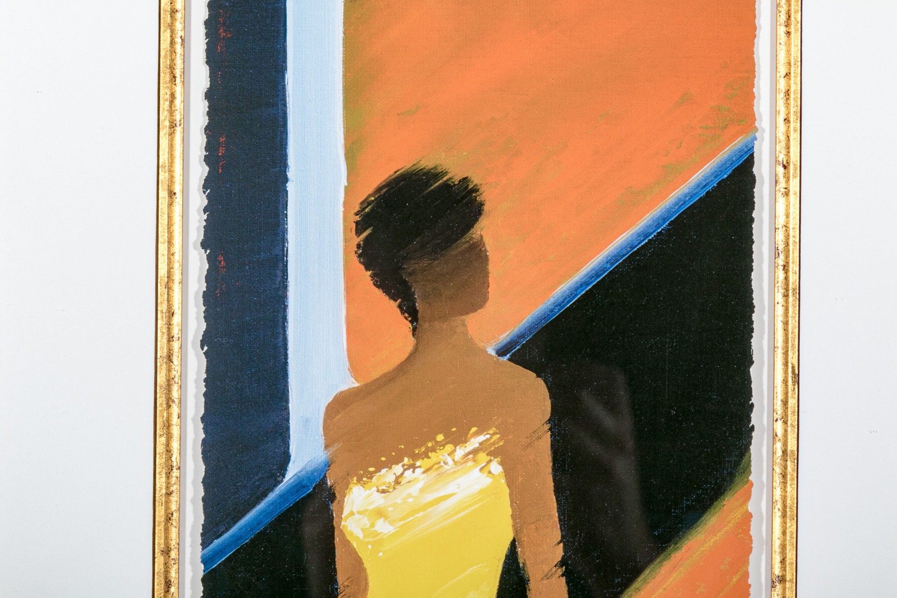 One signed and numbered 627/950 lower right. The beauty wearing a long white and yellow gown stands at the balcony at the theater.