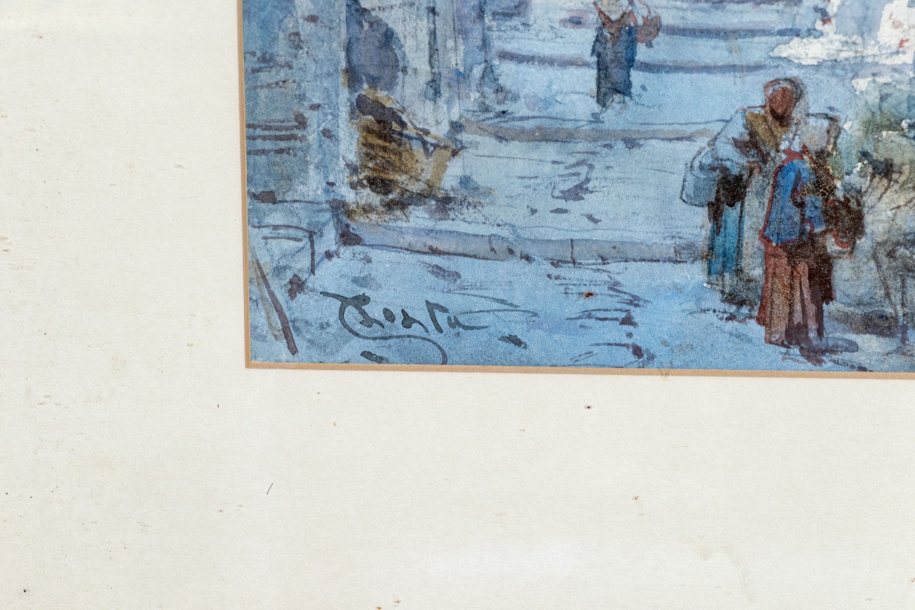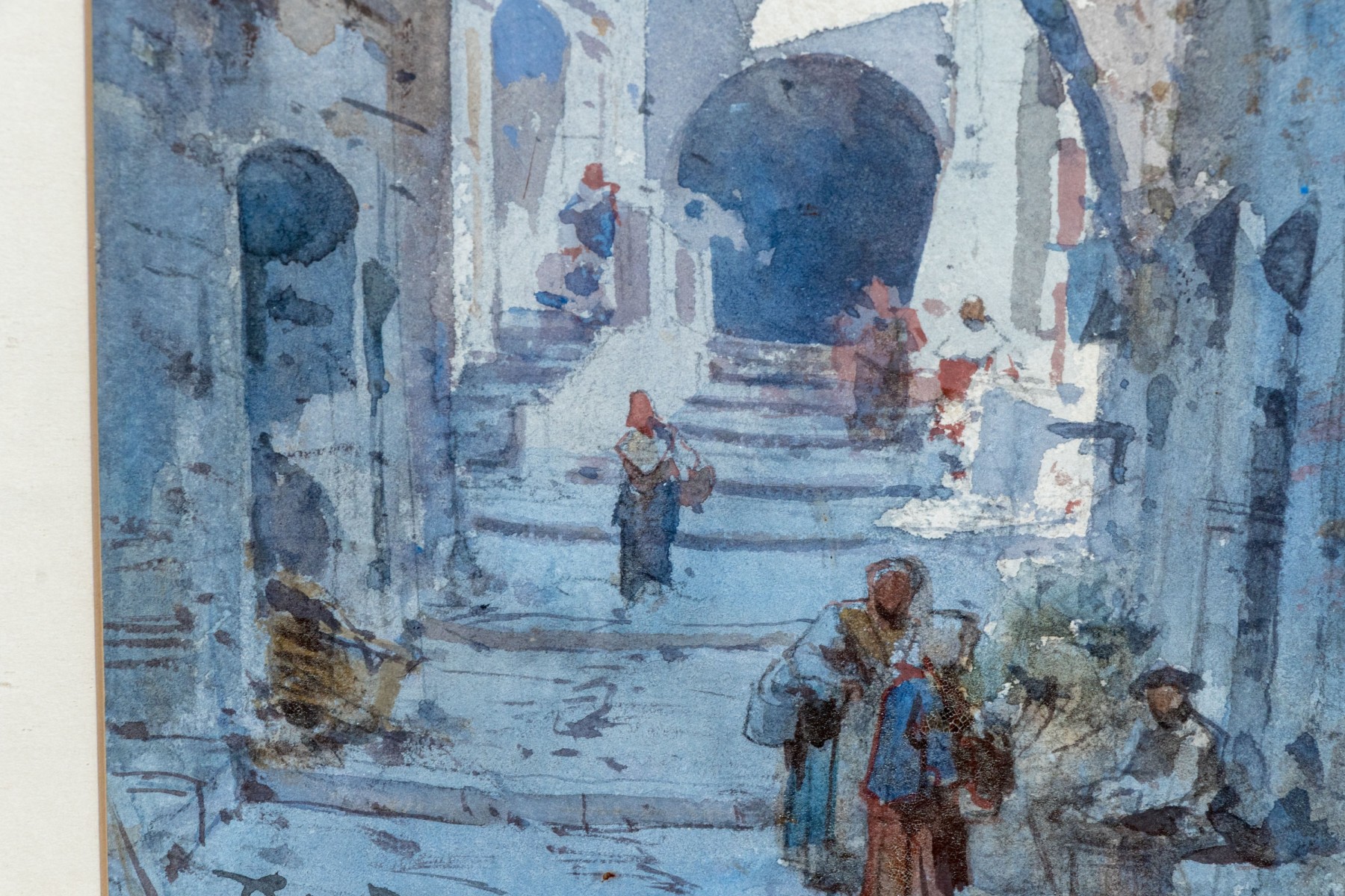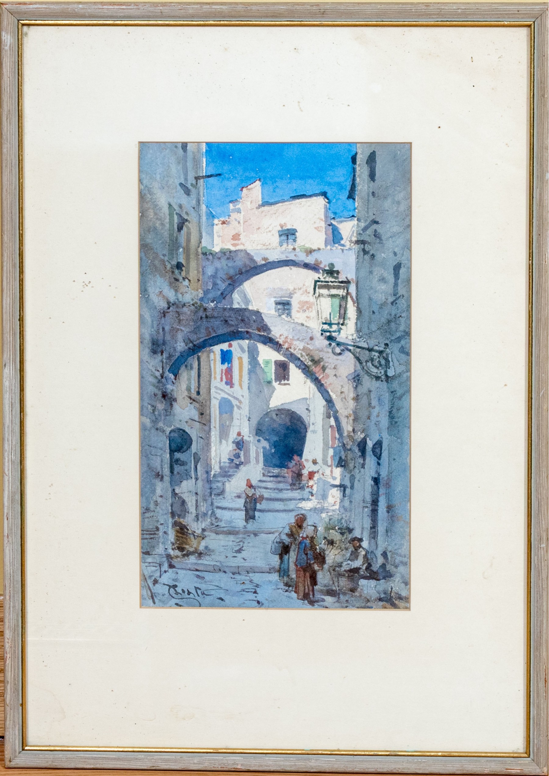 Emmanuel Costa (French, 1833-1921) gouache painting on heavy weight paper depicting a view of people gathered on a pathway with wide steps leading up towards an underpass. The pathway passes through two archways balancing horizontal and vertical elements of the composition. Beautifully rendered with rich color and an eye for form and shadow. Signed lower left.