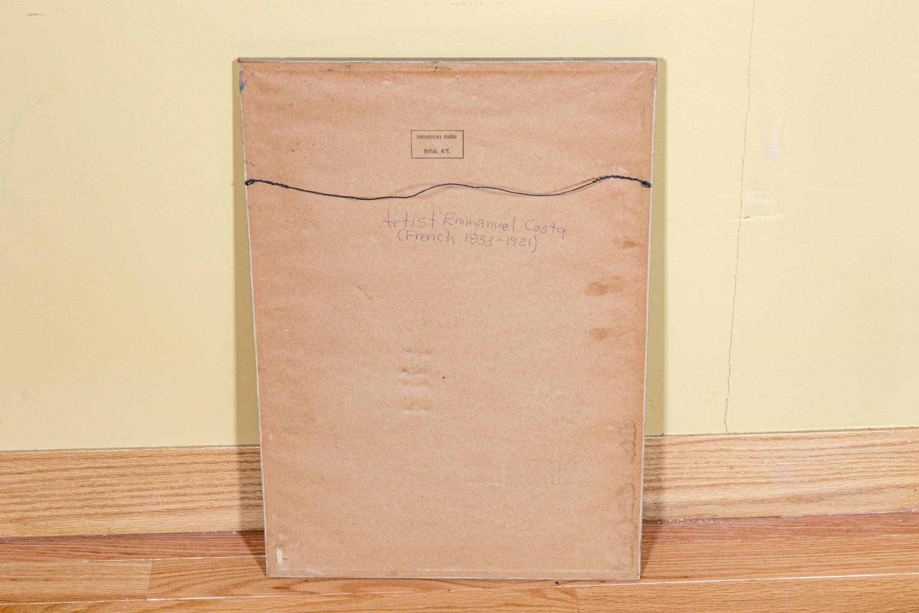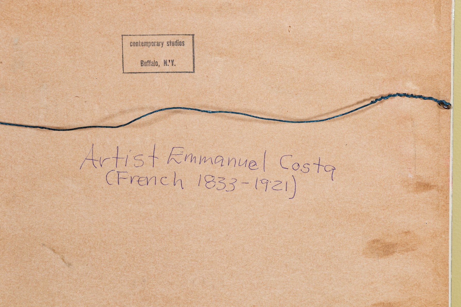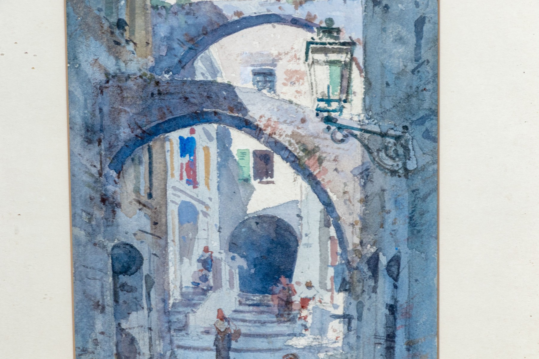 Emmanuel Costa (French, 1833-1921) gouache painting on heavy weight paper depicting a view of people gathered on a pathway with wide steps leading up towards an underpass. The pathway passes through two archways balancing horizontal and vertical elements of the composition. Beautifully rendered with rich color and an eye for form and shadow. Signed lower left.