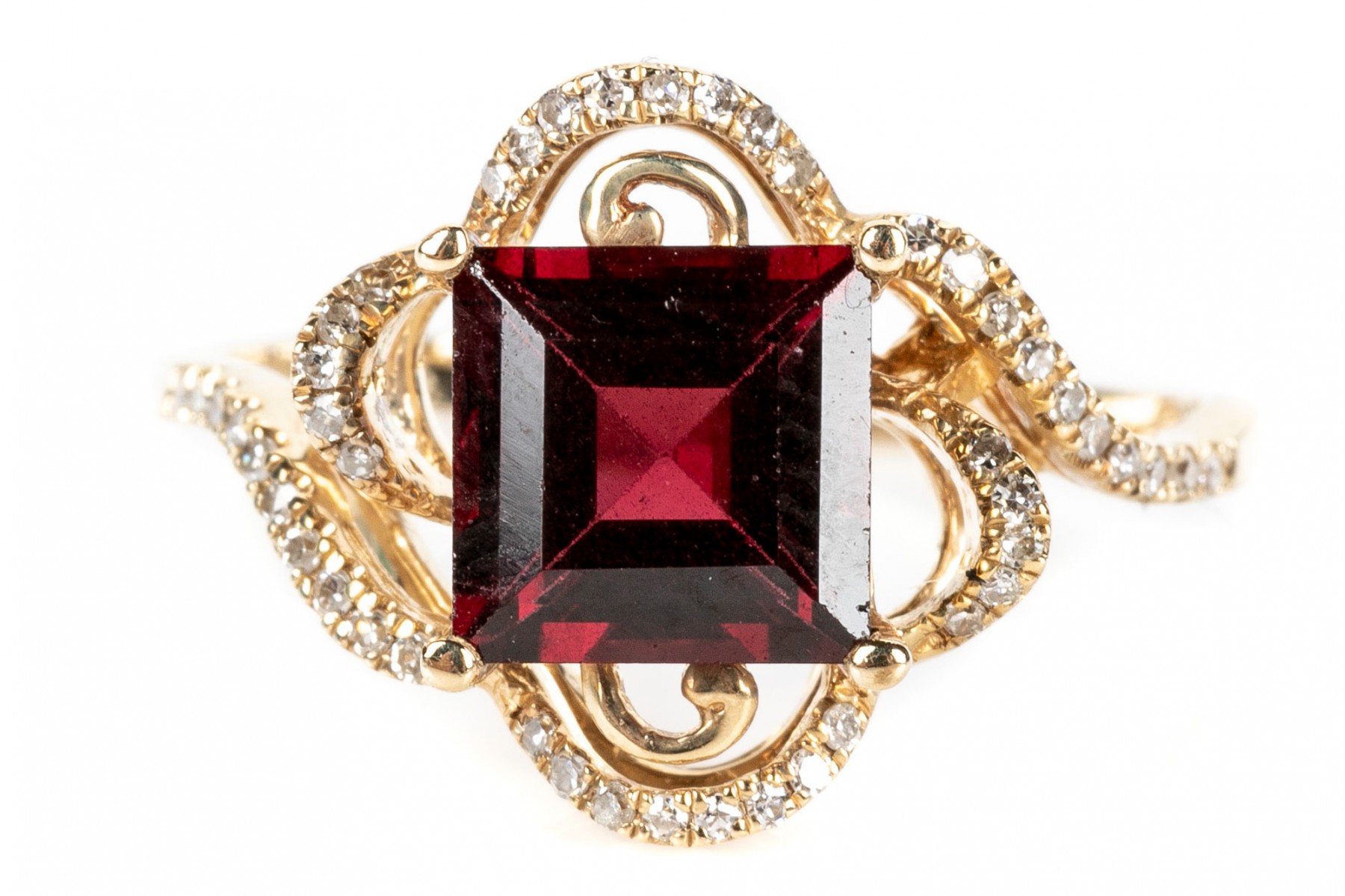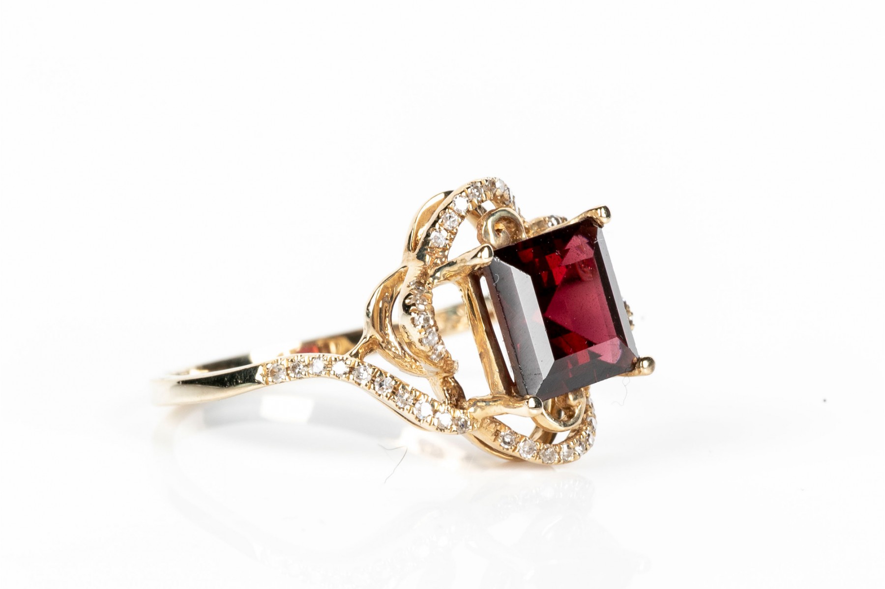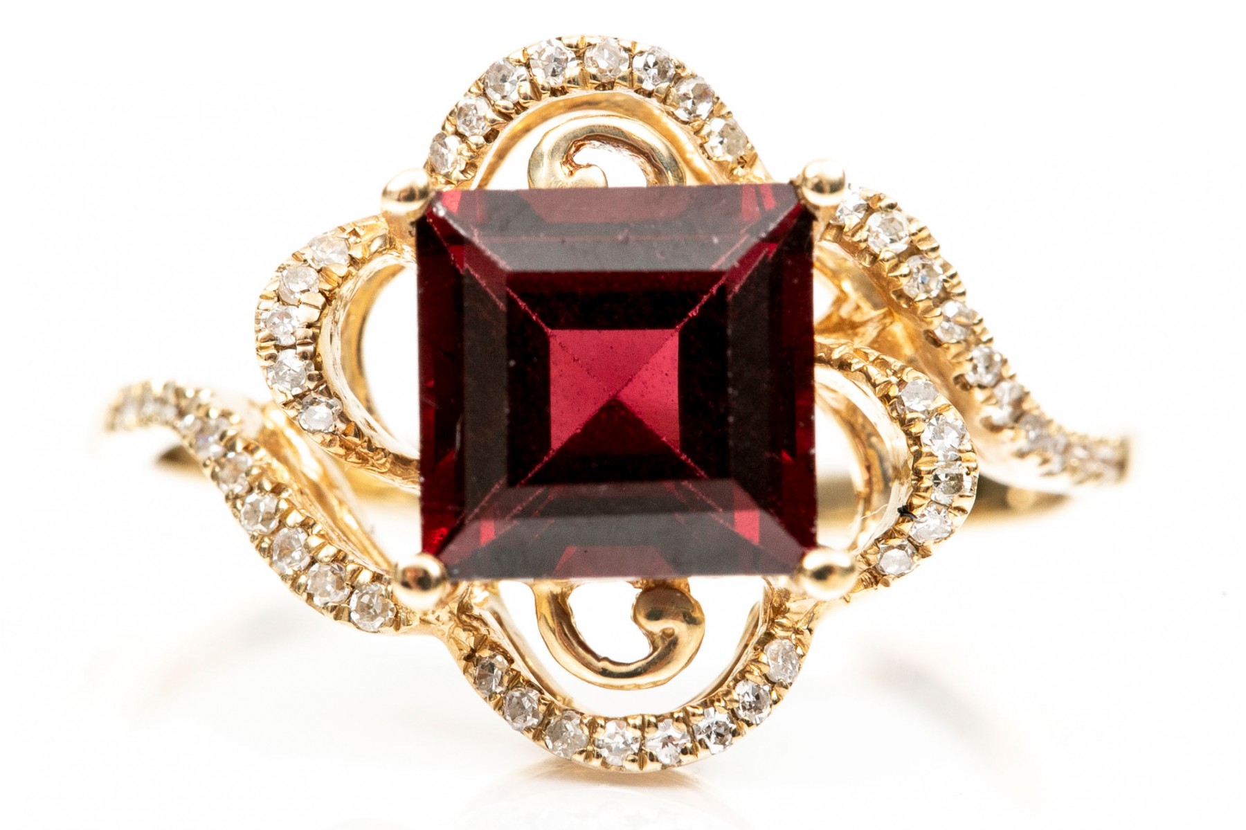 Enchanting 10K yellow gold ring featuring a single square cut garnet. Framing the garnet is an open scrolling frame of accent diamonds. The garnet is approximately 1.73 cts. Ring size 6.5+.
