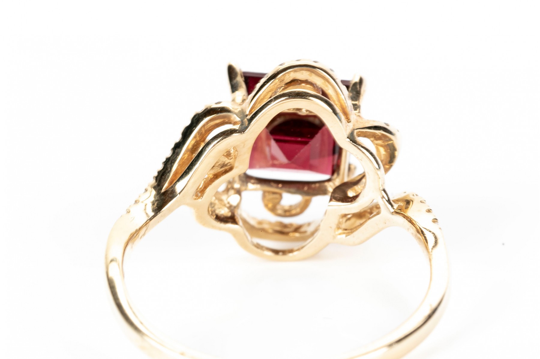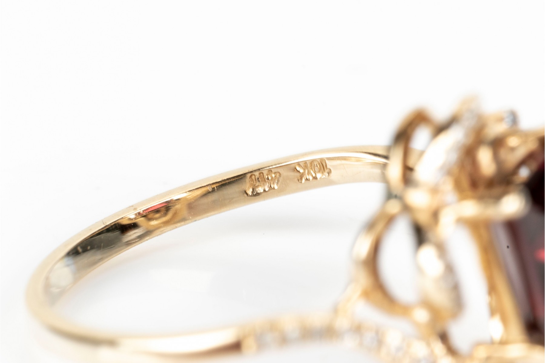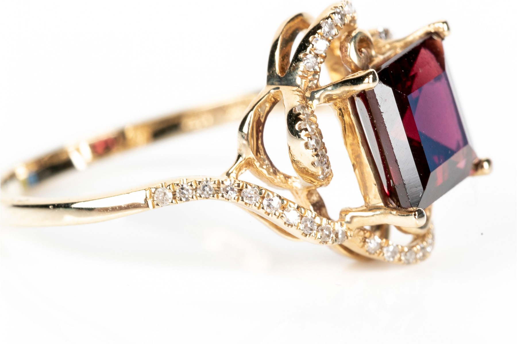 Enchanting 10K yellow gold ring featuring a single square cut garnet. Framing the garnet is an open scrolling frame of accent diamonds. The garnet is approximately 1.73 cts. Ring size 6.5+.