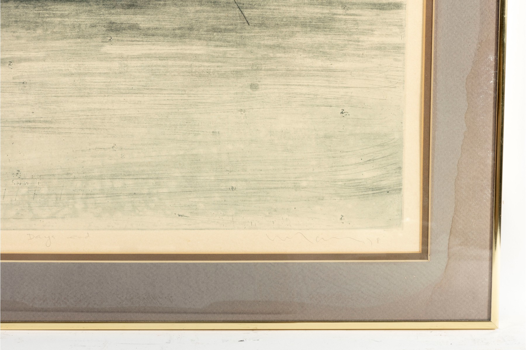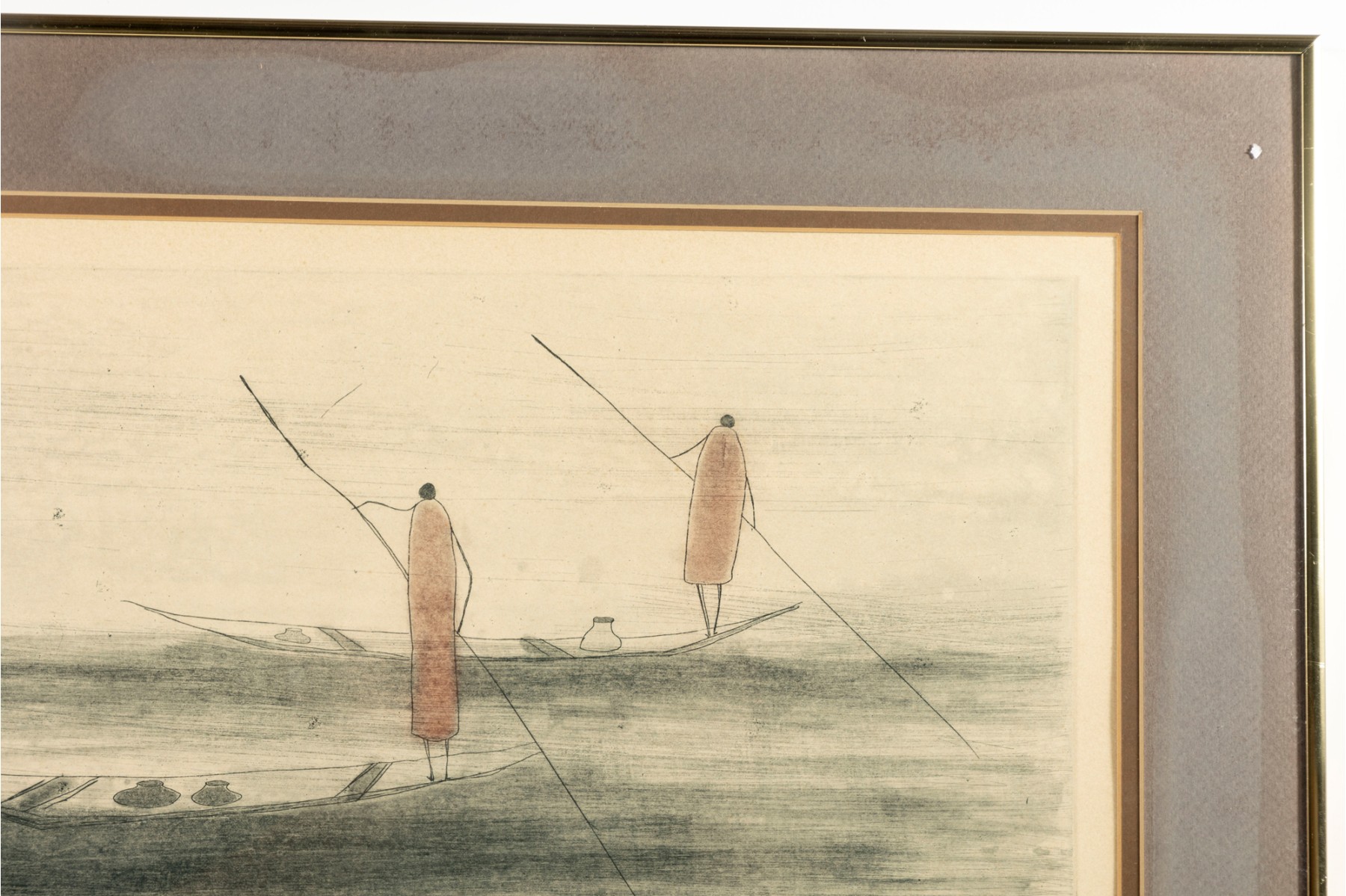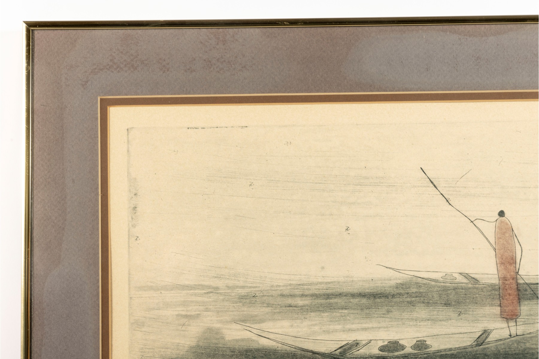 The piece is presented within a gold-tone metal frame, double-matted and faced with glass