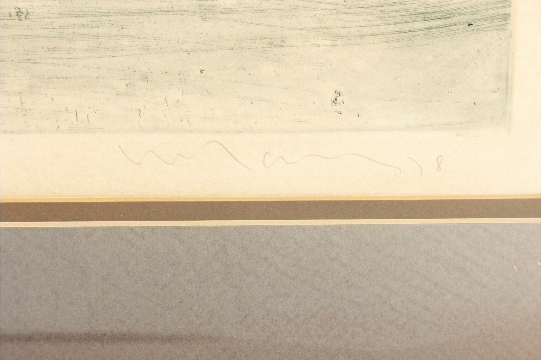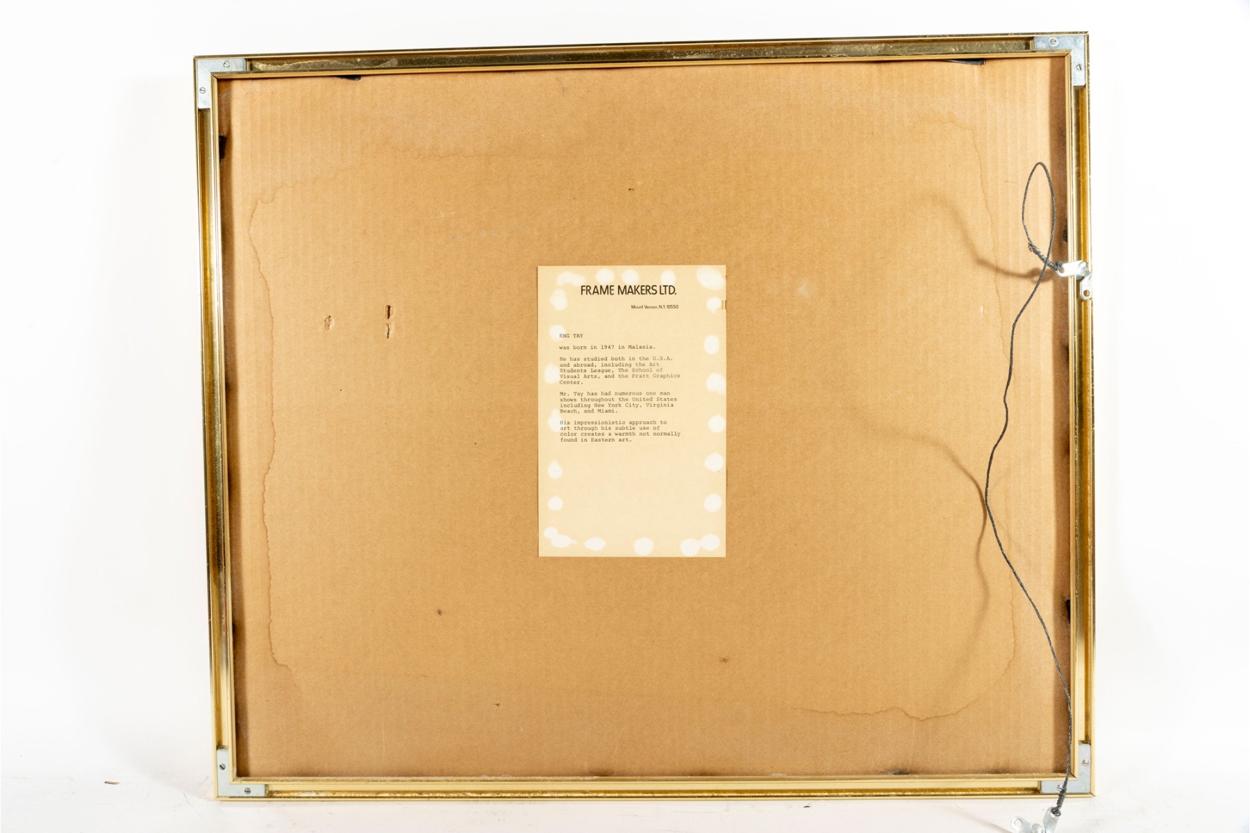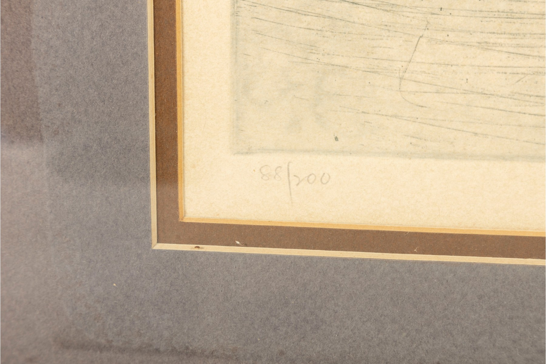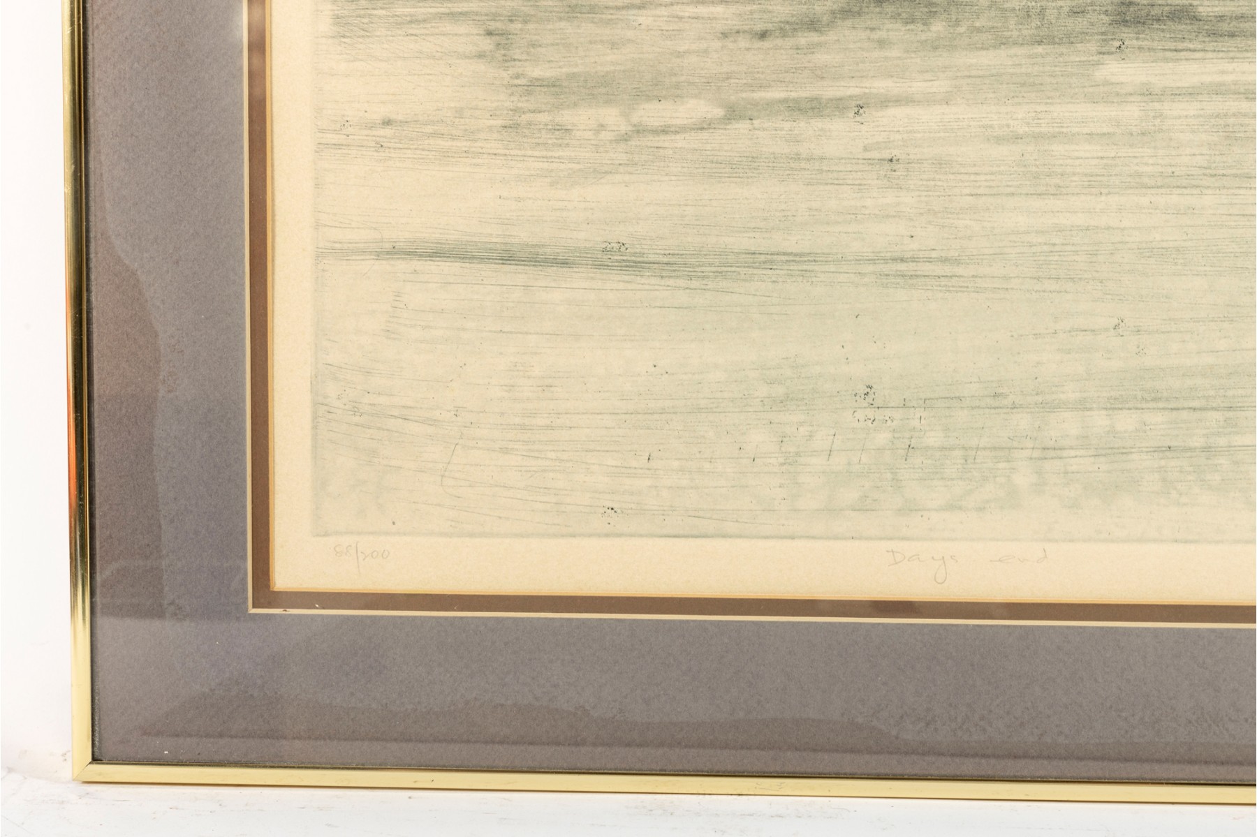 The piece is presented within a gold-tone metal frame, double-matted and faced with glass
