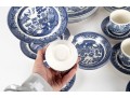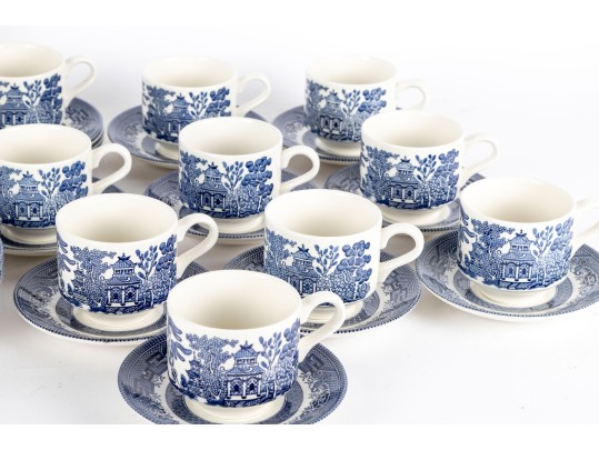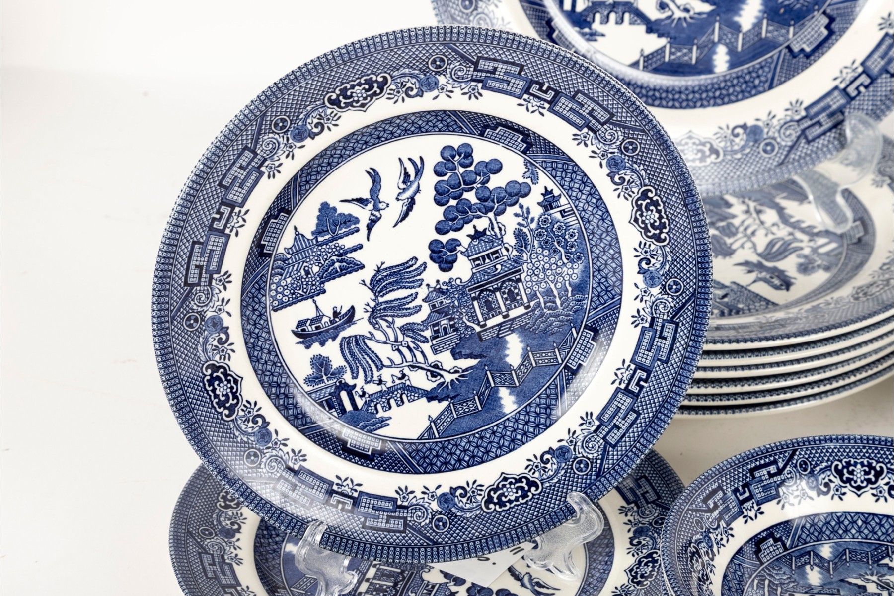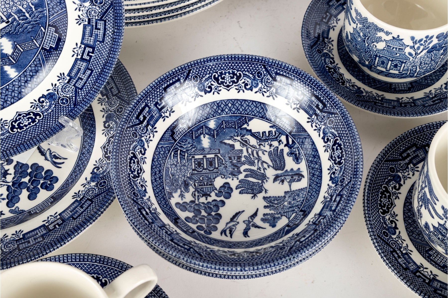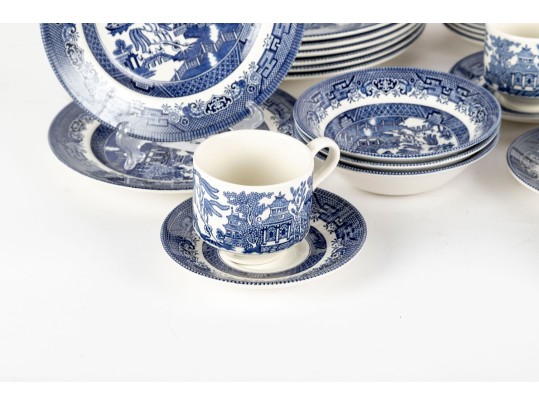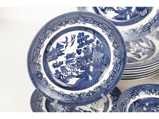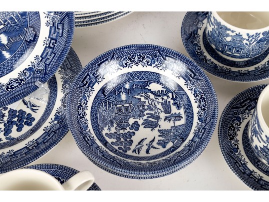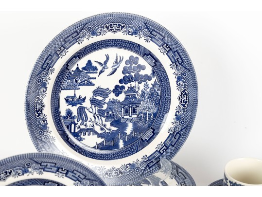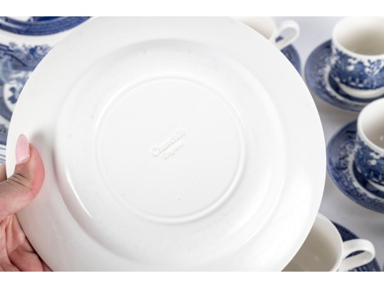 A wonderful collection of Churchill china with classic Blue Willow patterns depicting Asian architecture in natural landscapes with ornate geometric borders. Includes plates, coupe bowls, teacups and saucers.