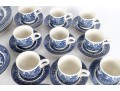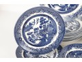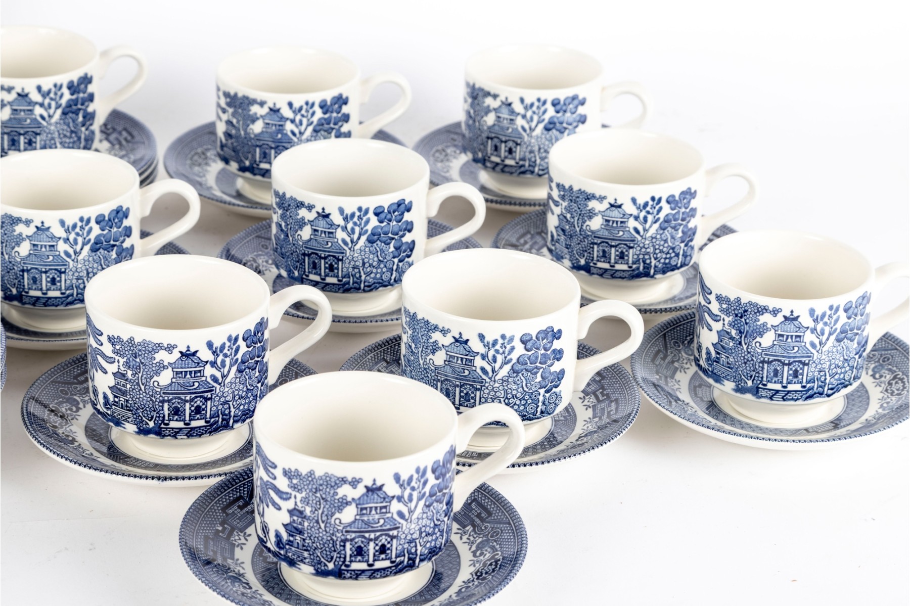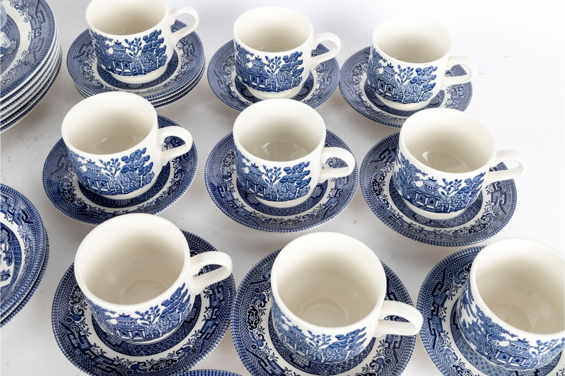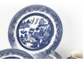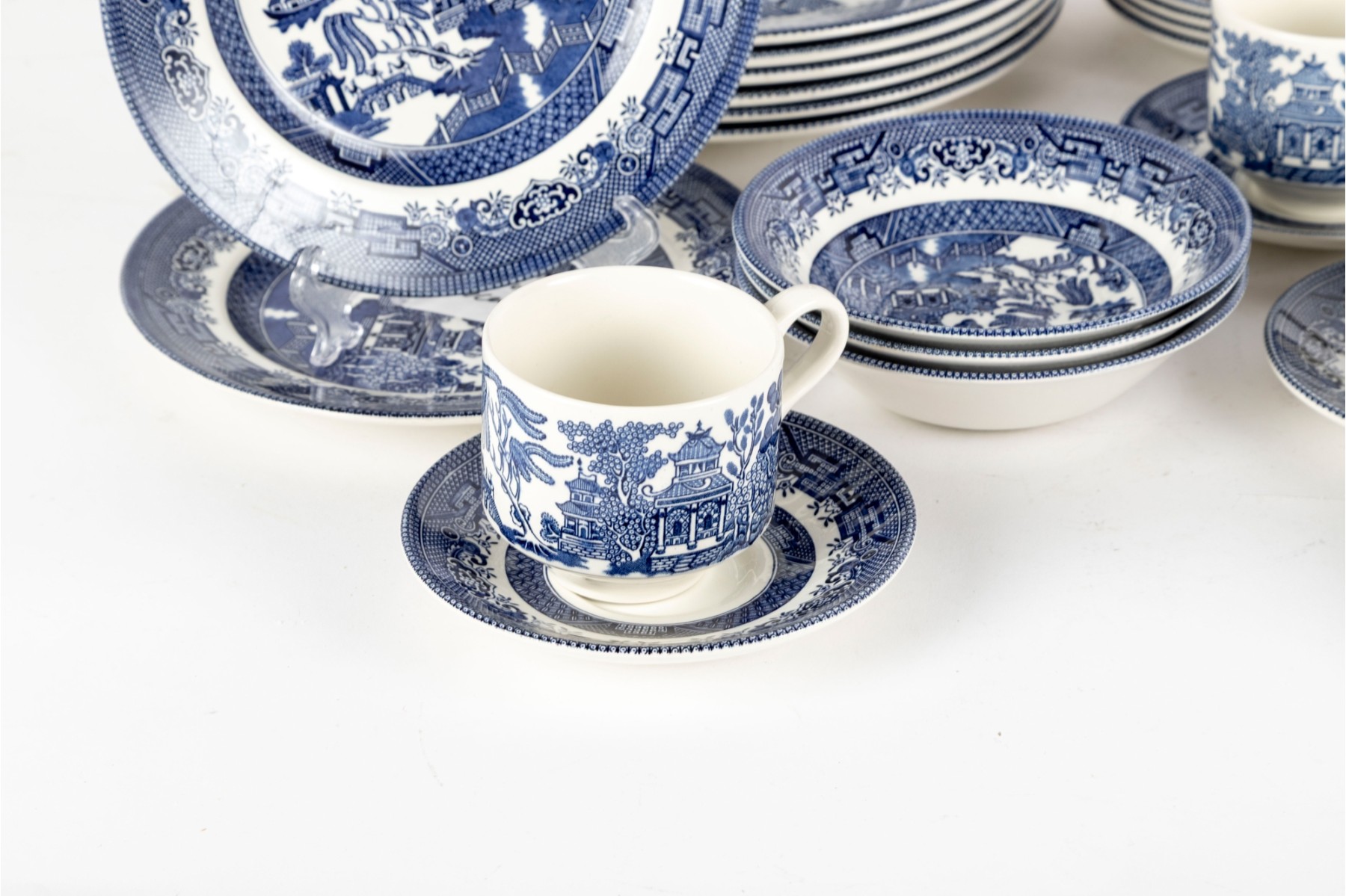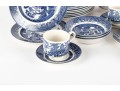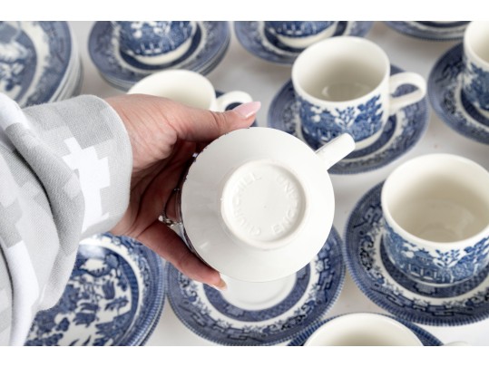 A wonderful collection of Churchill china with classic Blue Willow patterns depicting Asian architecture in natural landscapes with ornate geometric borders. Includes plates, coupe bowls, teacups and saucers.
