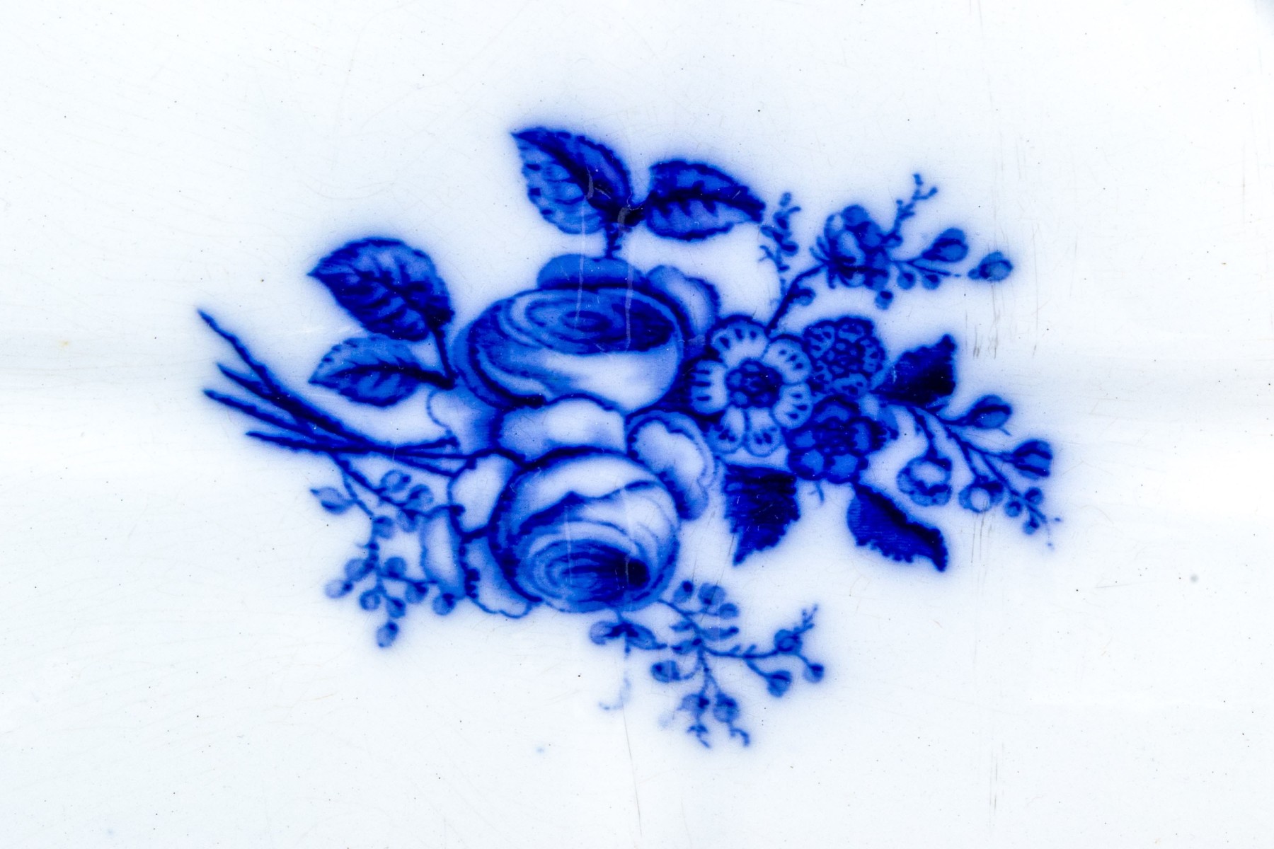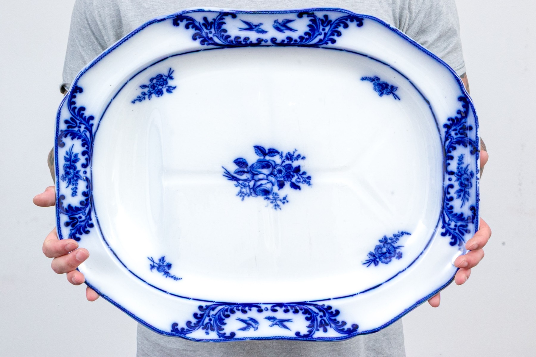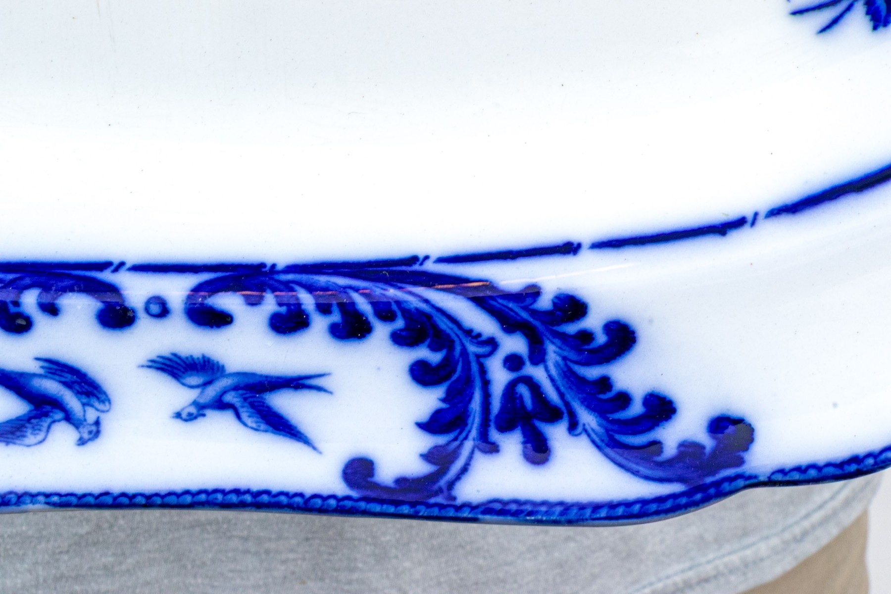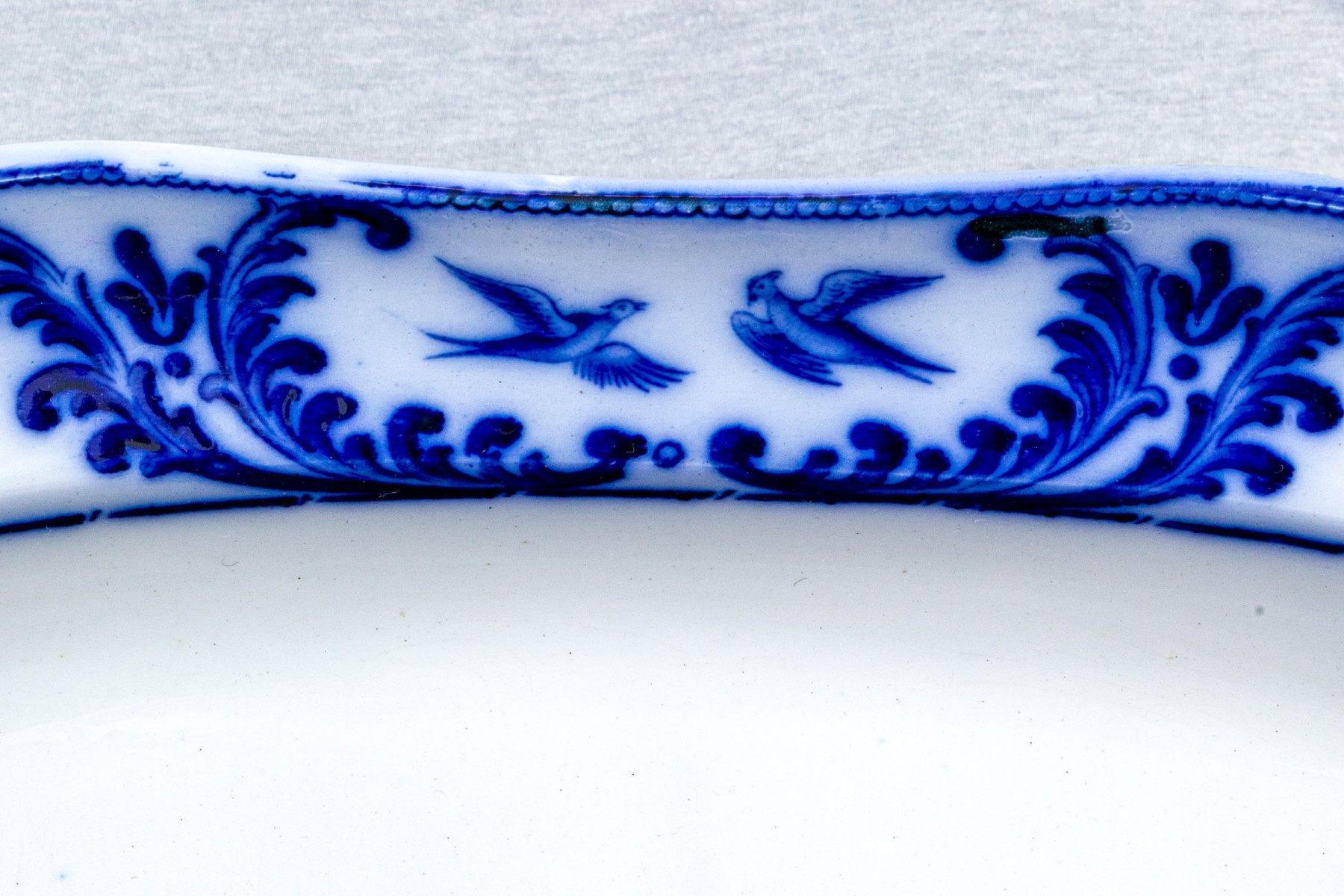 A gorgeous Copeland ceramic meat serving platter in bright white with vibrant monochromatic blue transferware foliate scrolls with birds and floral sprays. Detailed with a recessed vein pattern across the center and additional floral sprays. Finished with a three quarter foot underneath.