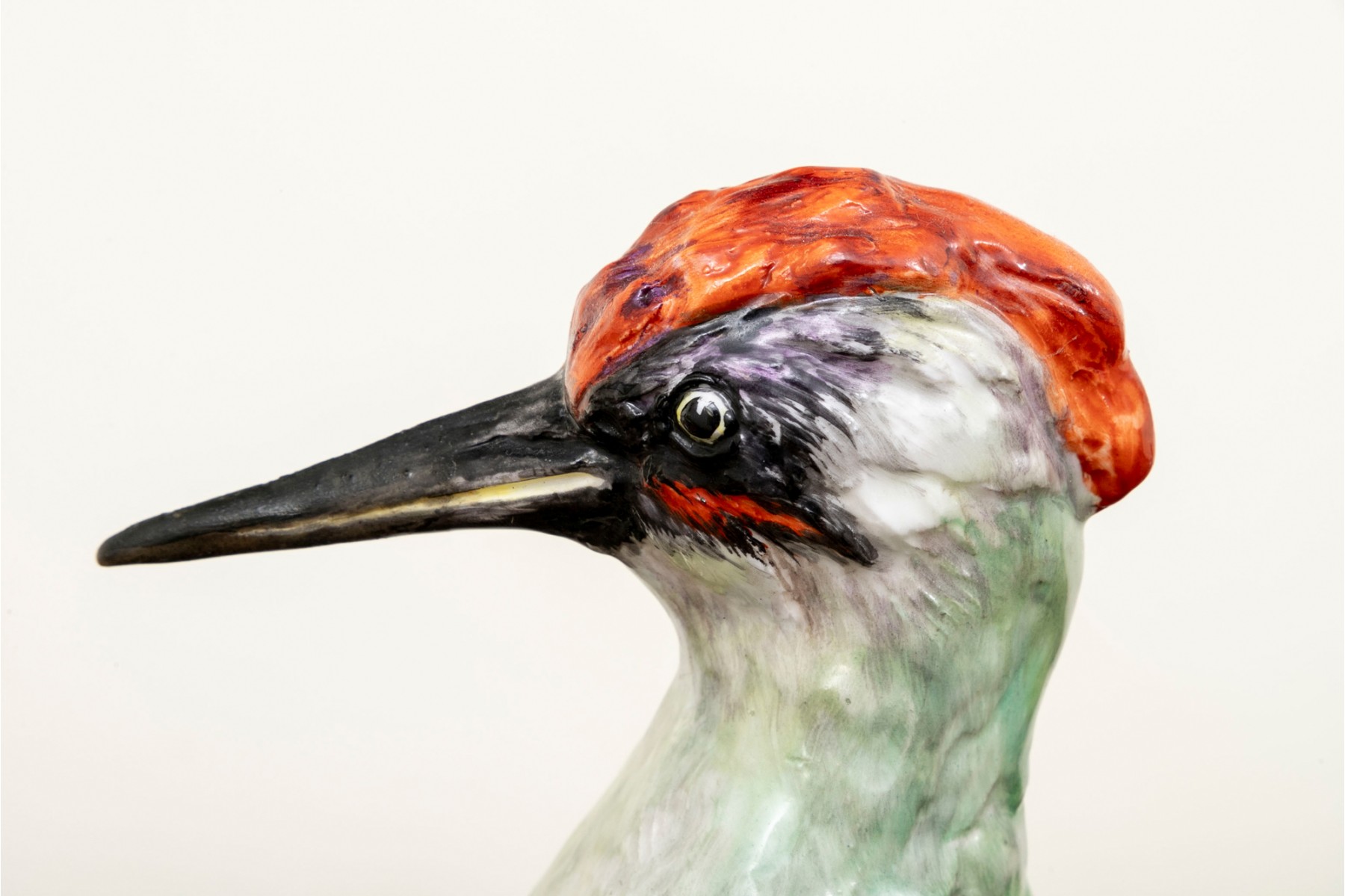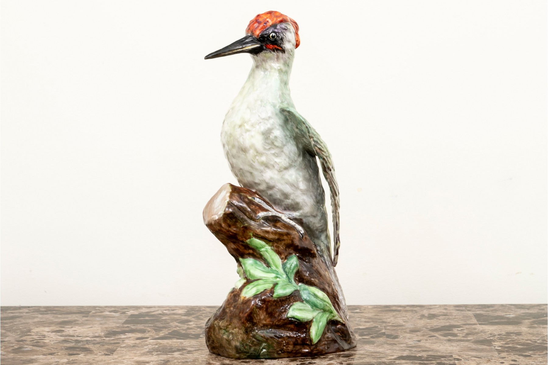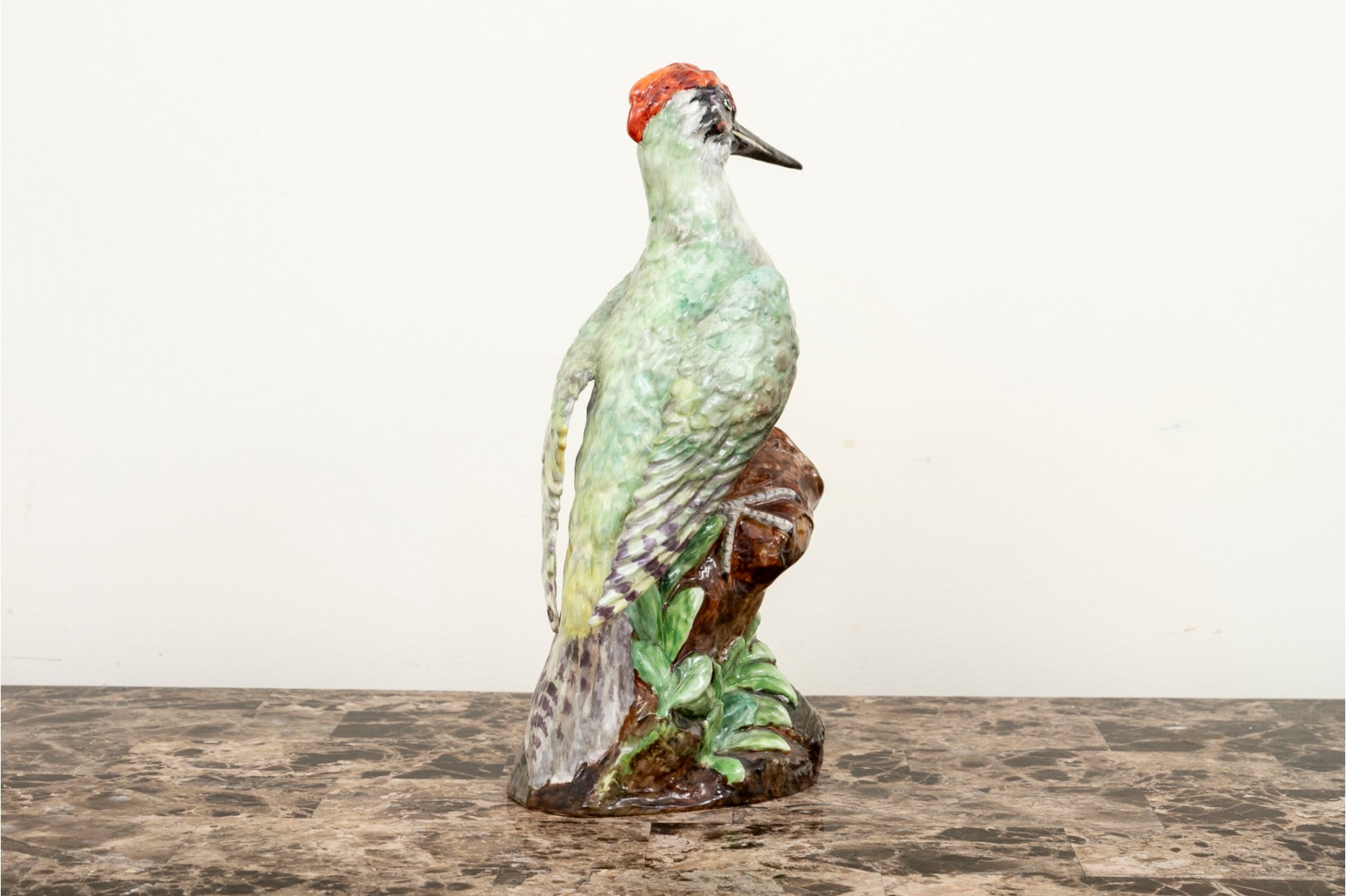 Fantastic, naturalistically moulded and hand painted ceramic woodpecker with its characteristic long beak, displayed perched on a tree trunk form perch with green leaves for added naturalism.