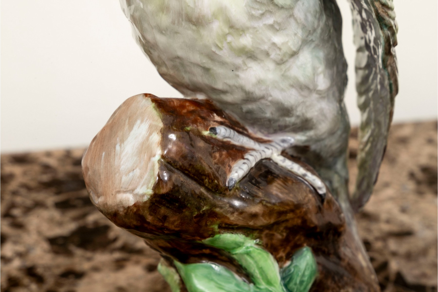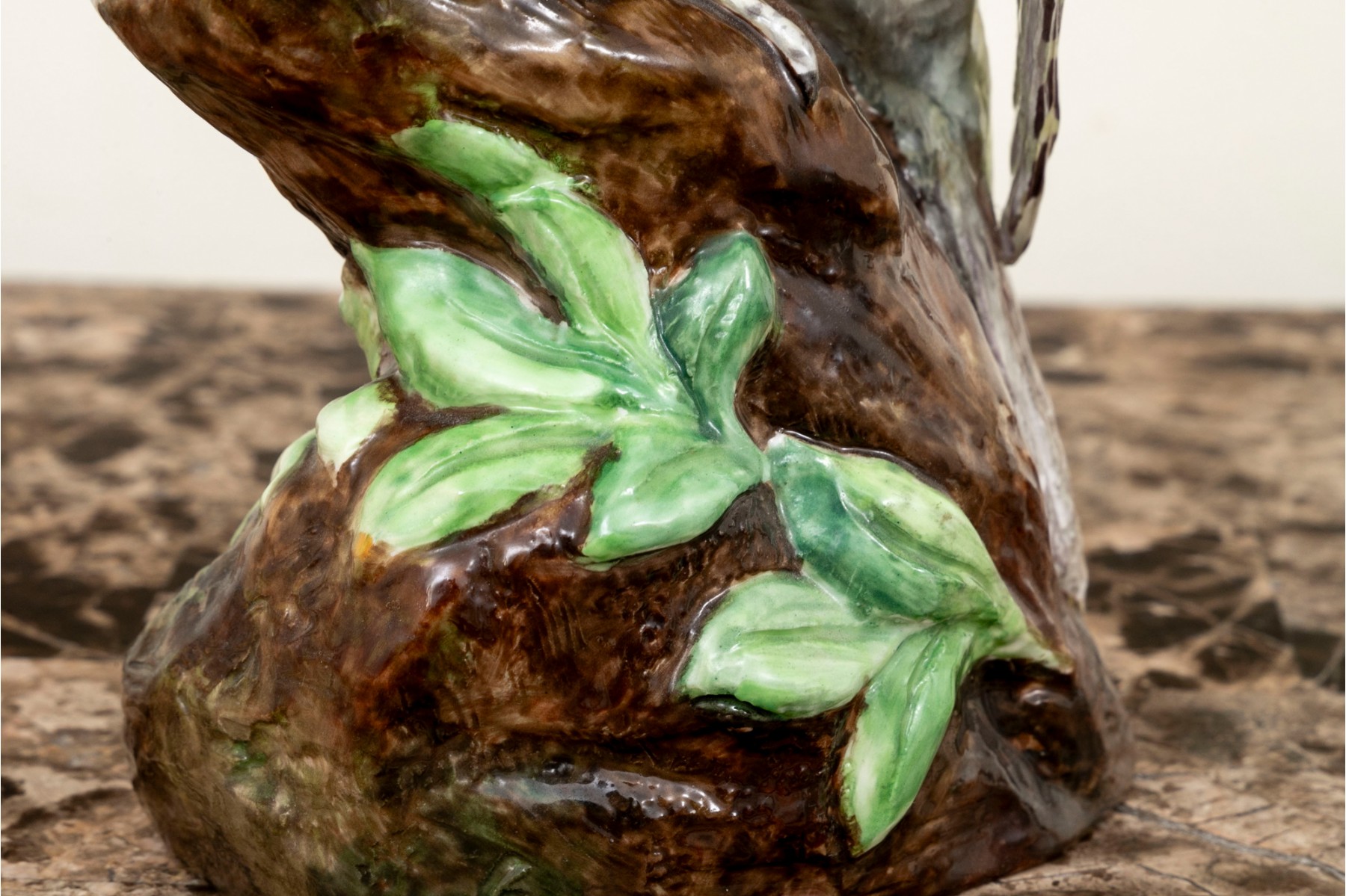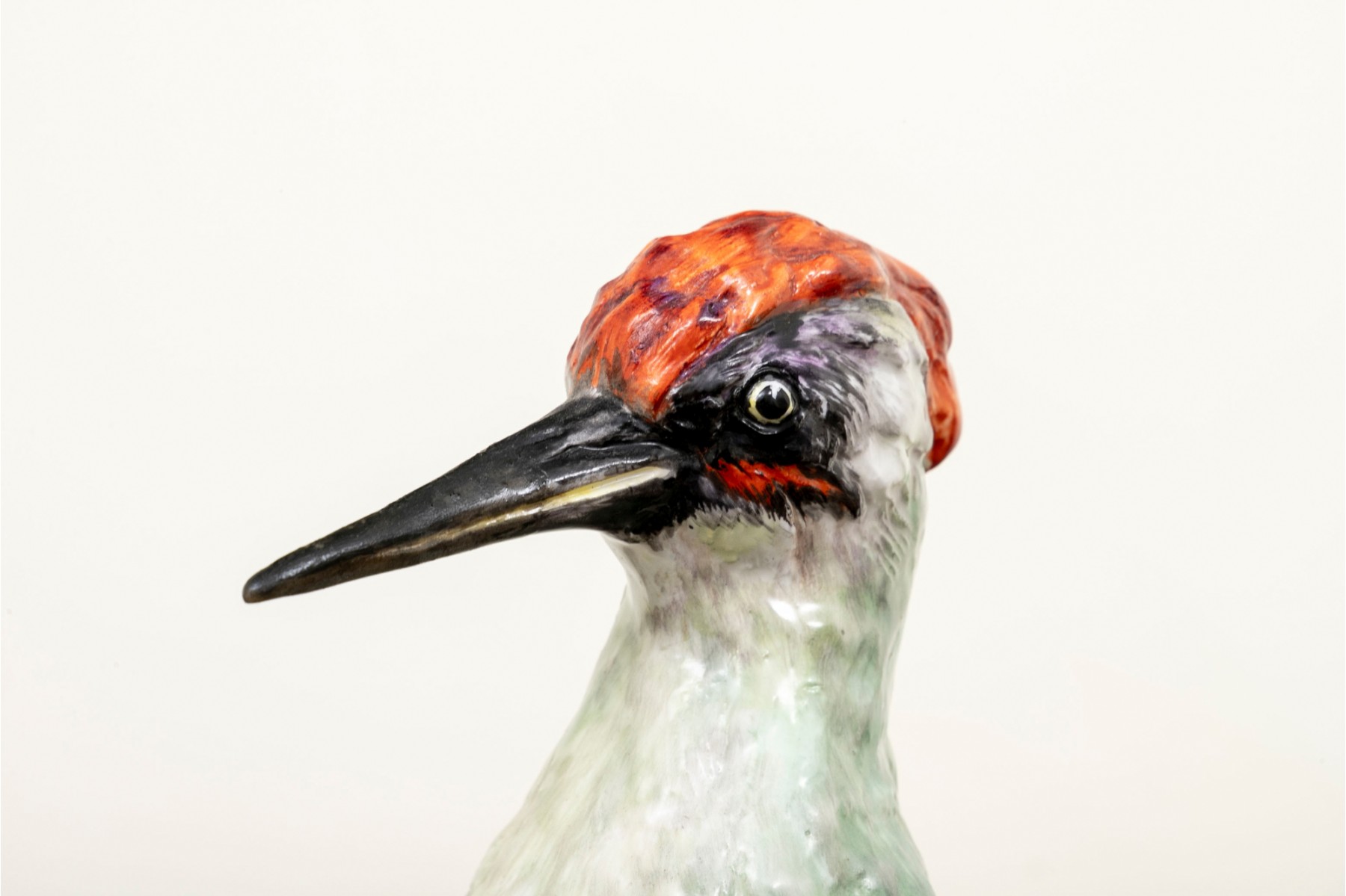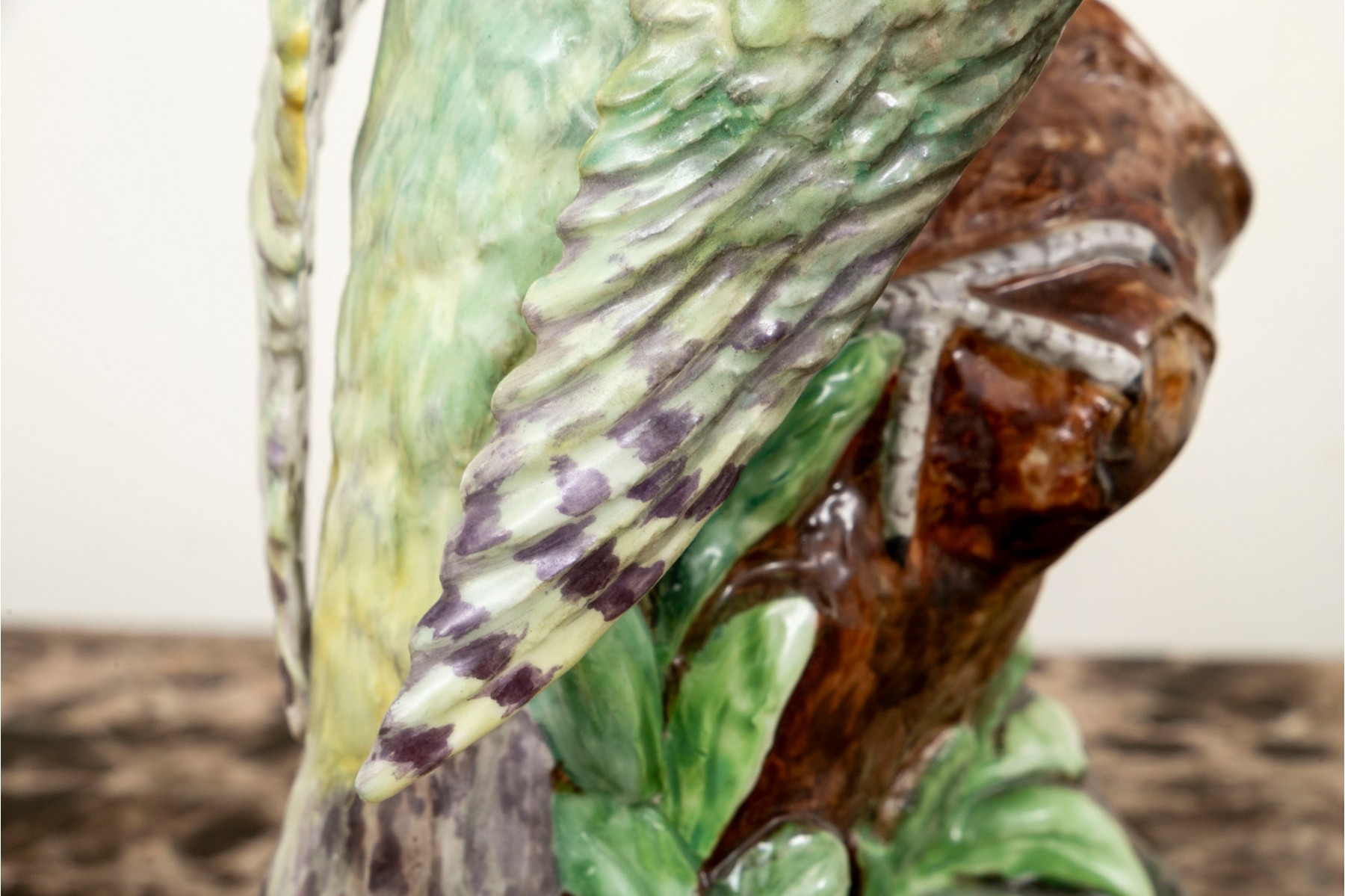 Fantastic, naturalistically moulded and hand painted ceramic woodpecker with its characteristic long beak, displayed perched on a tree trunk form perch with green leaves for added naturalism.