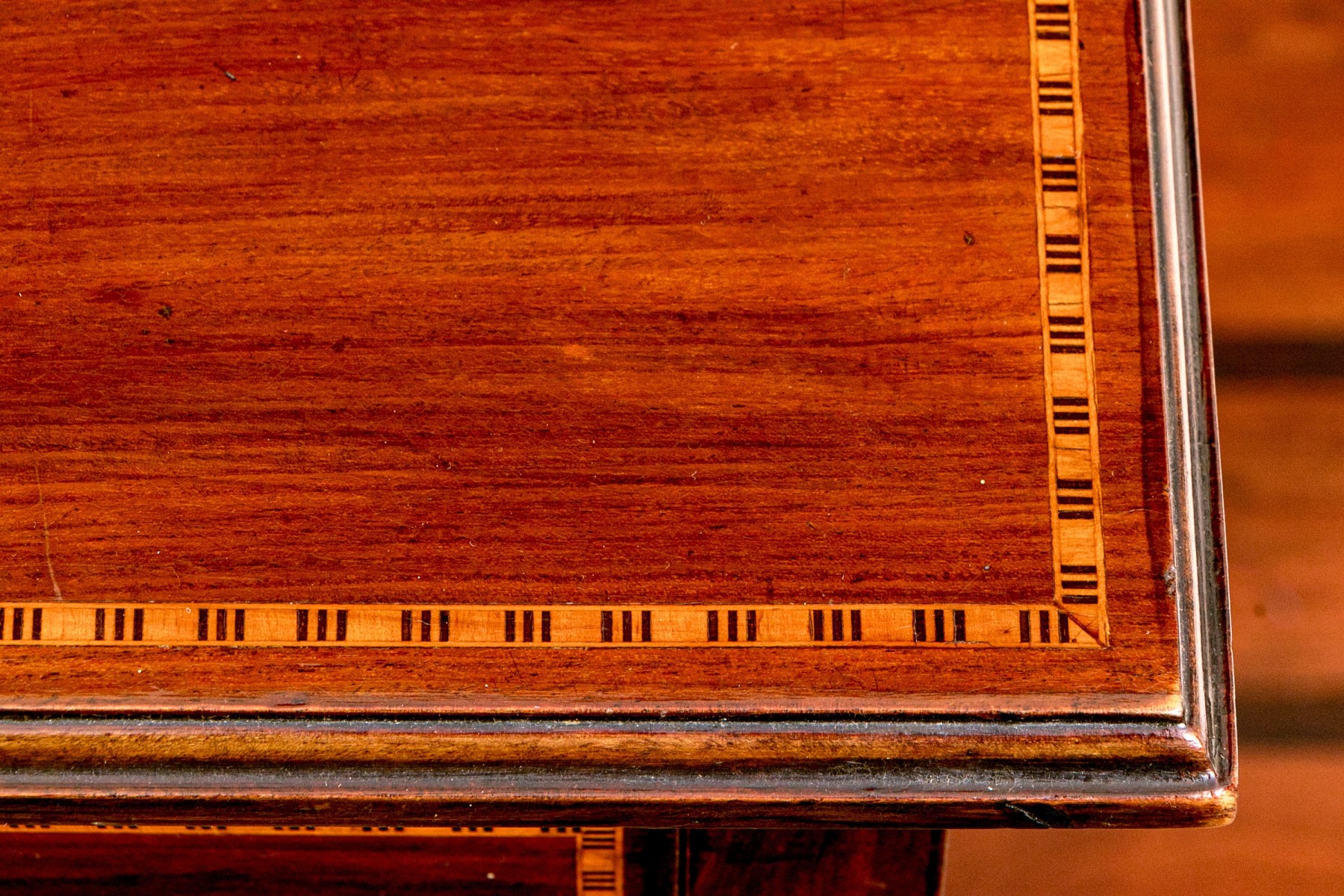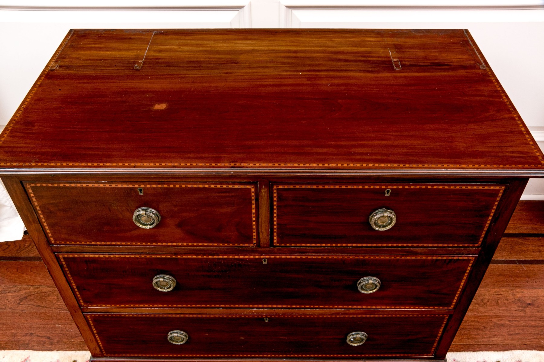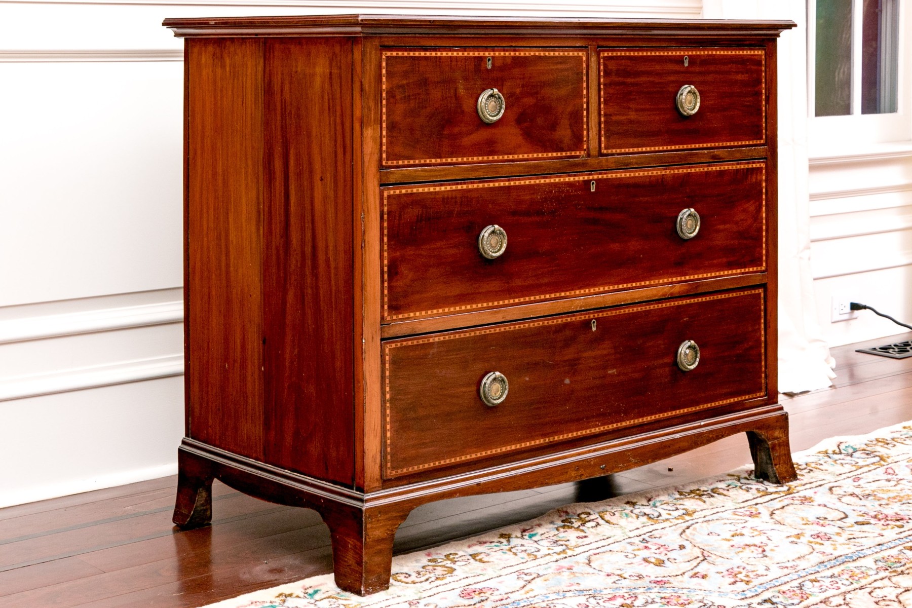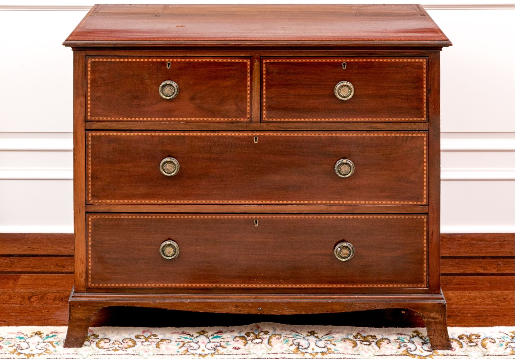 Drawers with marquetry trim tabs. On four carved legs. Brass drawer pulls.
