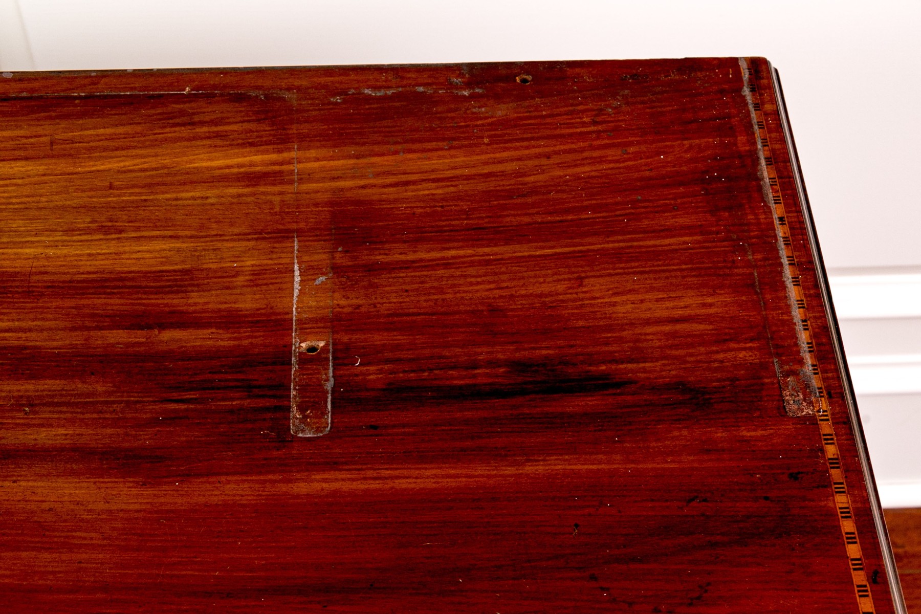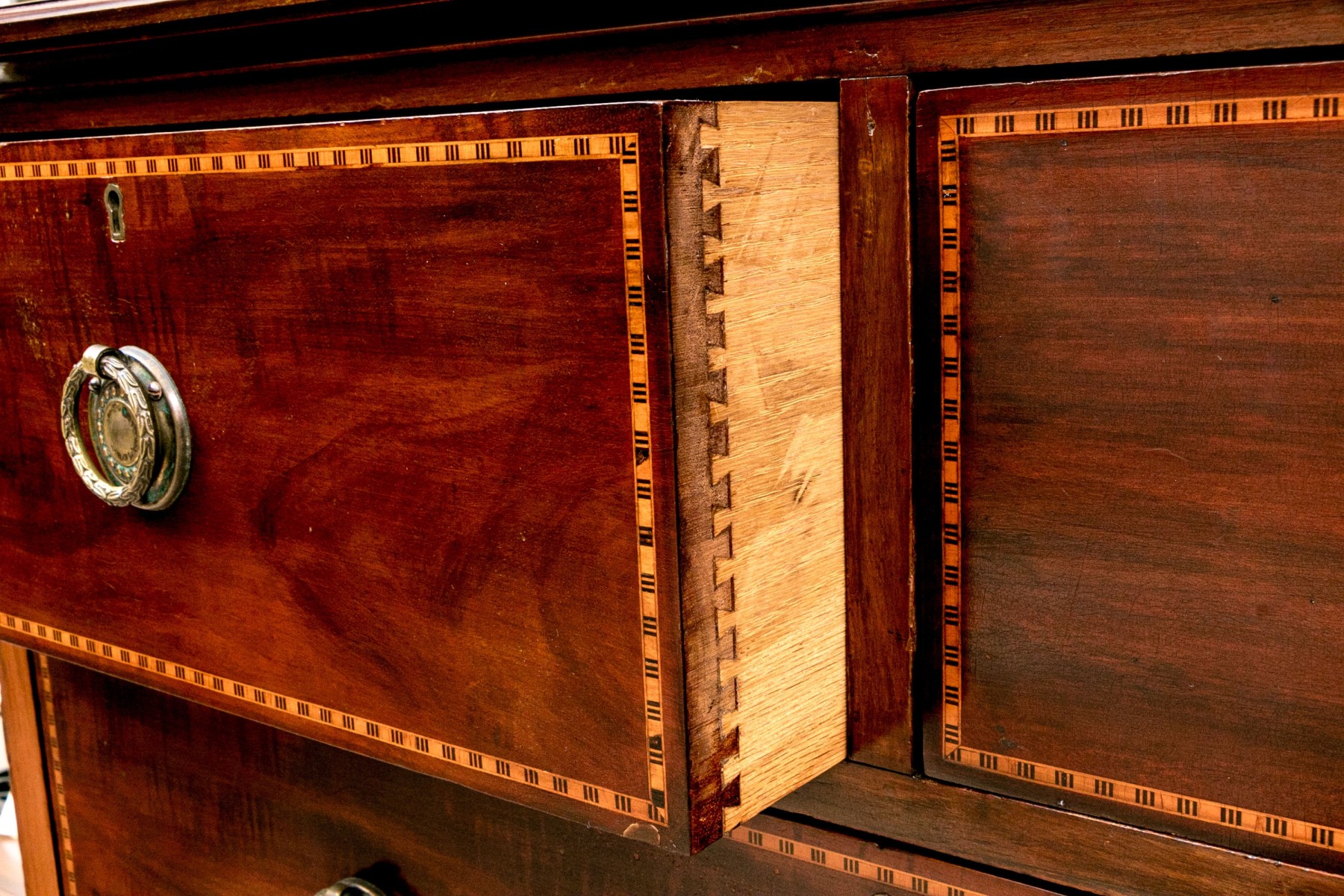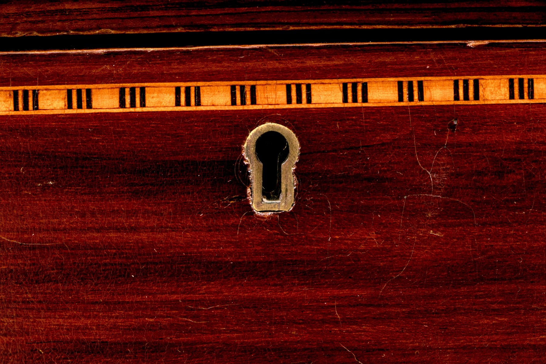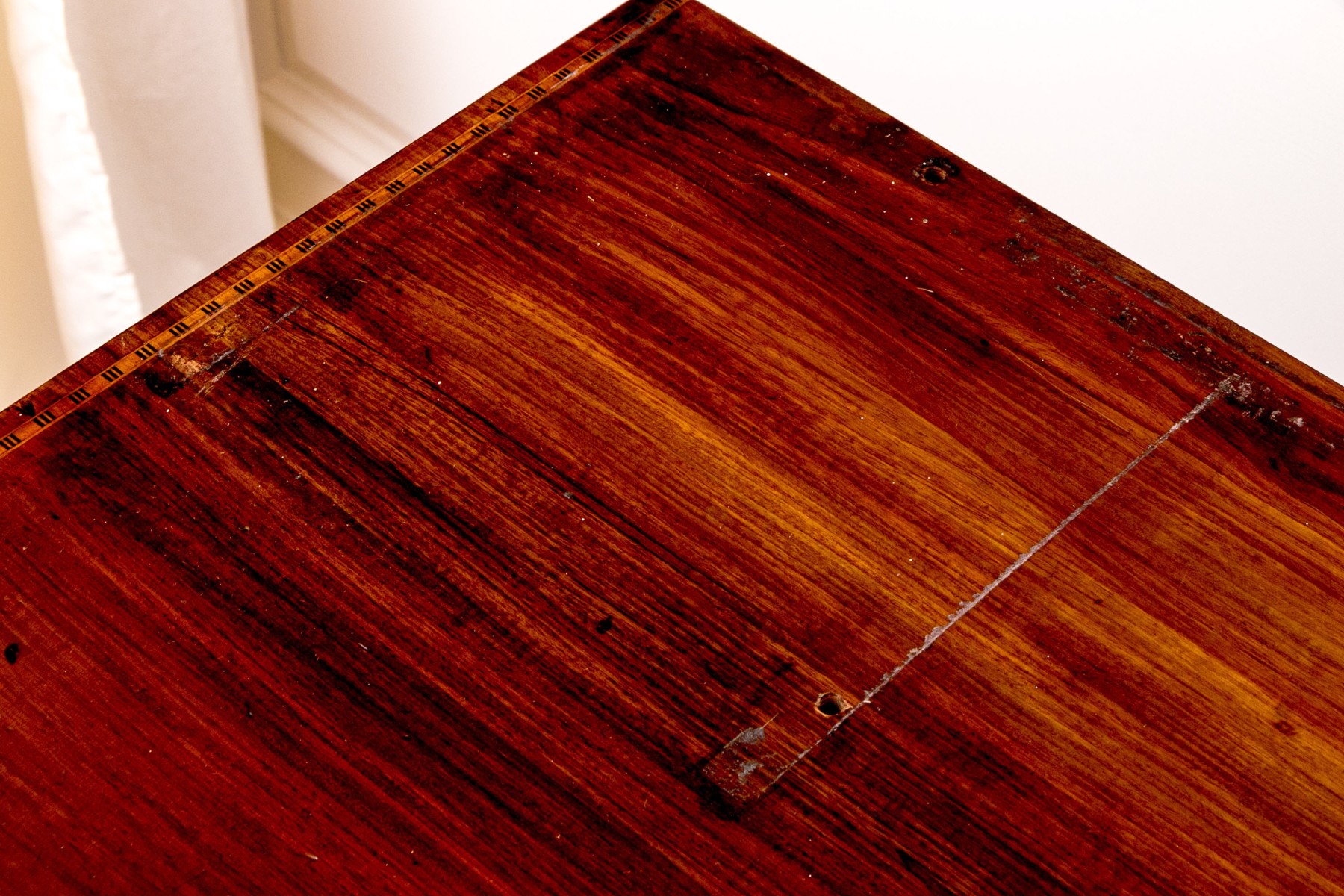 Drawers with marquetry trim tabs. On four carved legs. Brass drawer pulls.