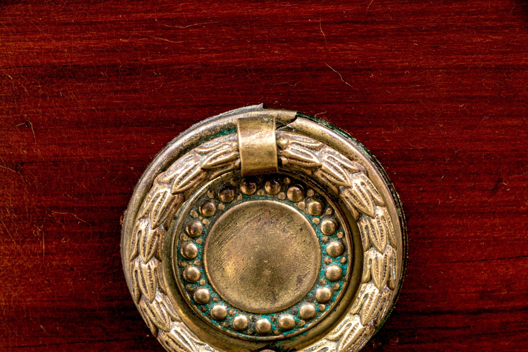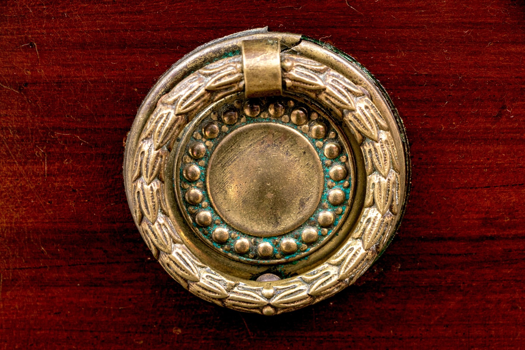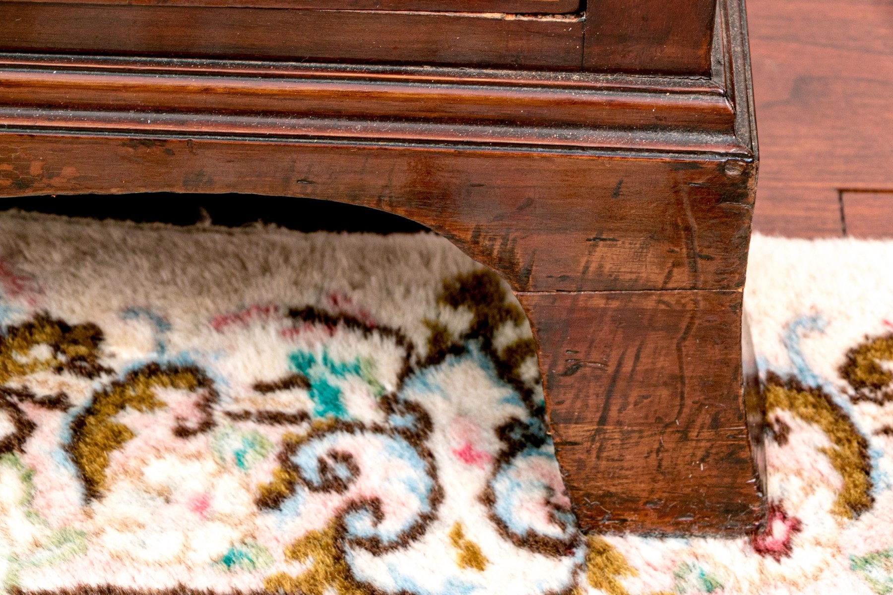 Bottom right pull is poorly affixed will need to be refastened. Missing screws. A vanity had been attached to the top but is no longer with the chest.