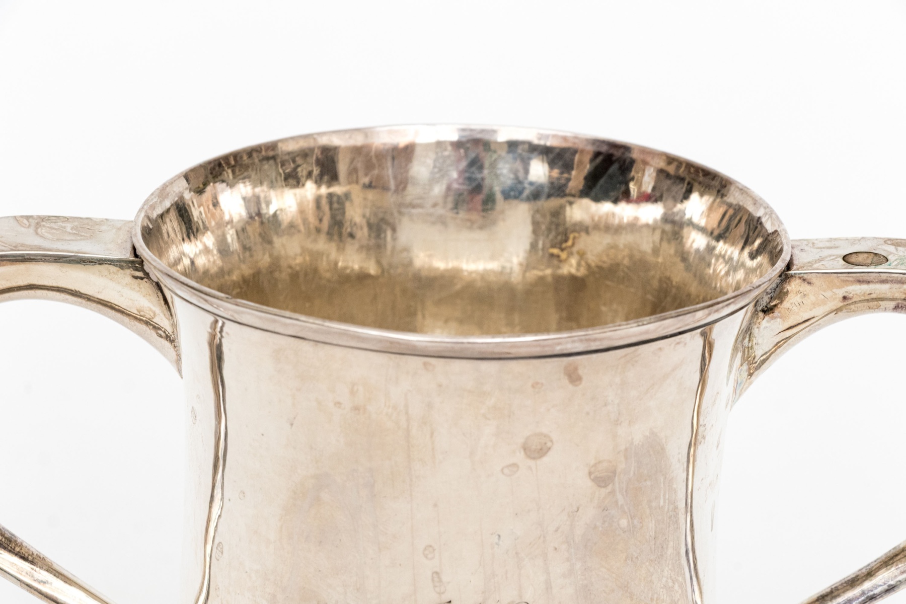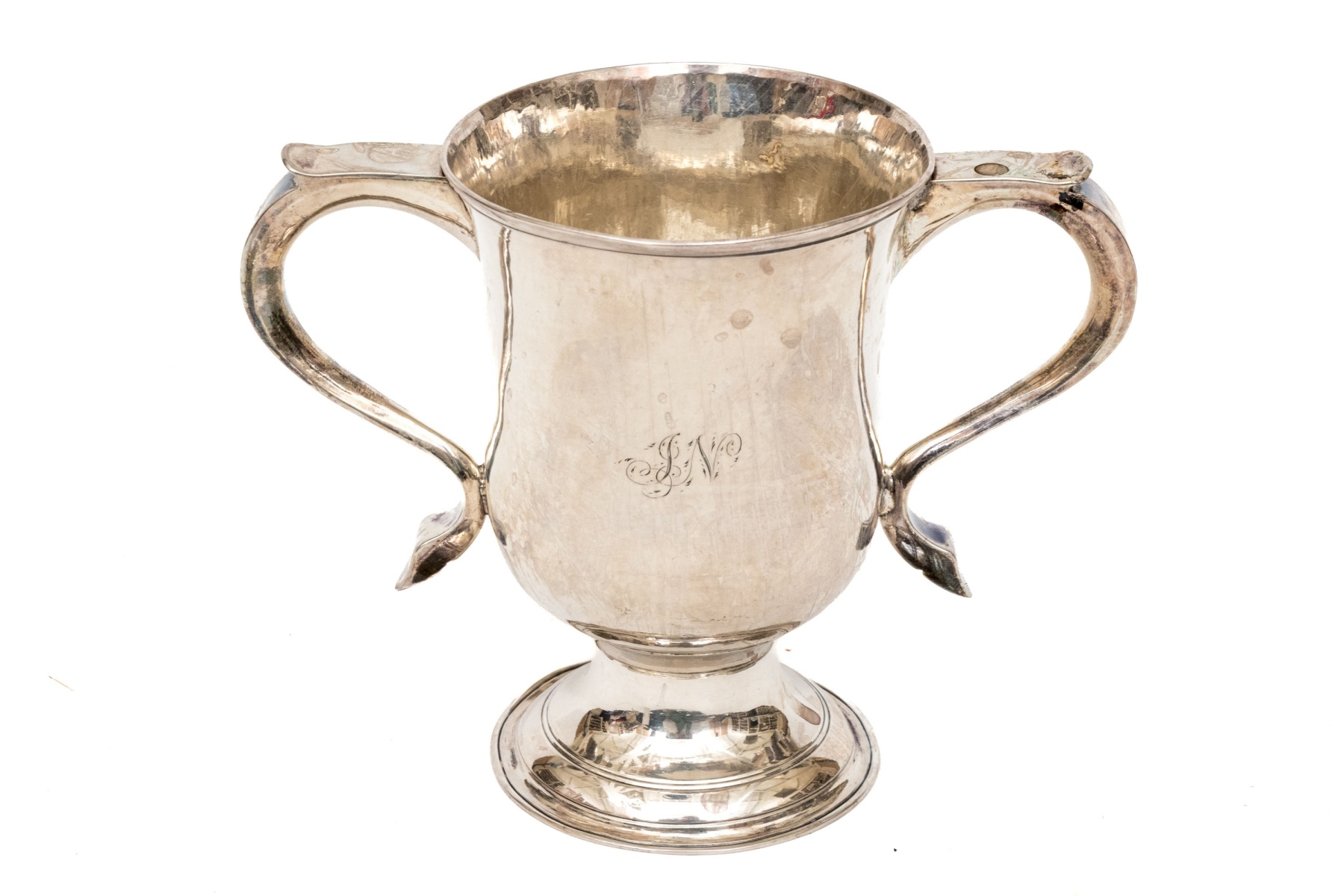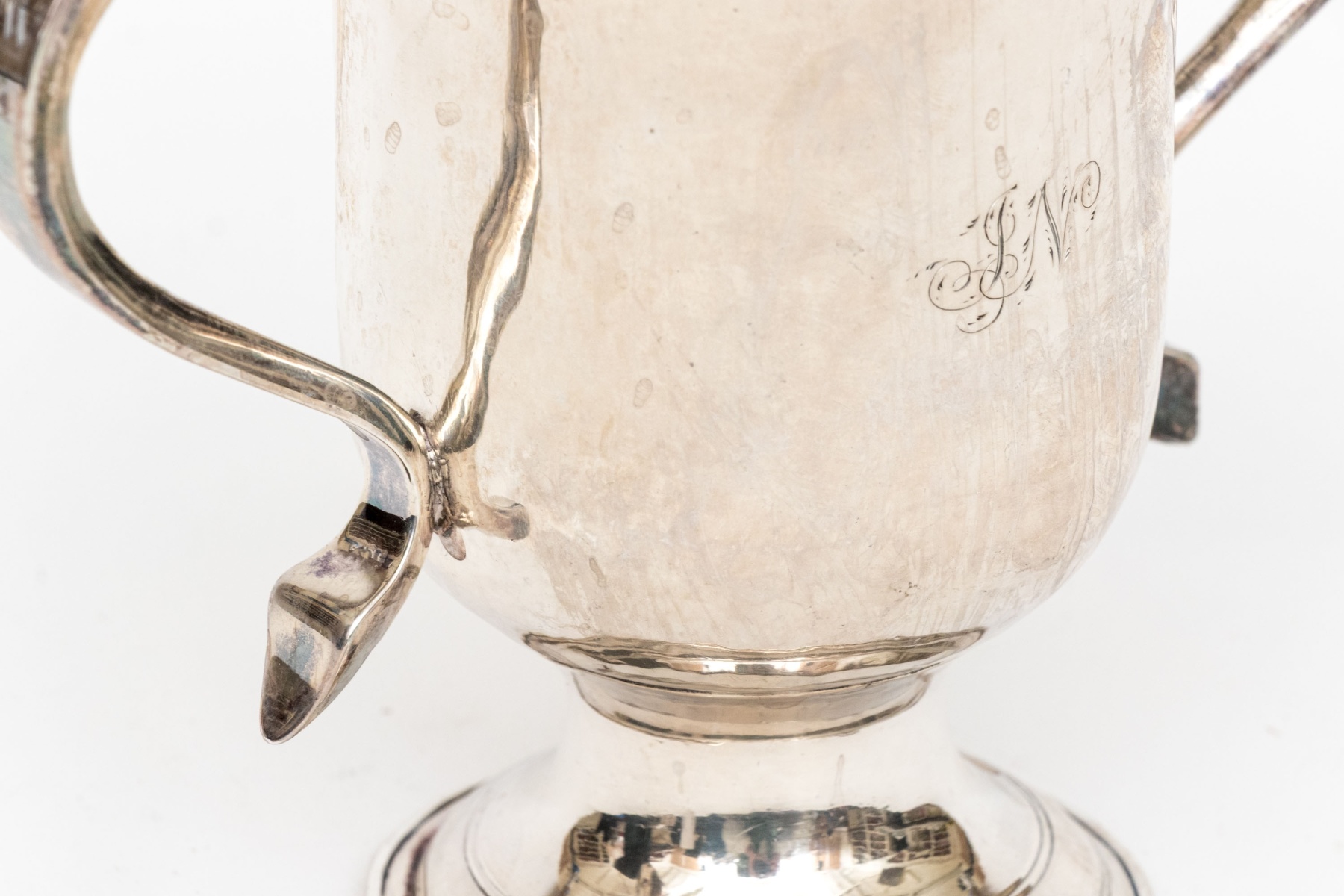 A charming English sterling silver trophy cup showcasing a flared bell form bowl flanked by large twin handles with flared thumb rests and handle ends, leading down to a pedestal foot. Monogrammed at the center front and marked underfoot.