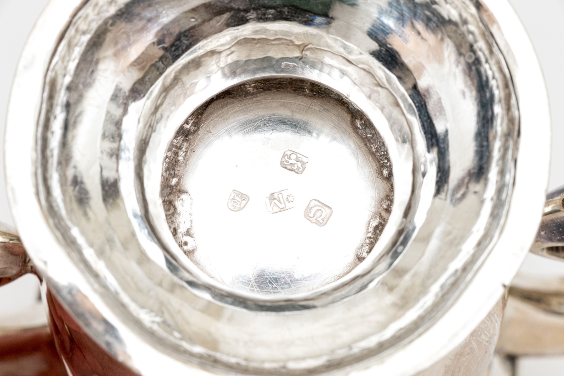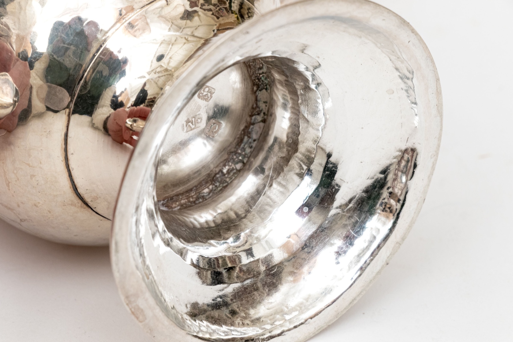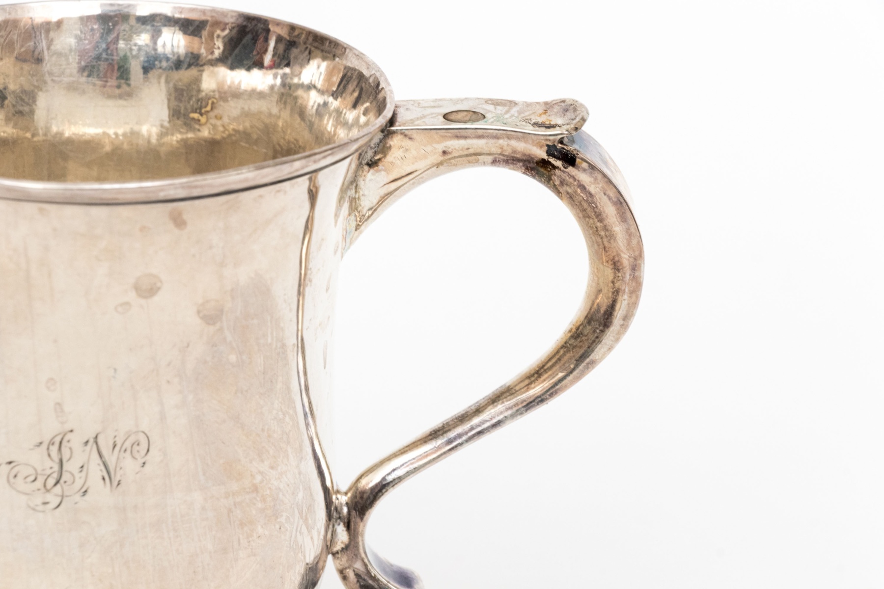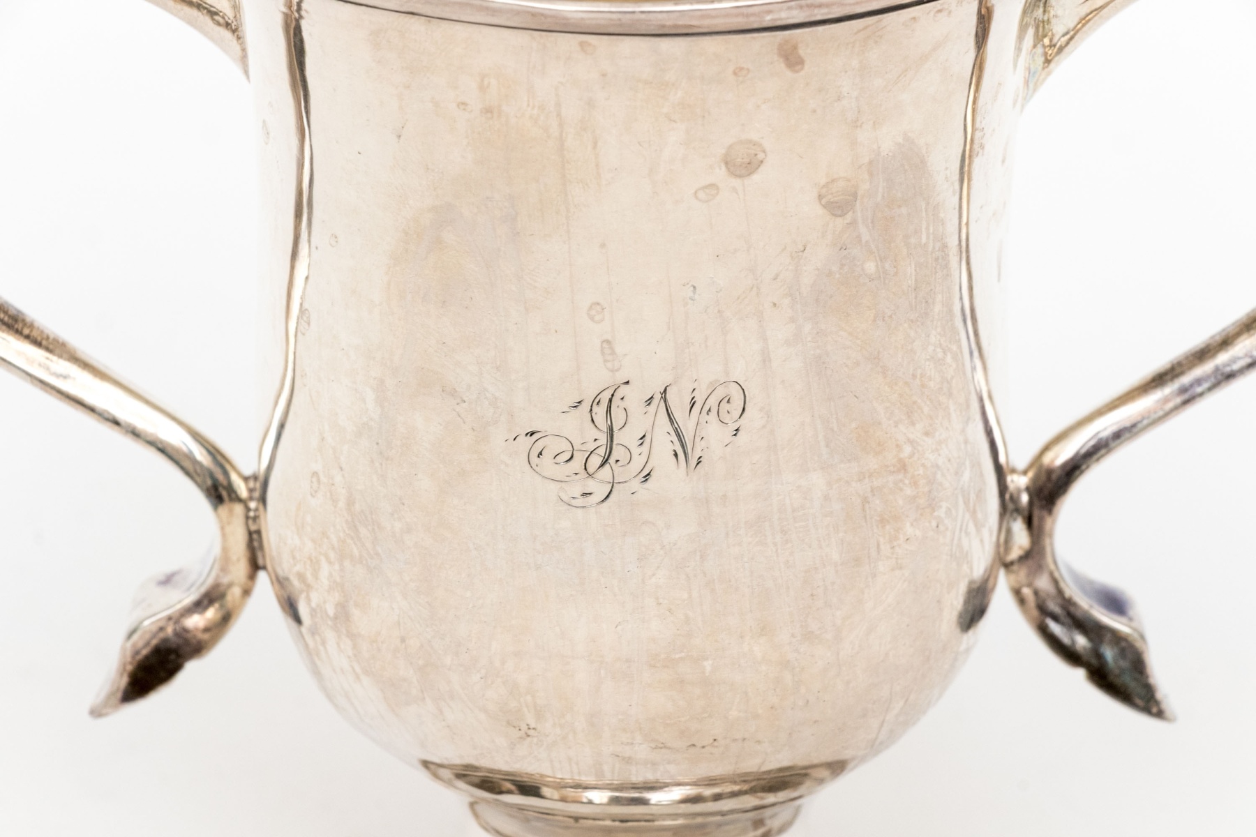 A charming English sterling silver trophy cup showcasing a flared bell form bowl flanked by large twin handles with flared thumb rests and handle ends, leading down to a pedestal foot. Monogrammed at the center front and marked underfoot.
