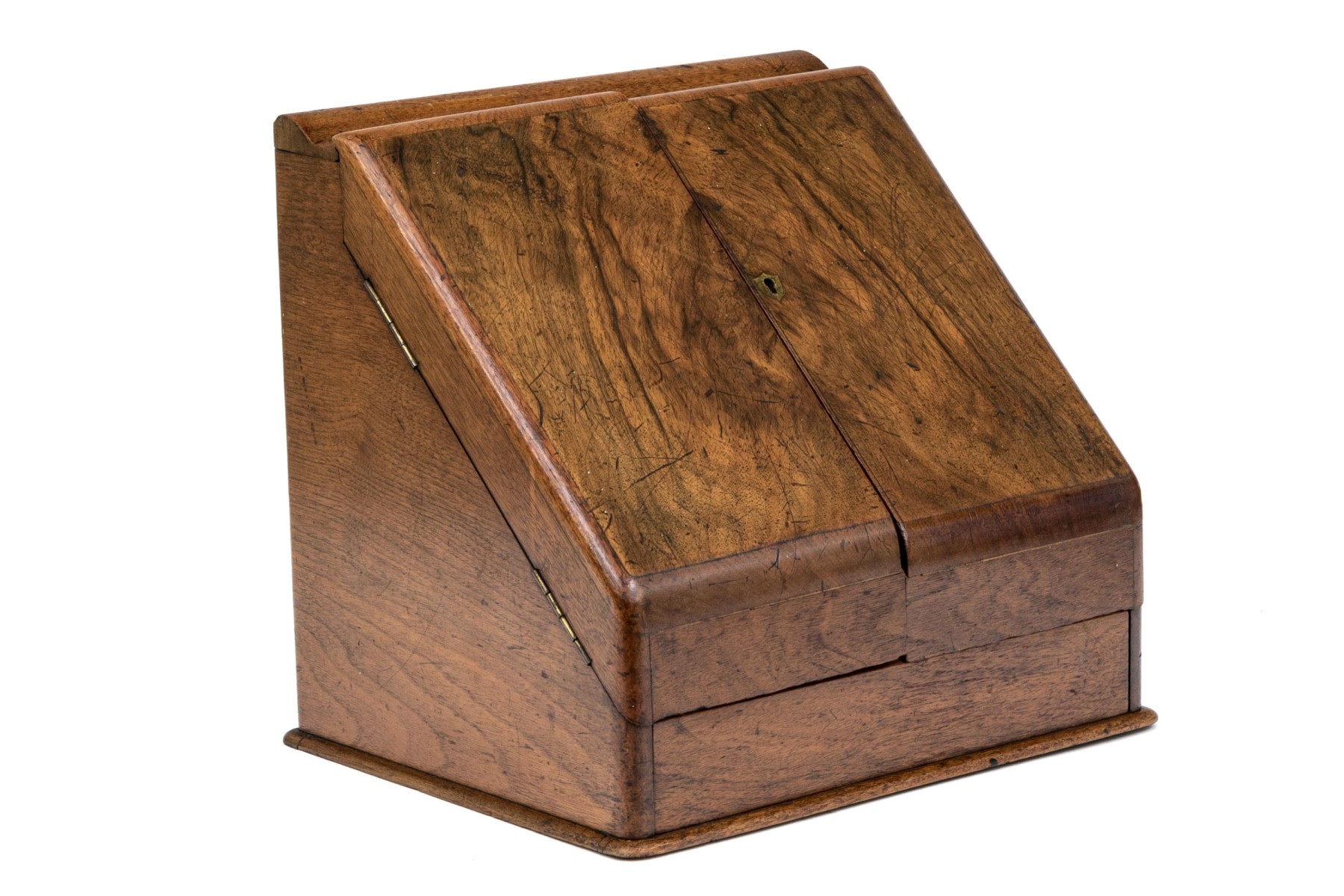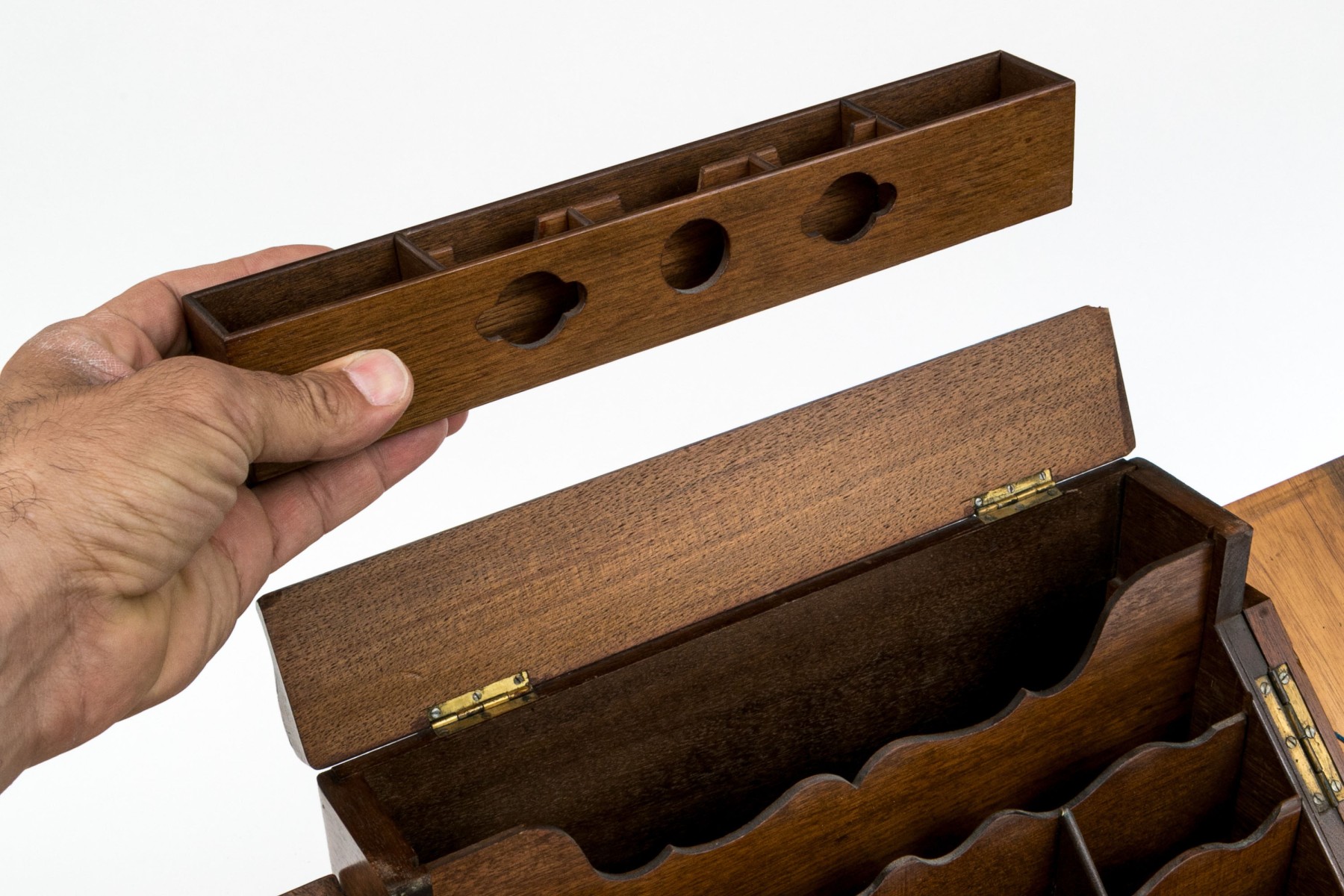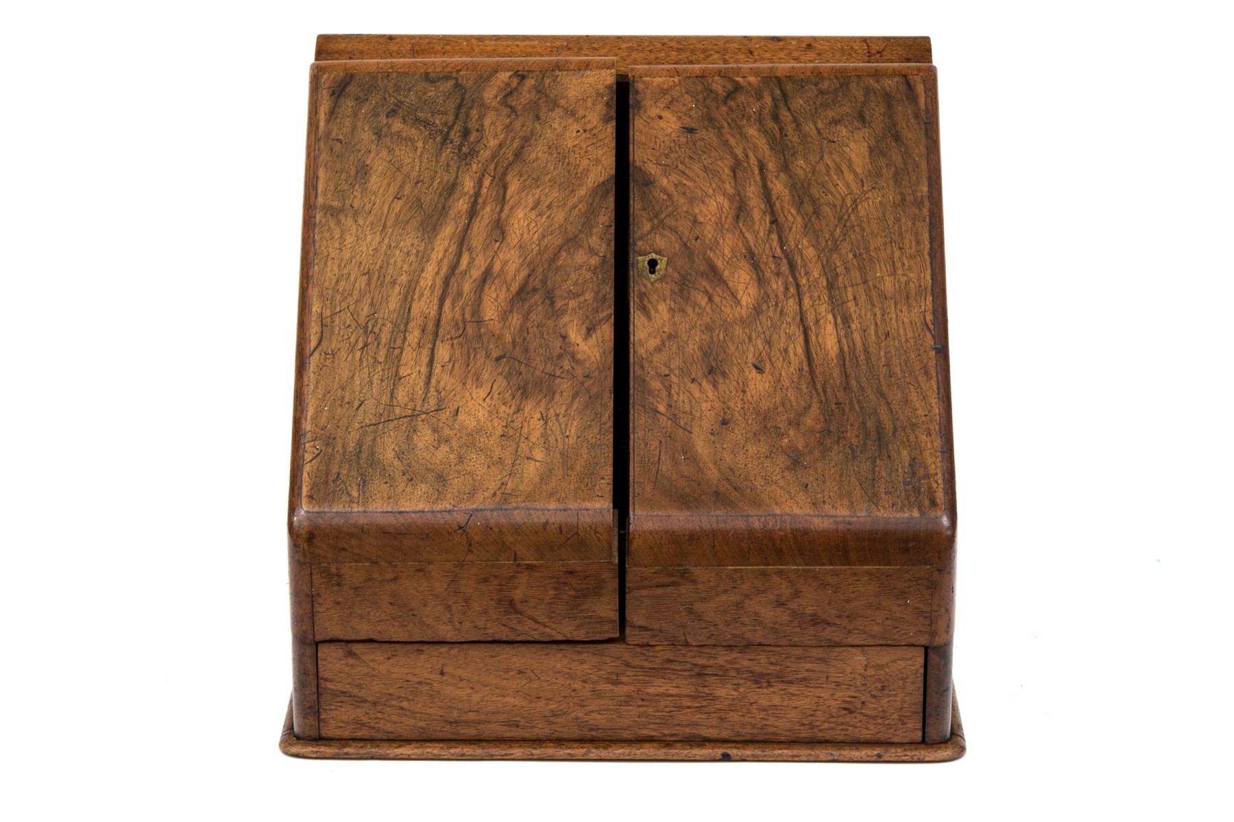A fabulous circa 1860 English letter box in medium brown mahogany, featuring double slant-front doors opening to an interior of scalloped dividers.