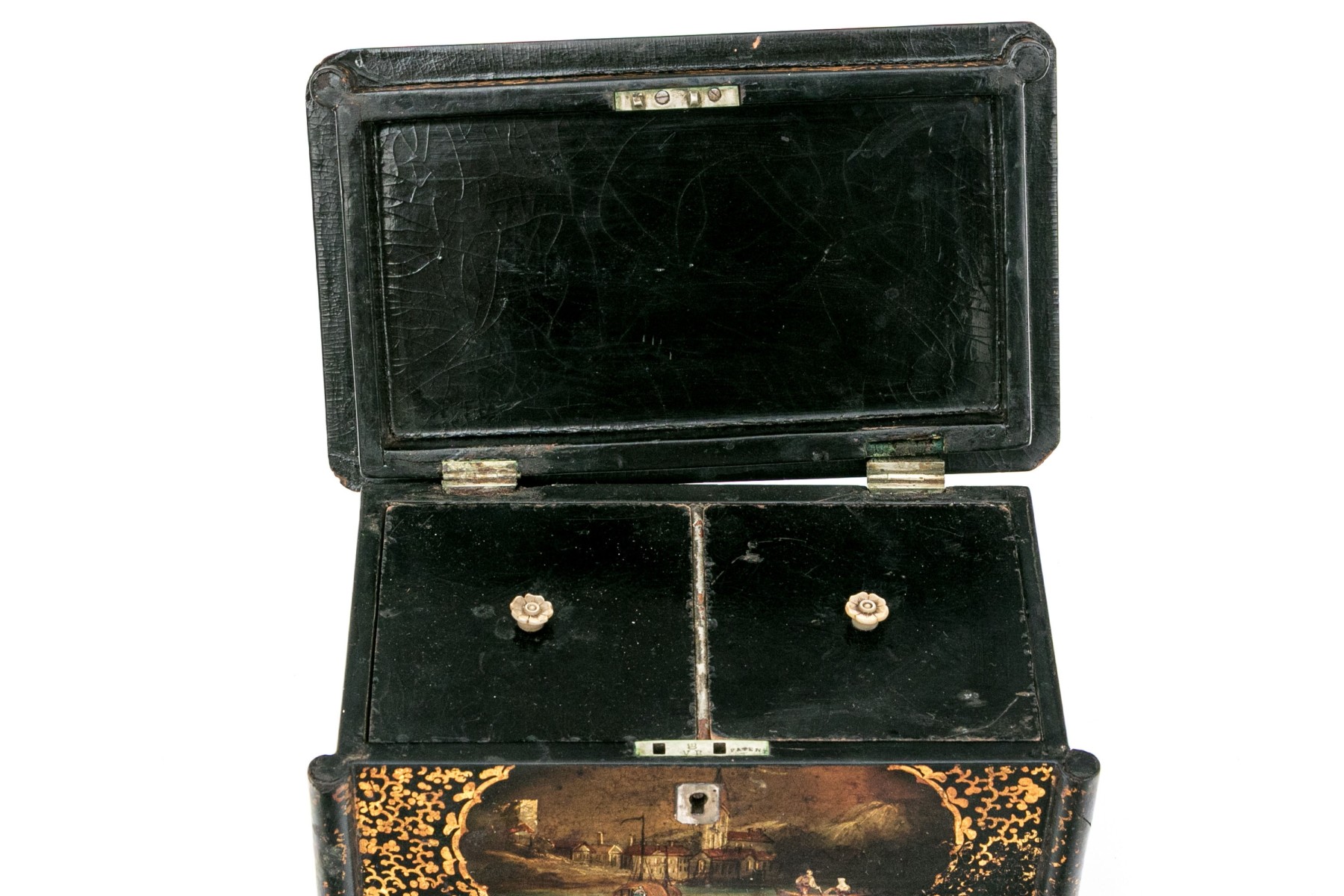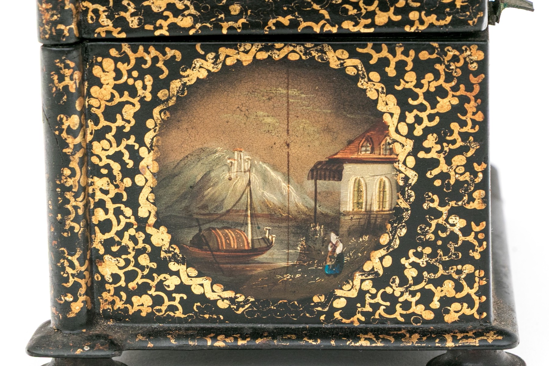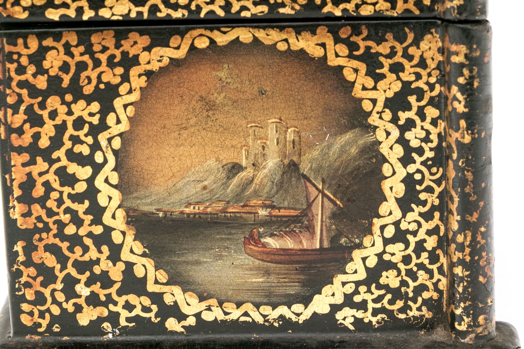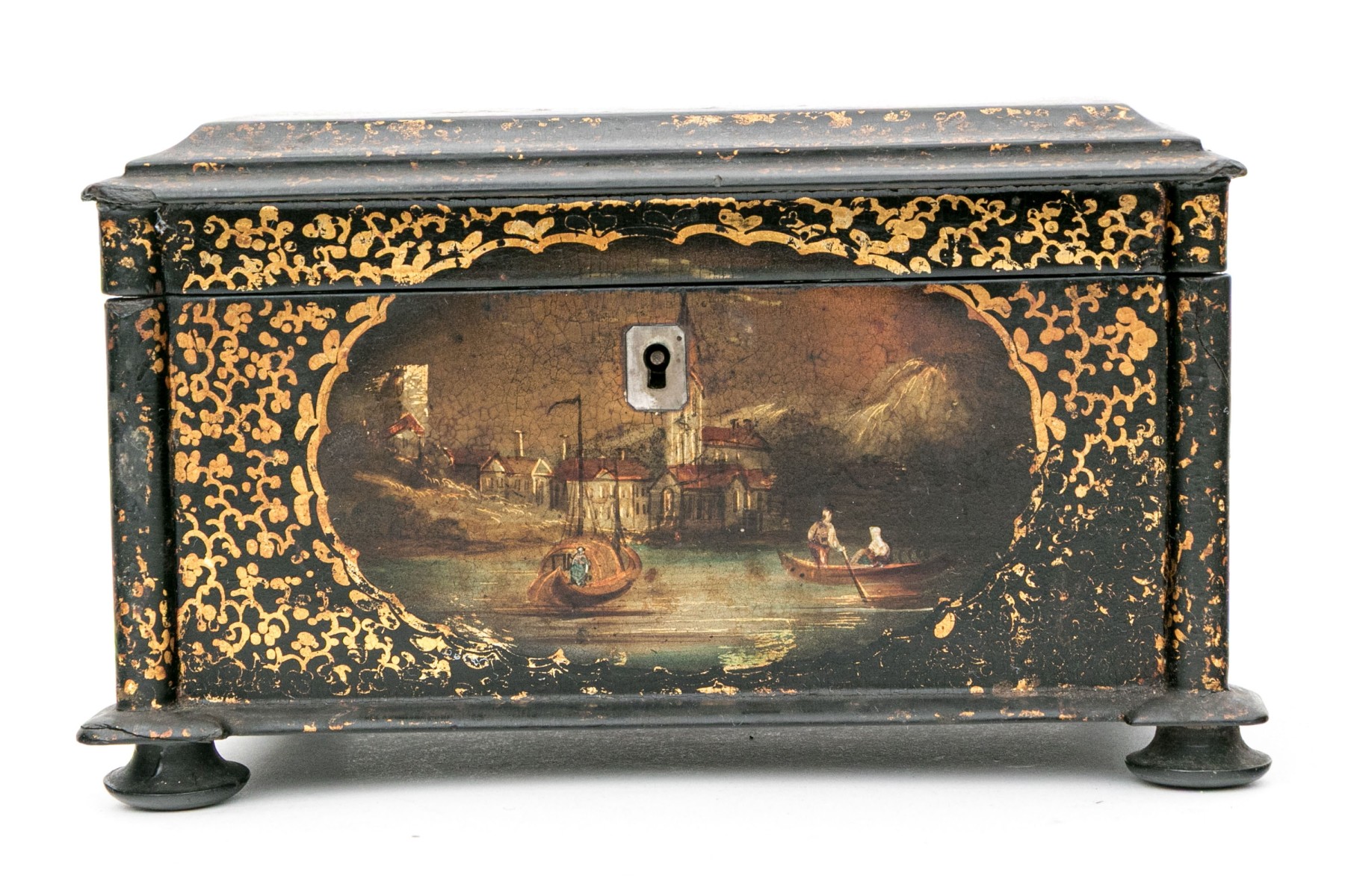 A beautifully detailed antique English tea caddy showcasing a rectangular casket with a beveled center to the lid. The caddy is ornately detailed with foliate vines surrounding hand-painted scenes of figures in towns surrounded by natural landscapes. The hinged lid opens to two lidded compartments with dainty floral handles. Raised on stout bun feet.