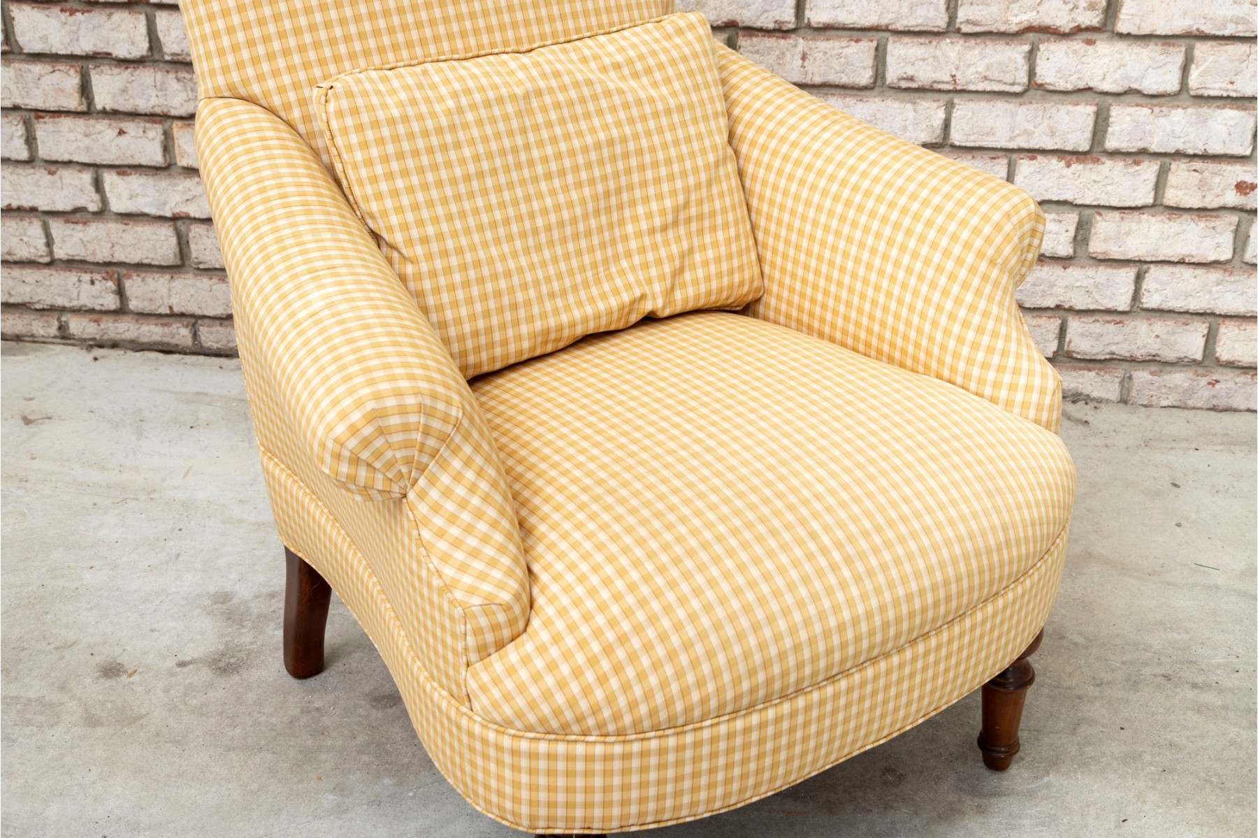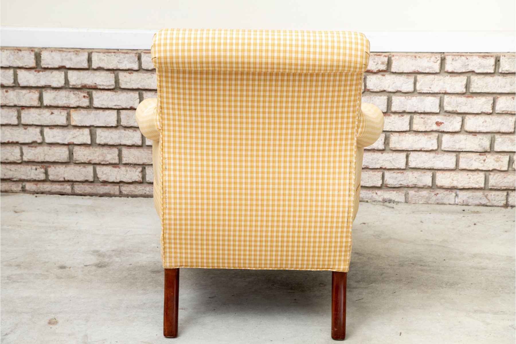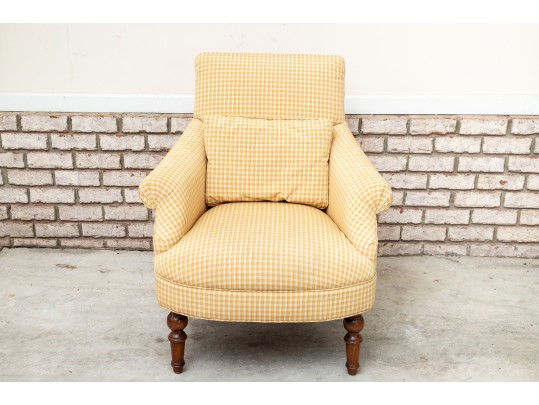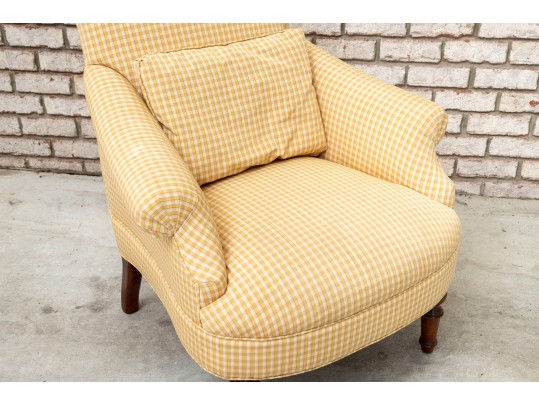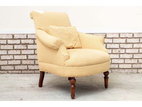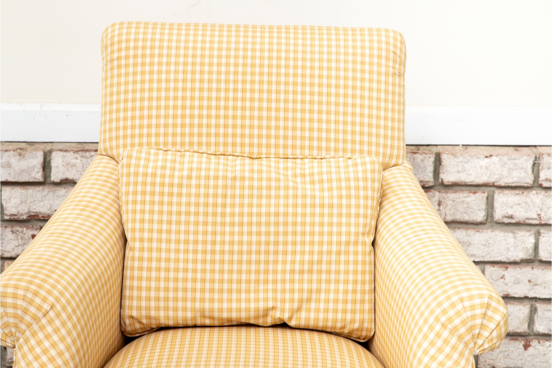 An English roll-arm accent chair showcasing plaid yellow/white upholstery by Sugar Creek. Matching throw pillows included.