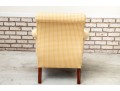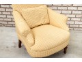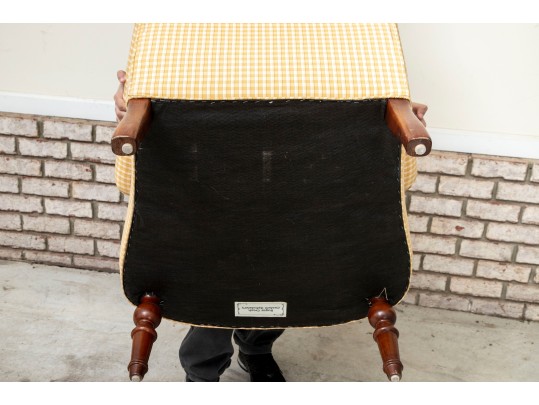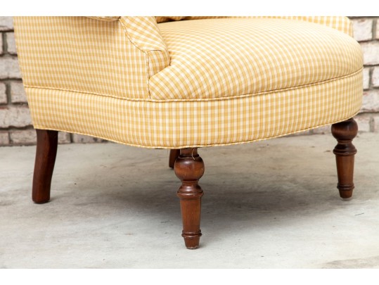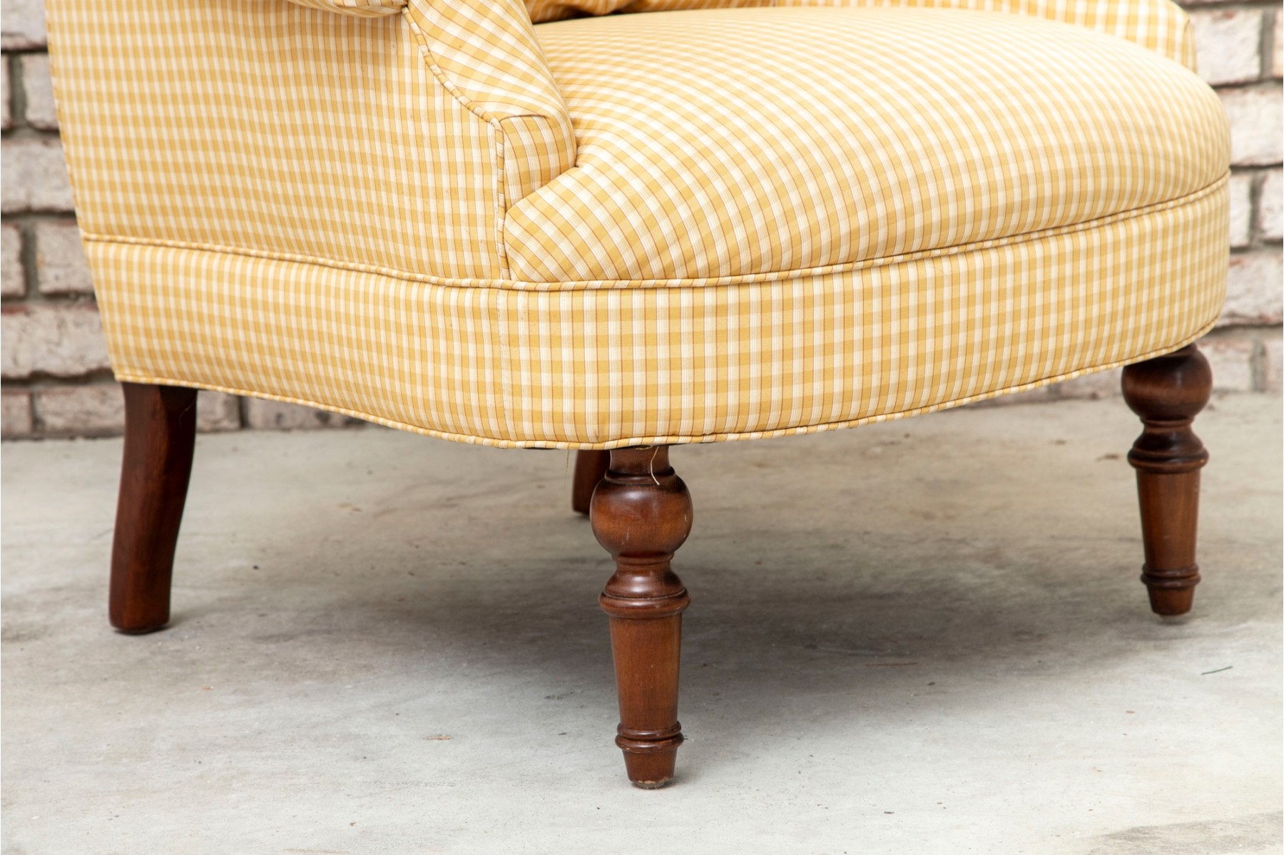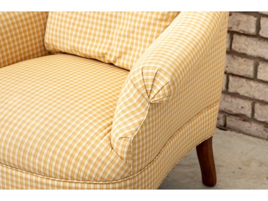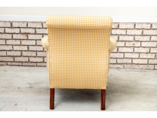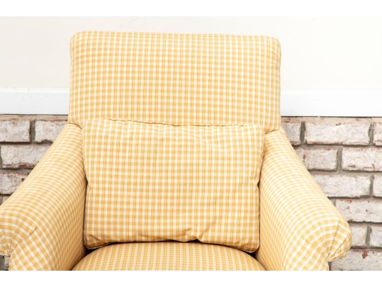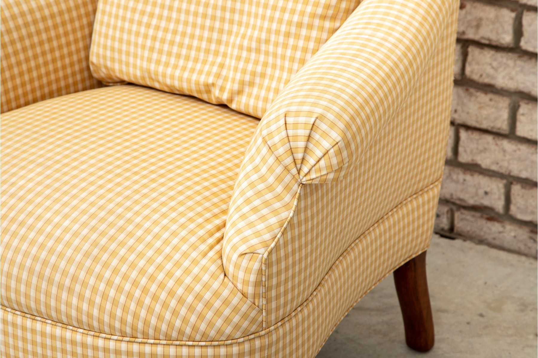 An English roll-arm accent chair showcasing plaid yellow/white upholstery by Sugar Creek. Matching throw pillows included.