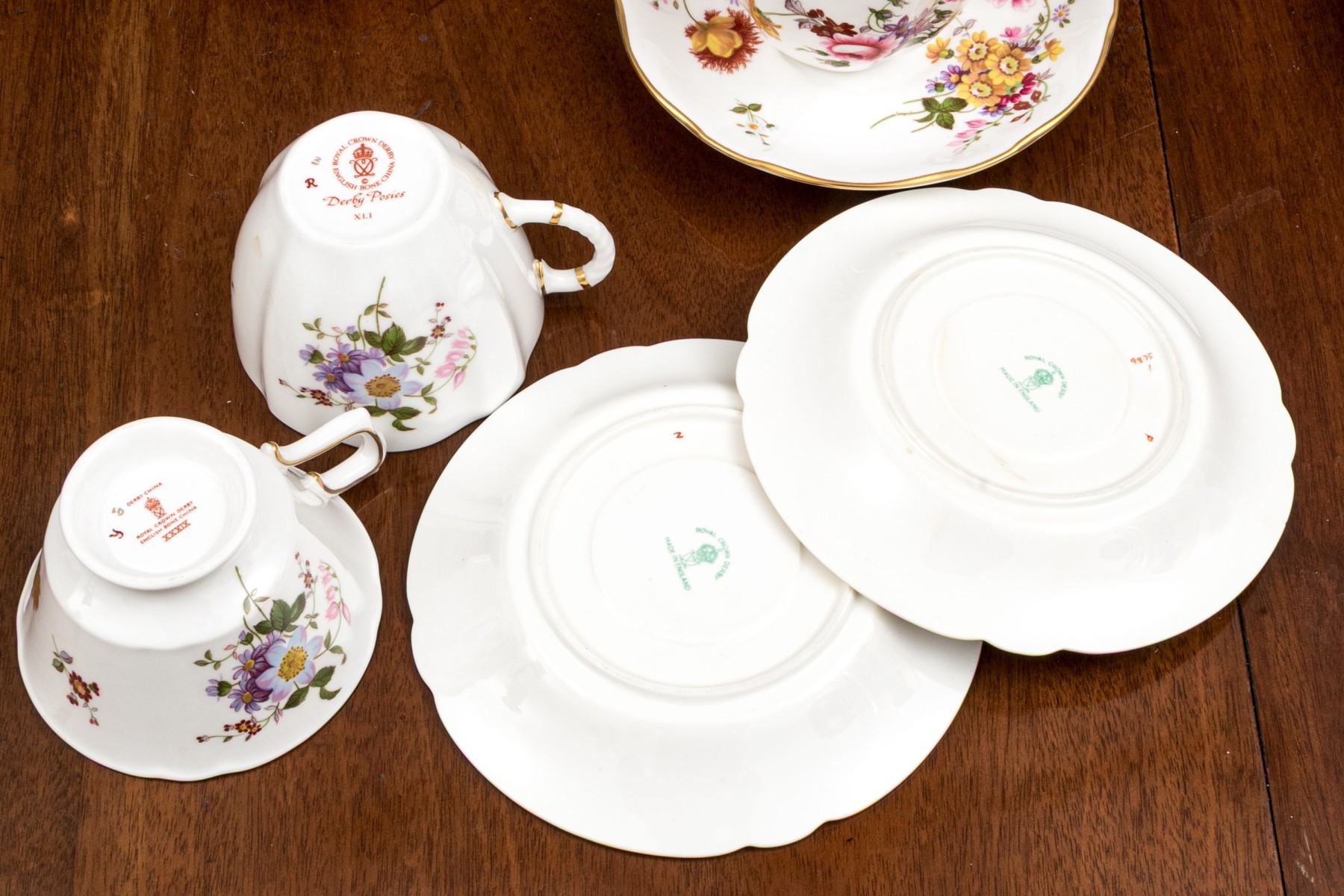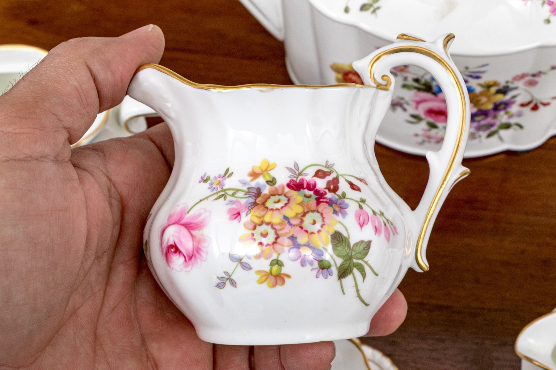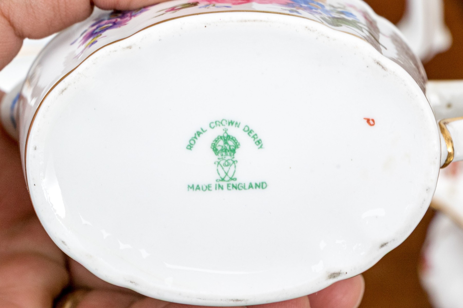 A gorgeous Royal Crown Derby "Posie Ely Chelsea" ceramic tea set beautifully designed with lobed bodies, scalloped rims, and vibrant floral sprays in purple, pink, yellow, and blue. Marked underfoot. The collection includes: