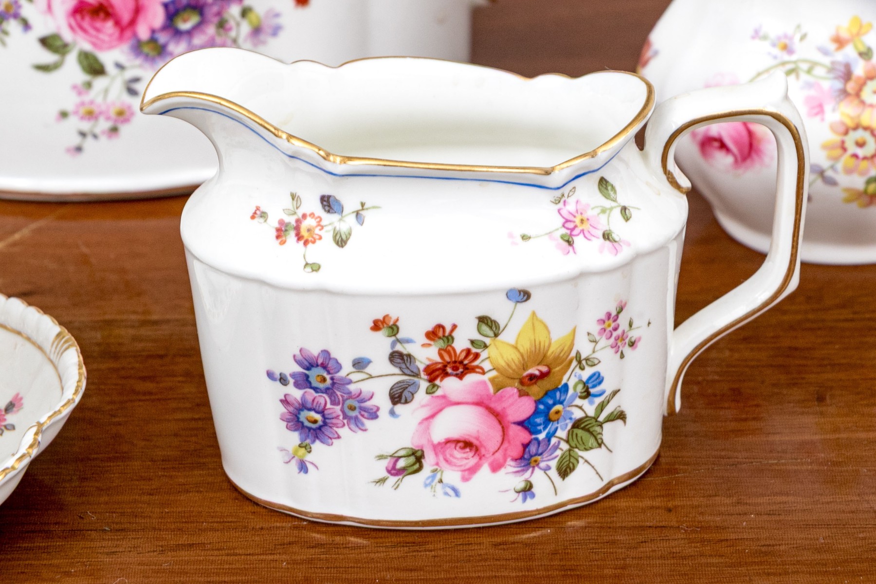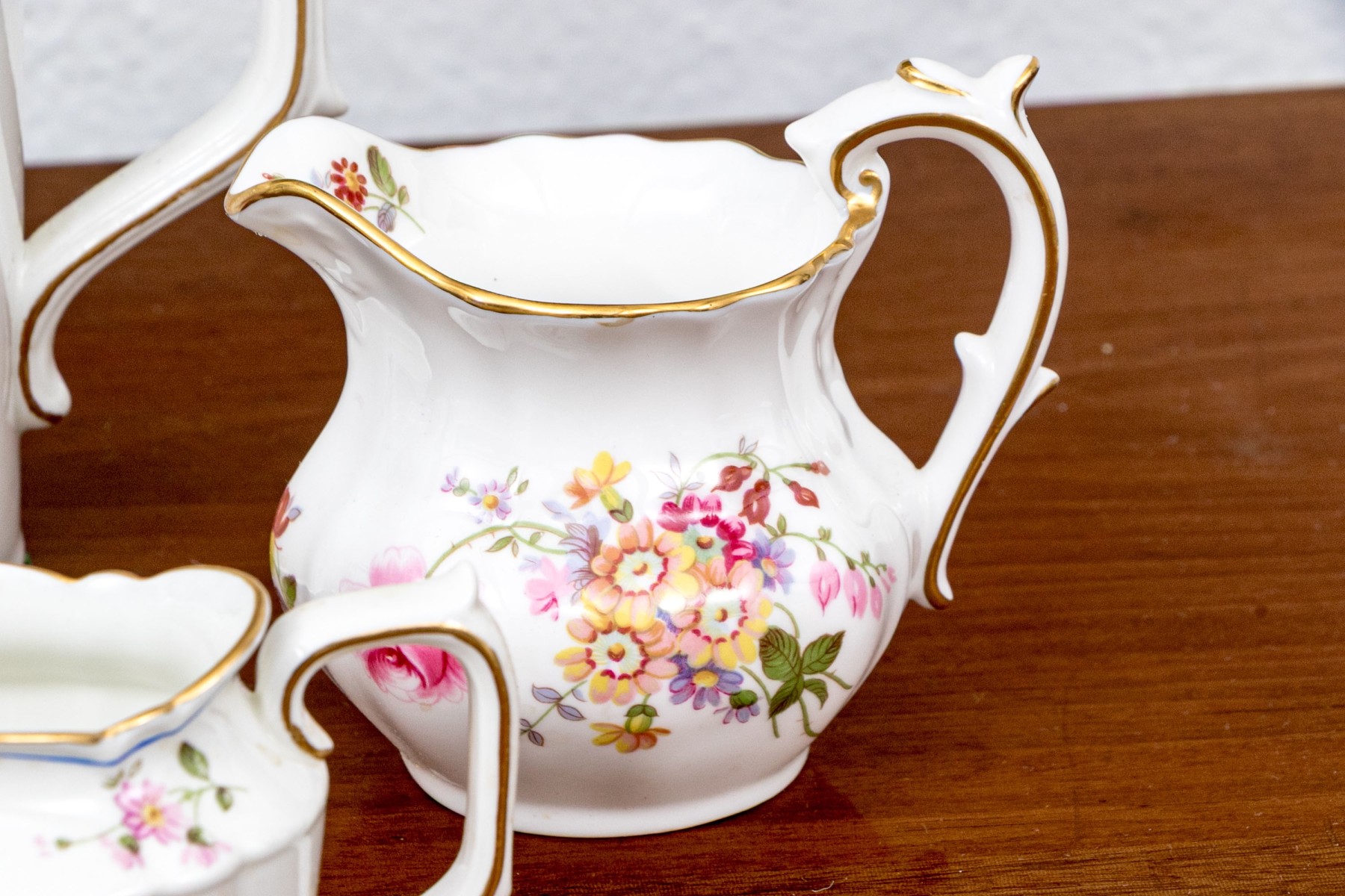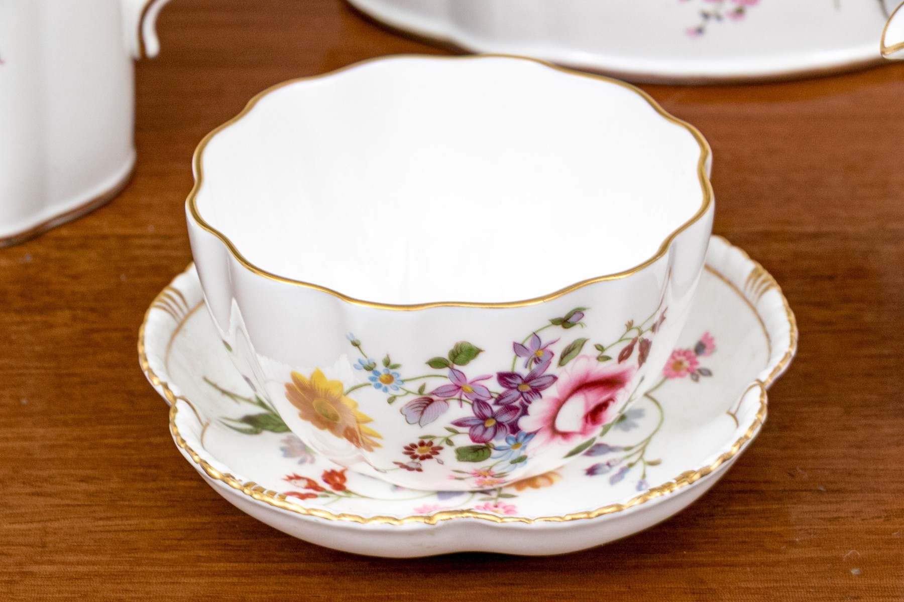 A gorgeous Royal Crown Derby "Posie Ely Chelsea" ceramic tea set beautifully designed with lobed bodies, scalloped rims, and vibrant floral sprays in purple, pink, yellow, and blue. Marked underfoot. The collection includes: