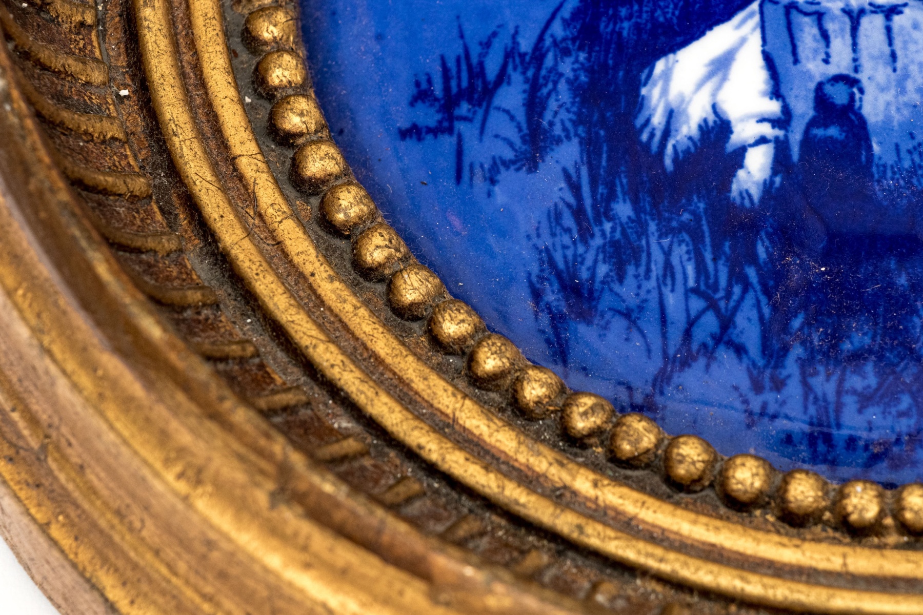 A gorgeous Royal Doulton ceramic plaque with a transferware scen eof two adorable children beneath a tree resting in the grass. Displayed in an elegantly fluted and deeply beveled gilt frame with a beaded inner border. Marked on the verso.