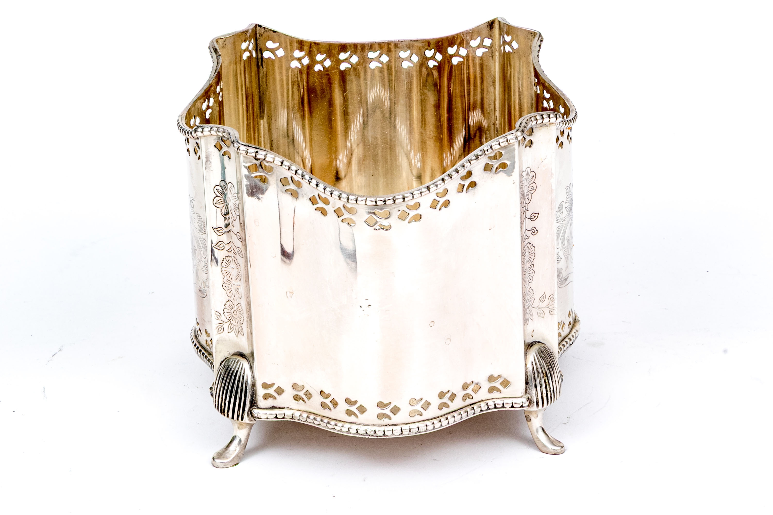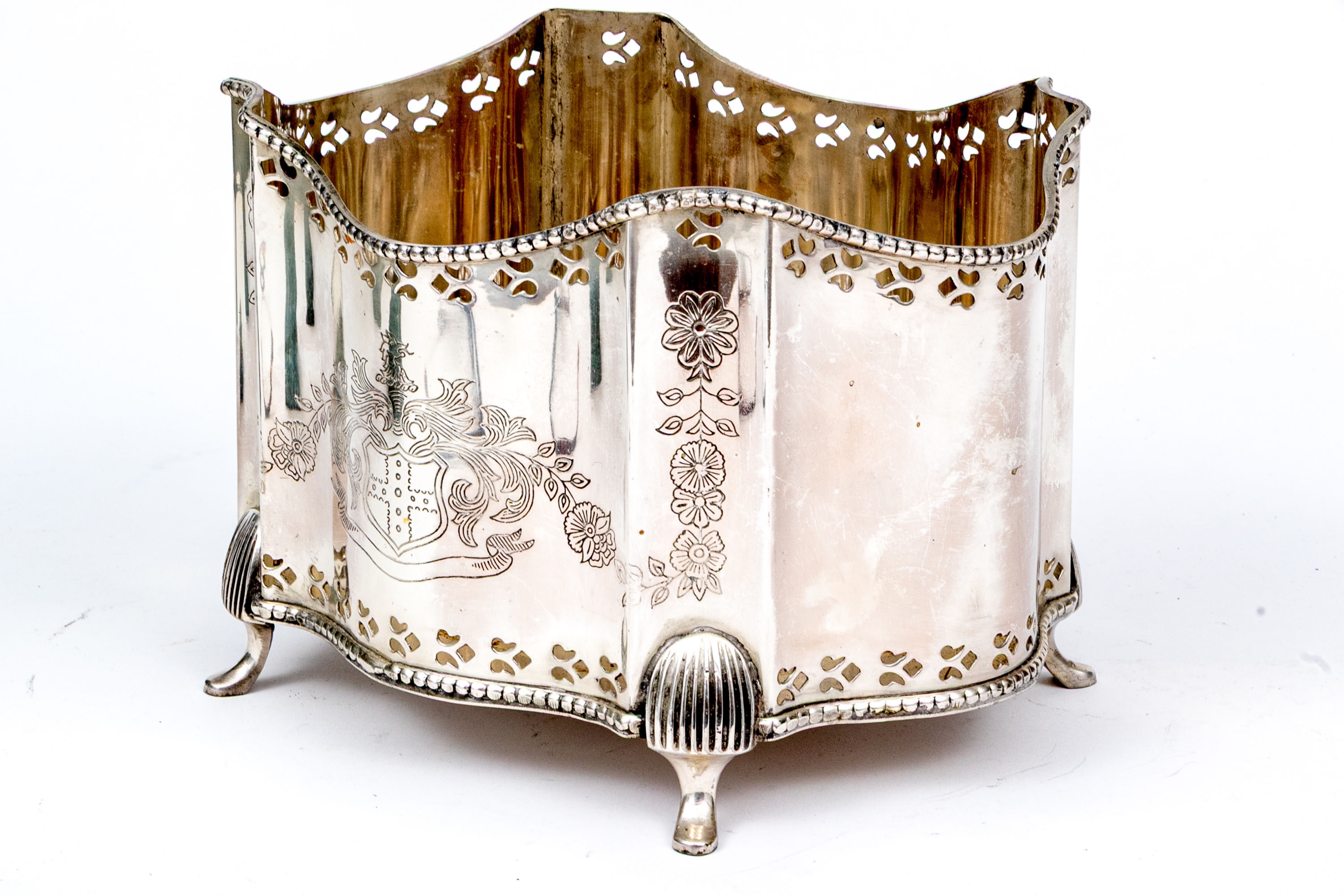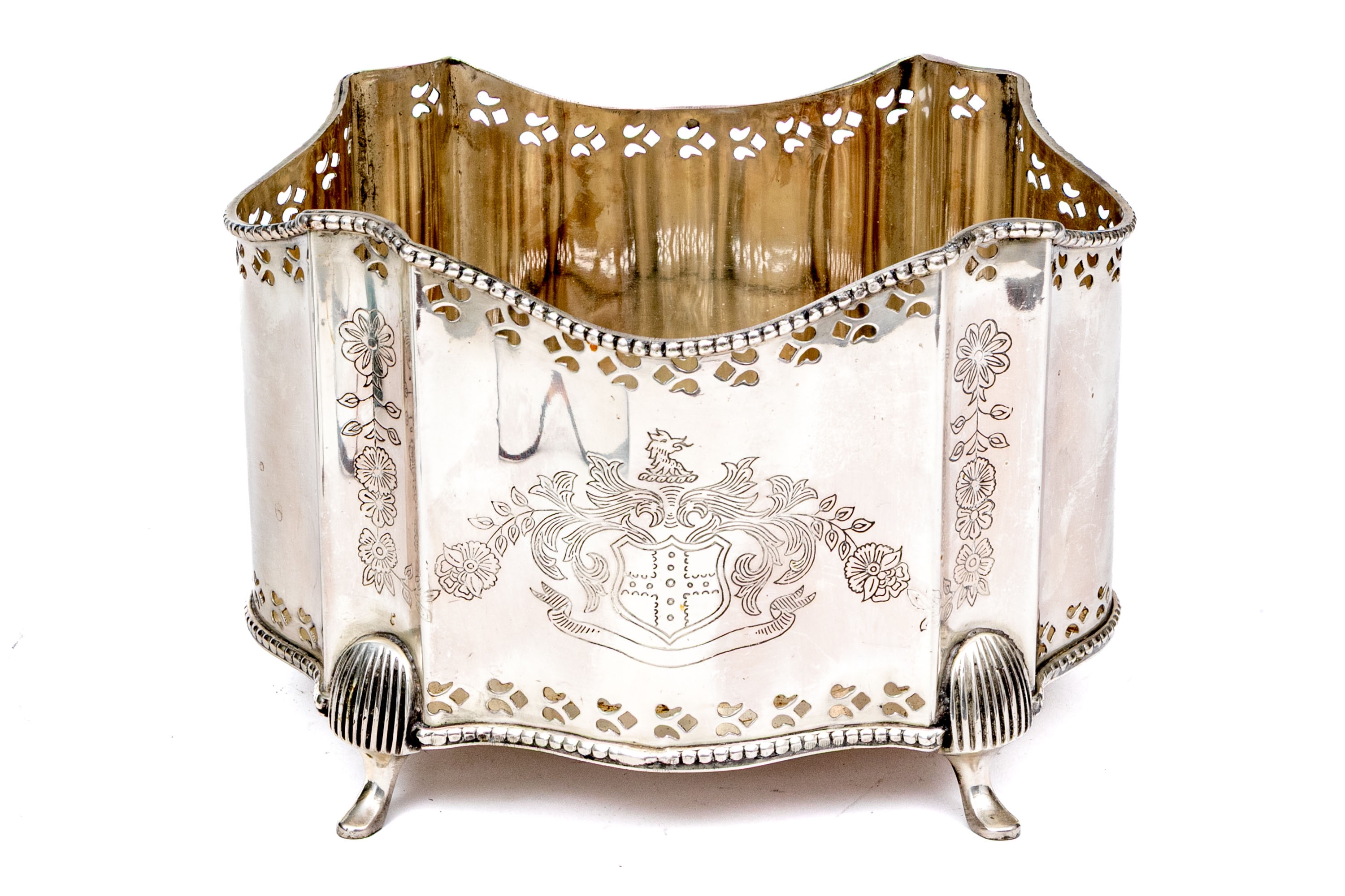 A fabulous antique English silver plated cache pot or jardiniere with a touch of Art Deco glamour, showcasing a bracketed and serpentine curved rectangular profile with a beaded trim over a pierced border. The bracketed corners are nicely etched with floral columns, complementing a heraldic motif at the center front. Raised over stately fluted legs with pad feet.