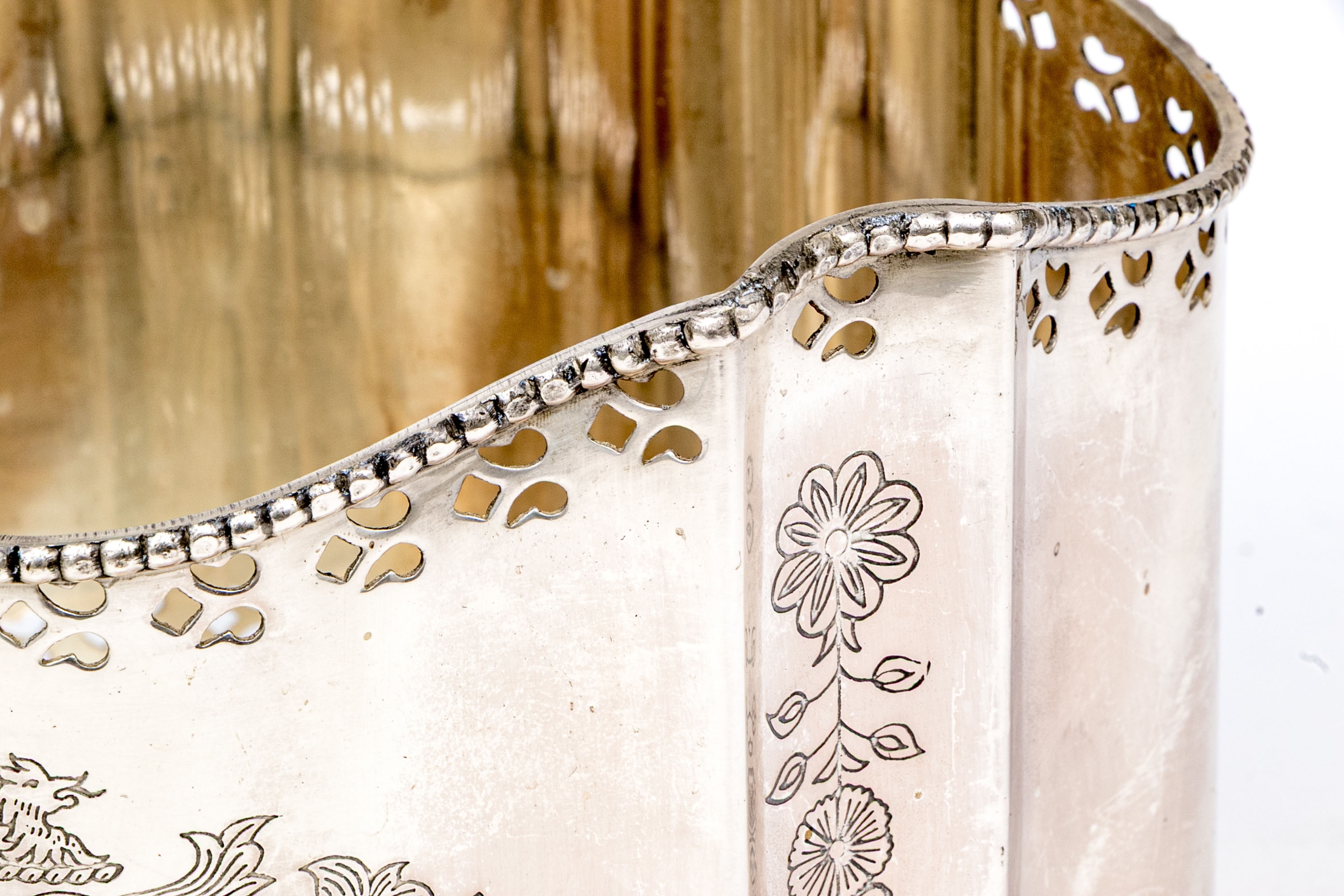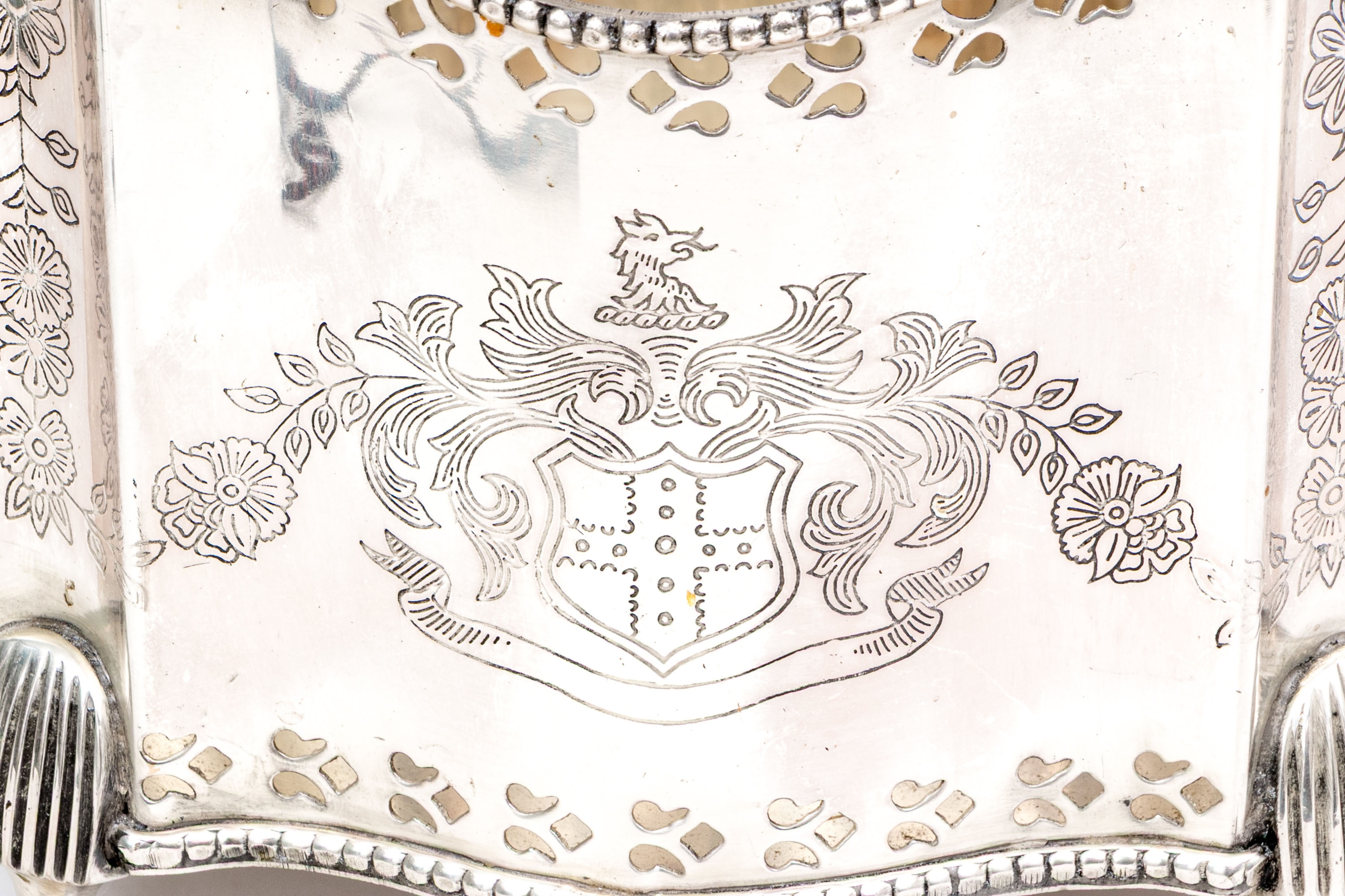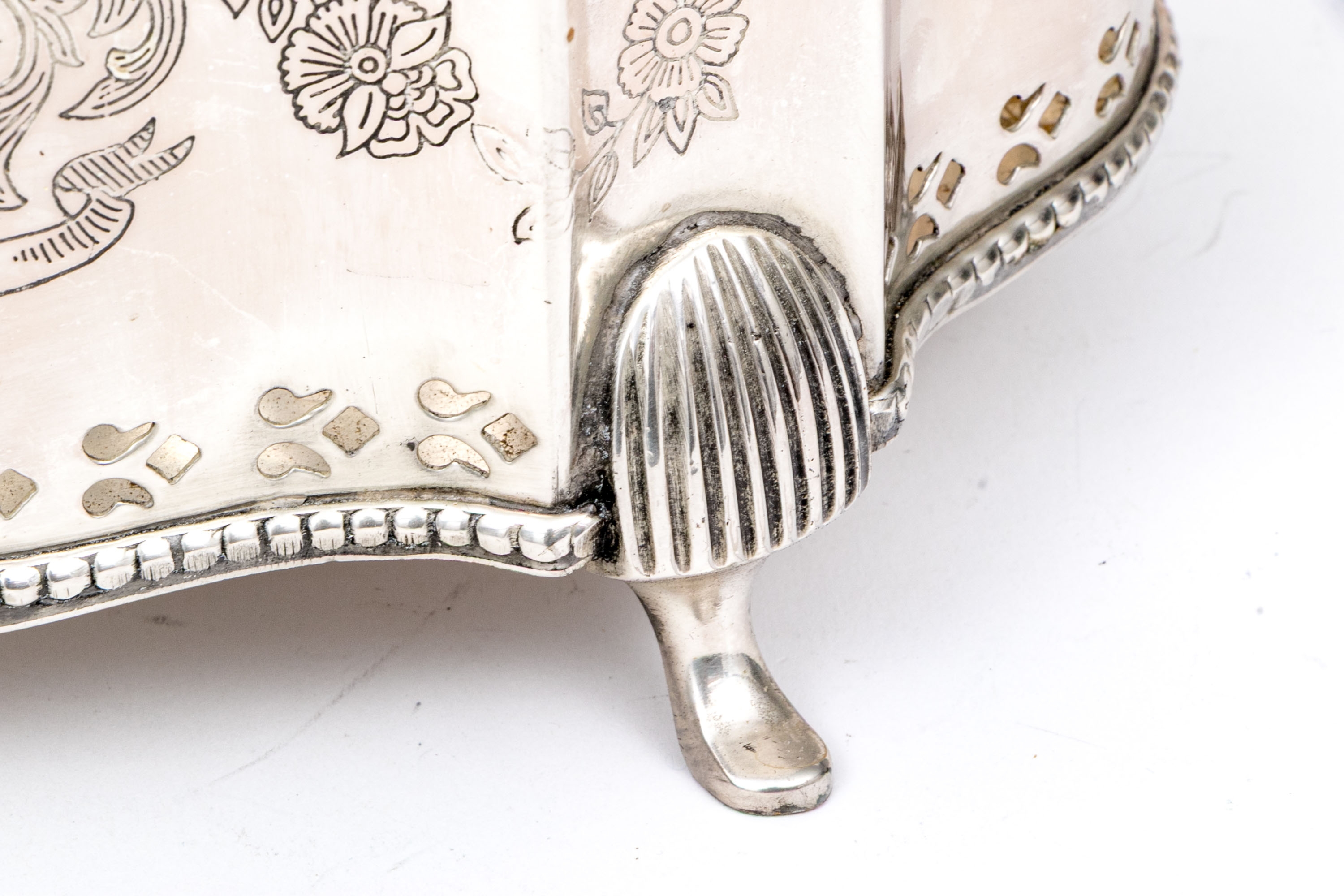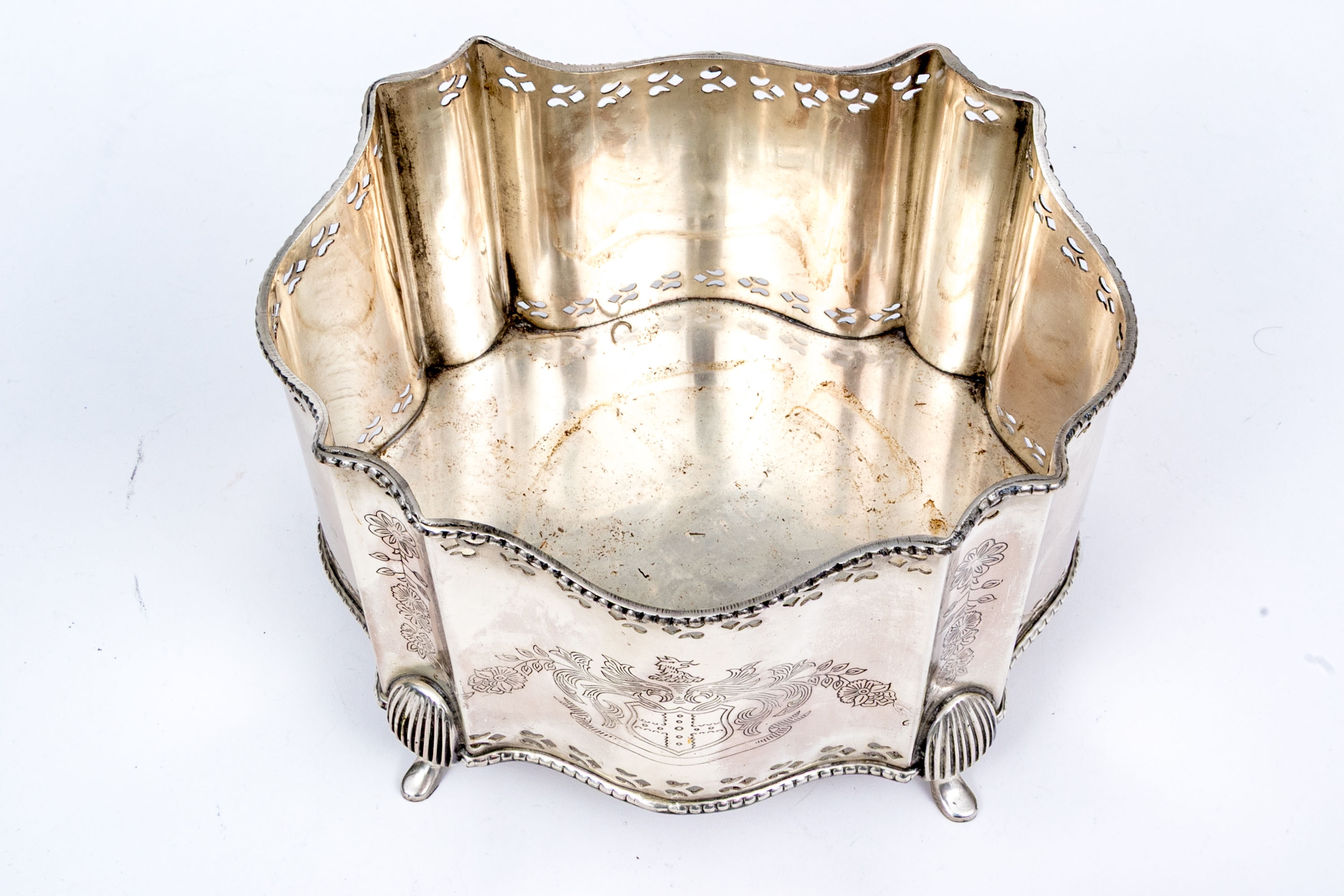 A fabulous antique English silver plated cache pot or jardiniere with a touch of Art Deco glamour, showcasing a bracketed and serpentine curved rectangular profile with a beaded trim over a pierced border. The bracketed corners are nicely etched with floral columns, complementing a heraldic motif at the center front. Raised over stately fluted legs with pad feet.