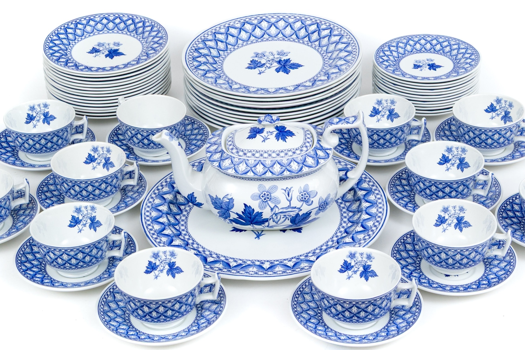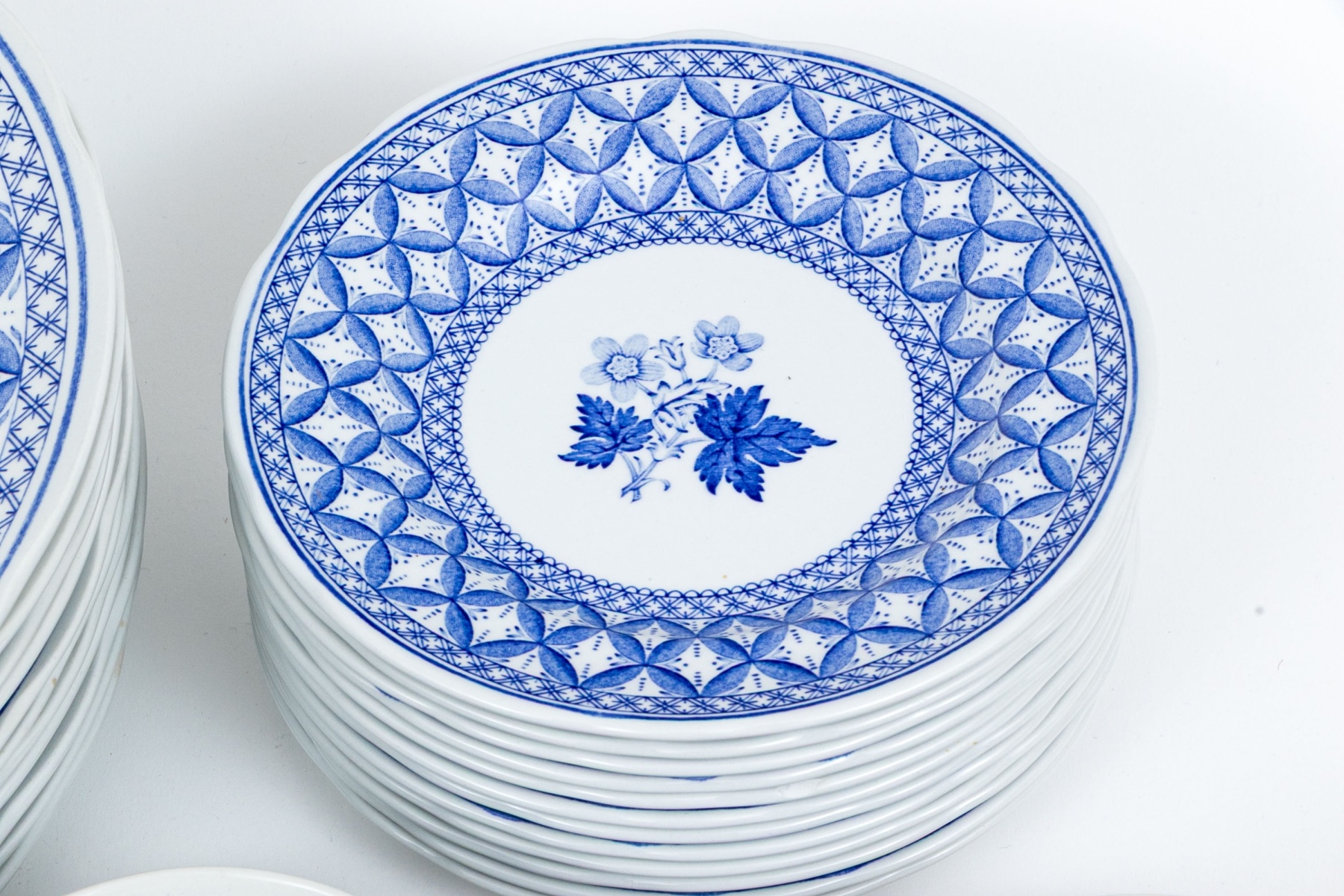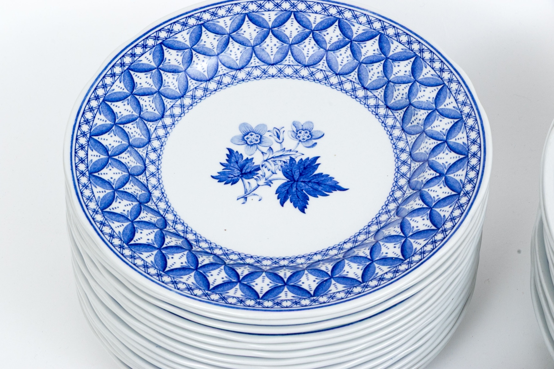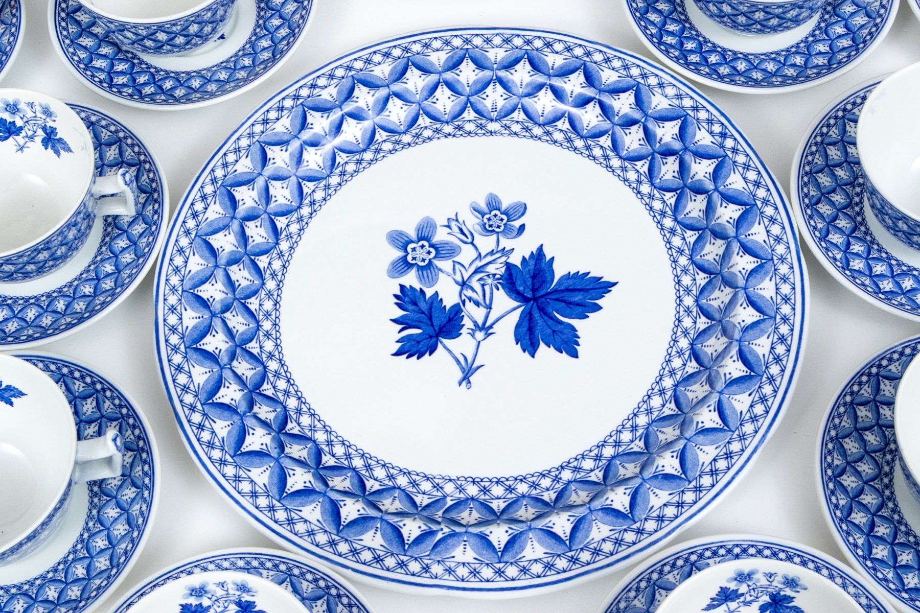 A sizable Spode "Geranium" china partial service beautifully decorated with monochromatic borders of petaled medallions and X-lattices surrounding sprays of flowers on leafy branches.
