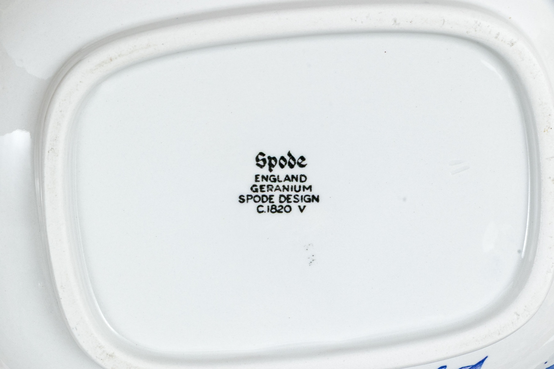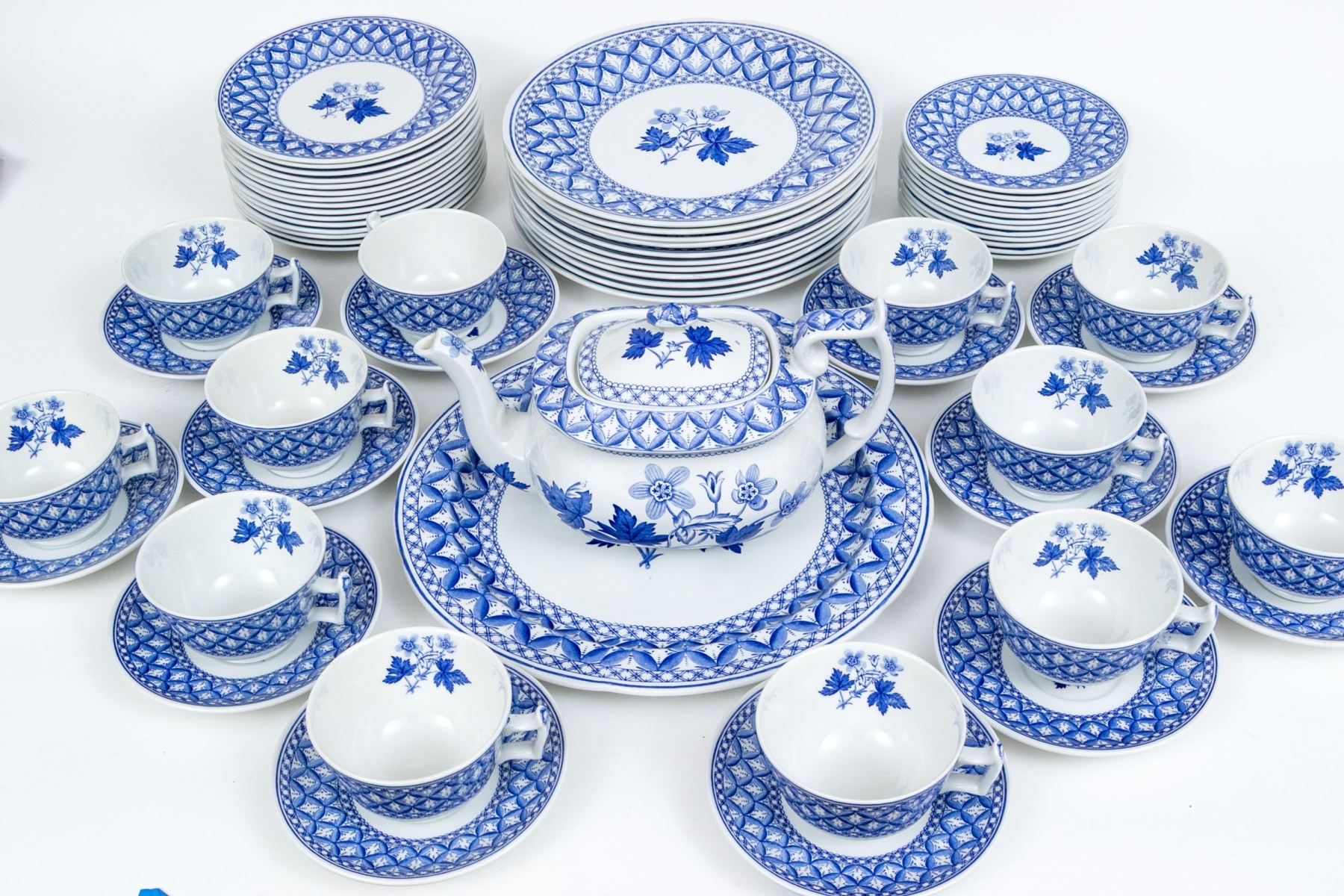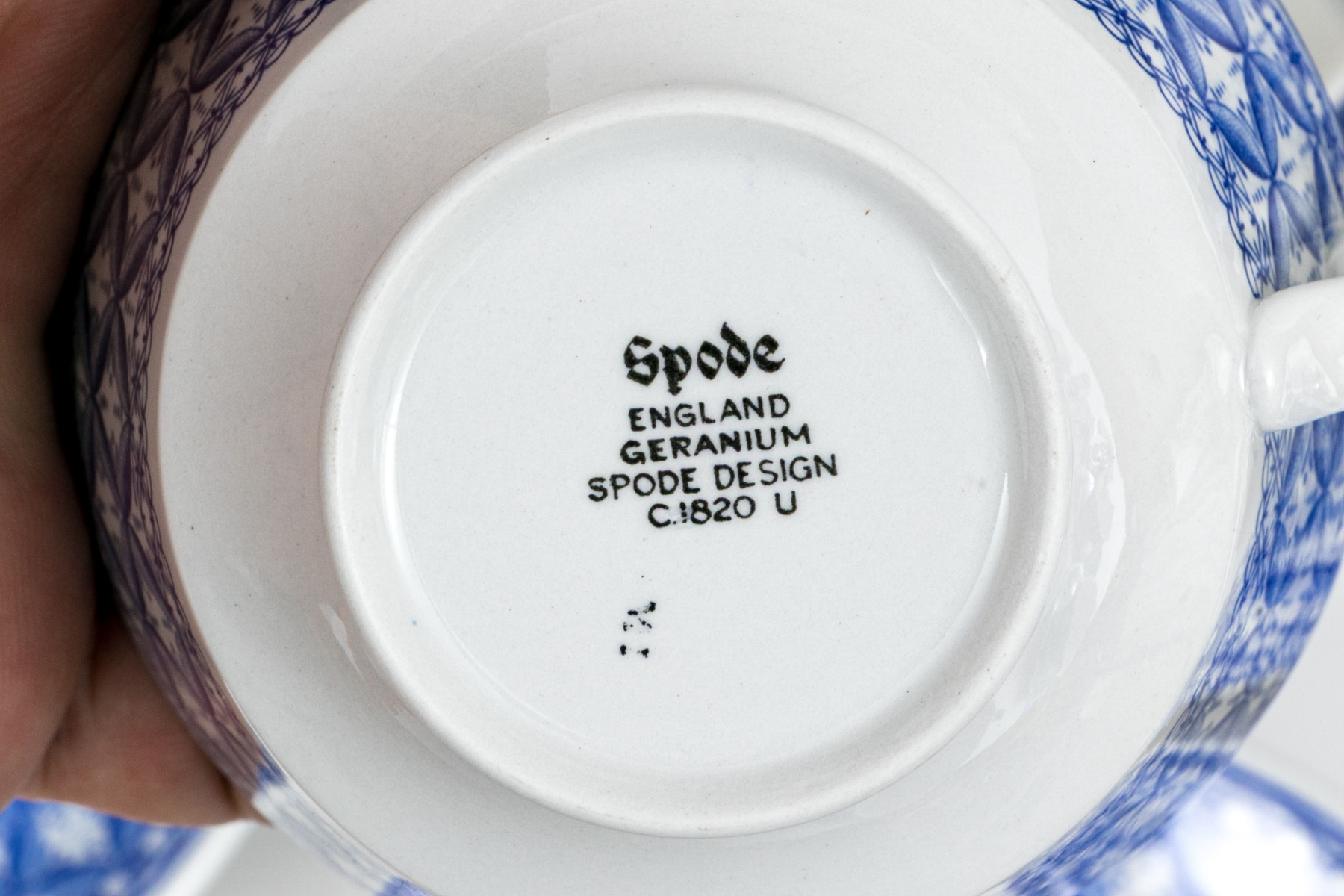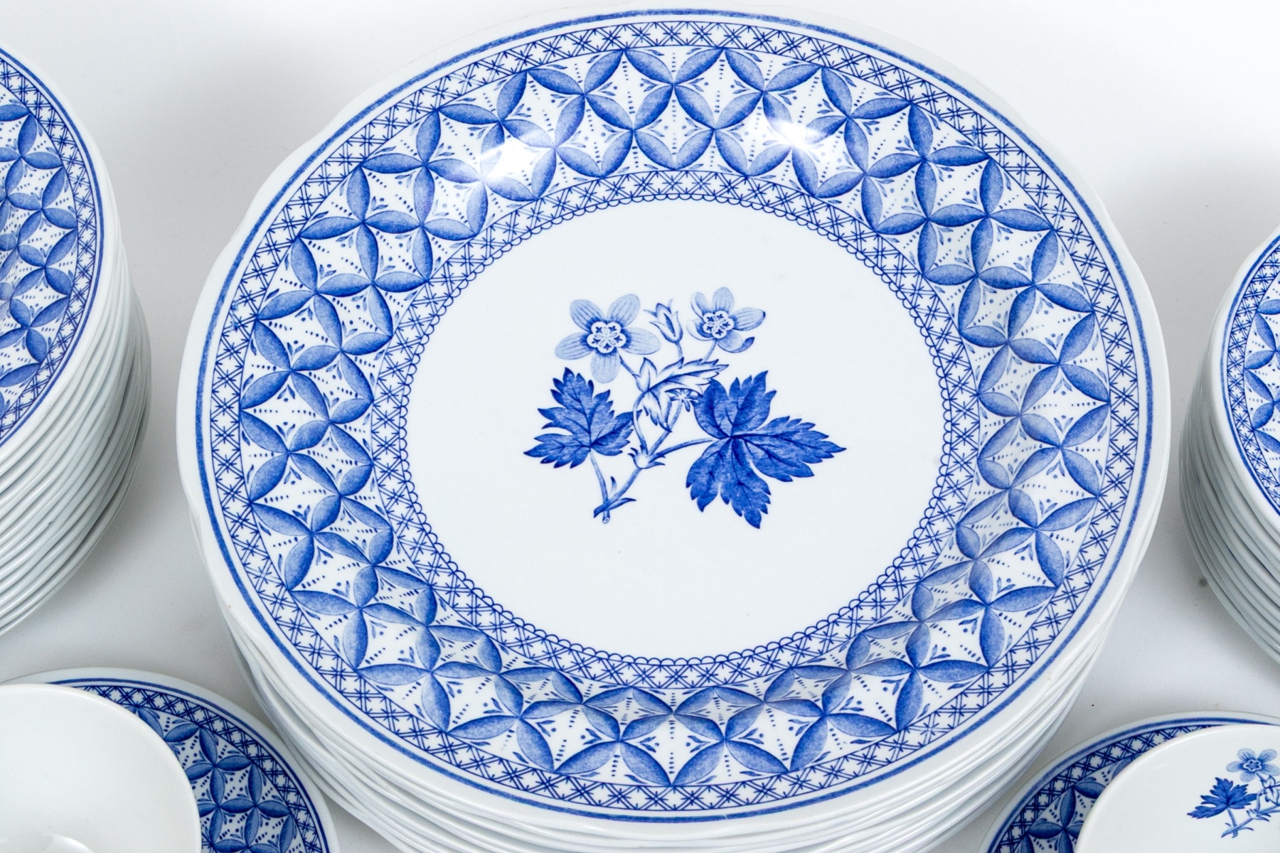 A sizable Spode "Geranium" china partial service beautifully decorated with monochromatic borders of petaled medallions and X-lattices surrounding sprays of flowers on leafy branches.