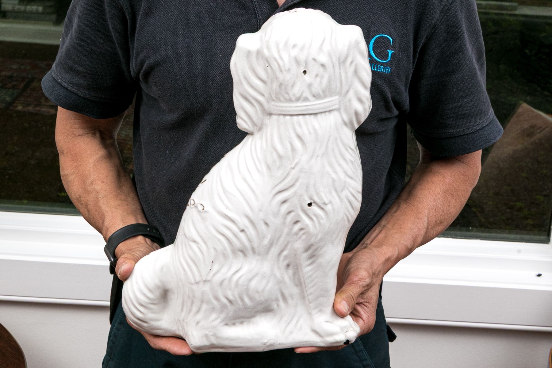 A classic Staffordshire ceramic figurine of a spaniel in bright white posed obediently seated with facing the left, with its head turned straight on at attention. Beautifully textured throughout the fur with gilt embellishment matching gilt eyes and a collar with a lock and chain motif.
