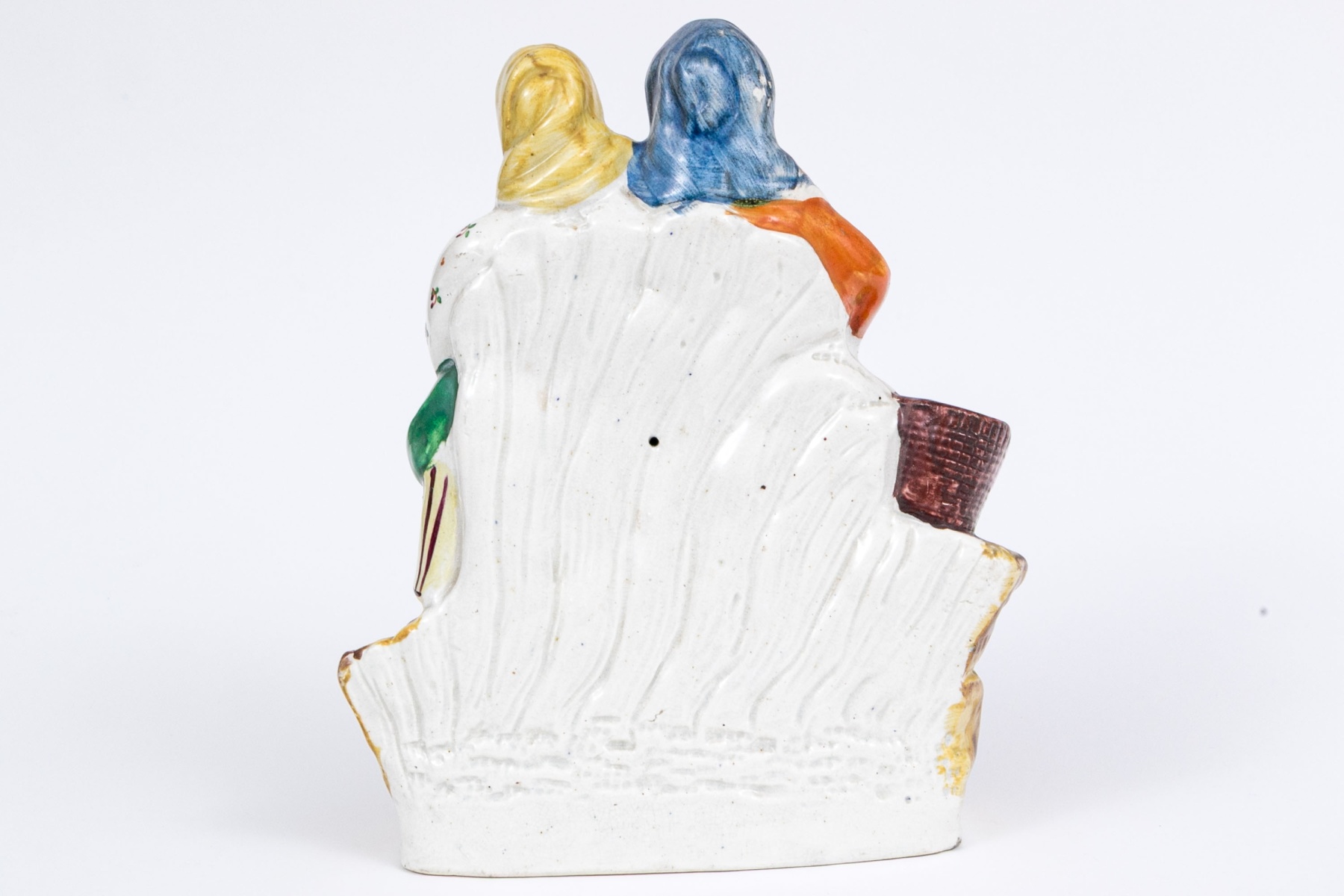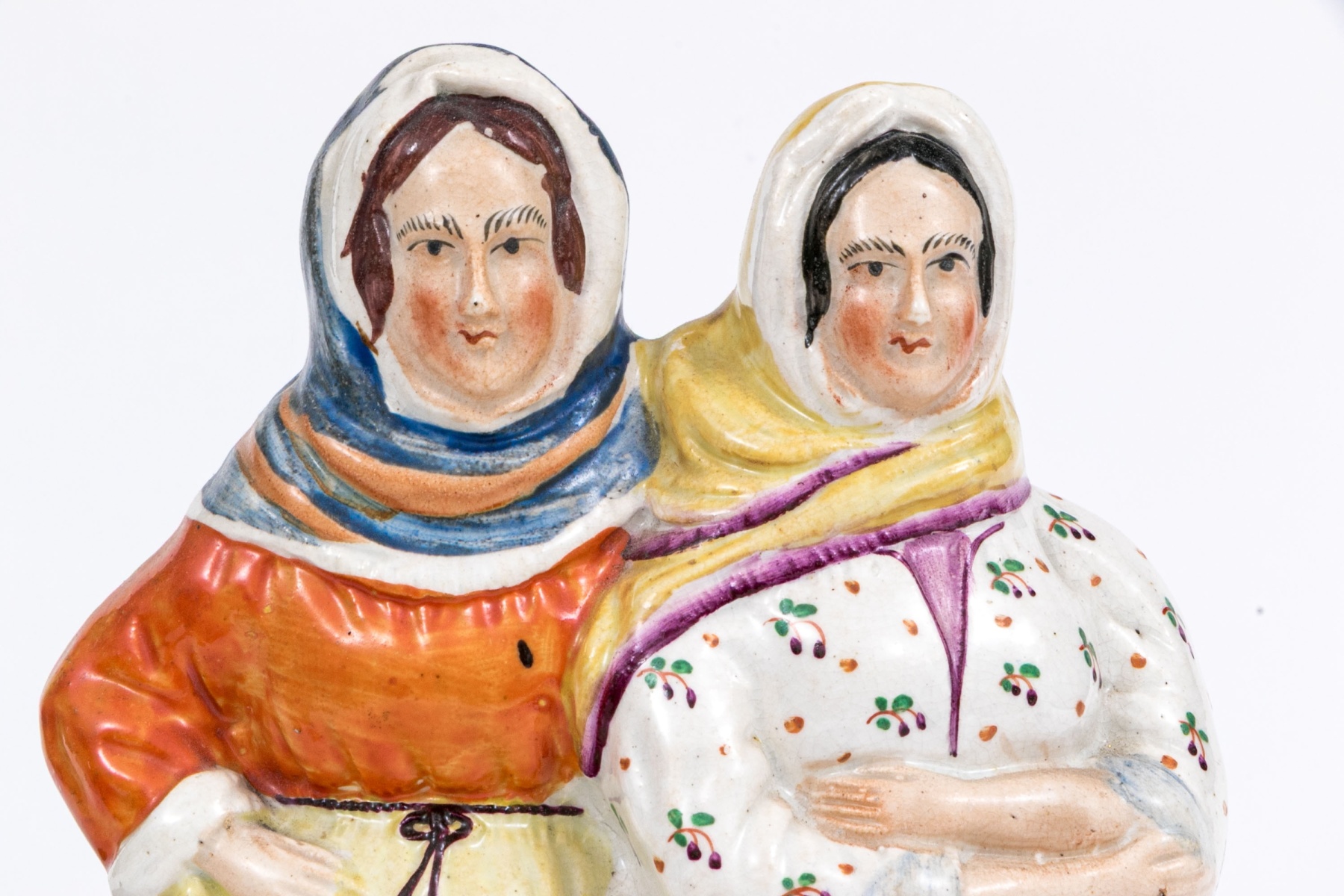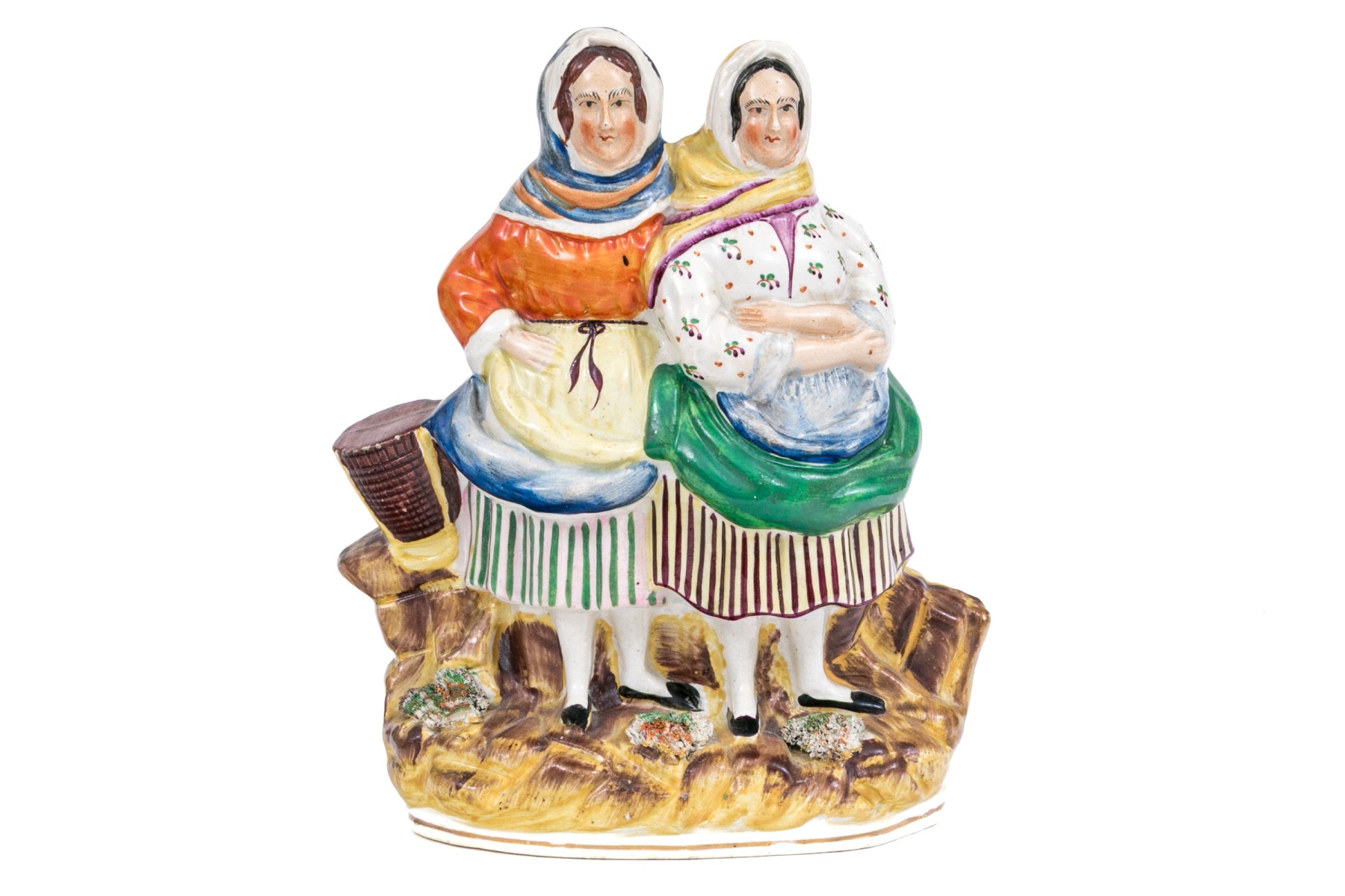 A 19th C., ca. 1820, hand-painted figural group depicting two fisher women, with fishing baskets in period attire. Both women stand next to one another on a singular oval platform base.