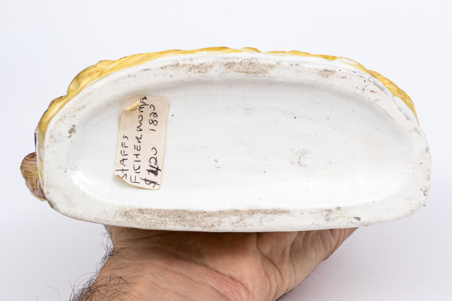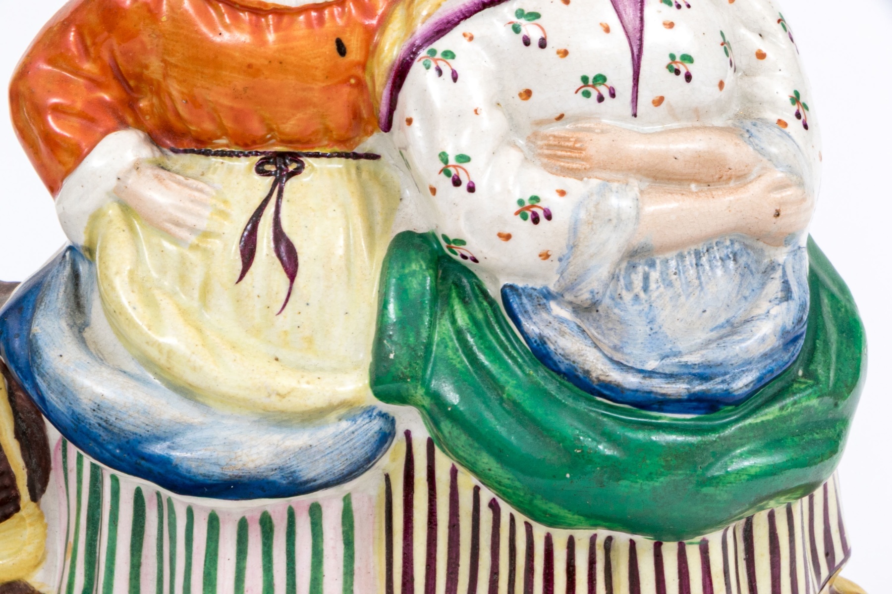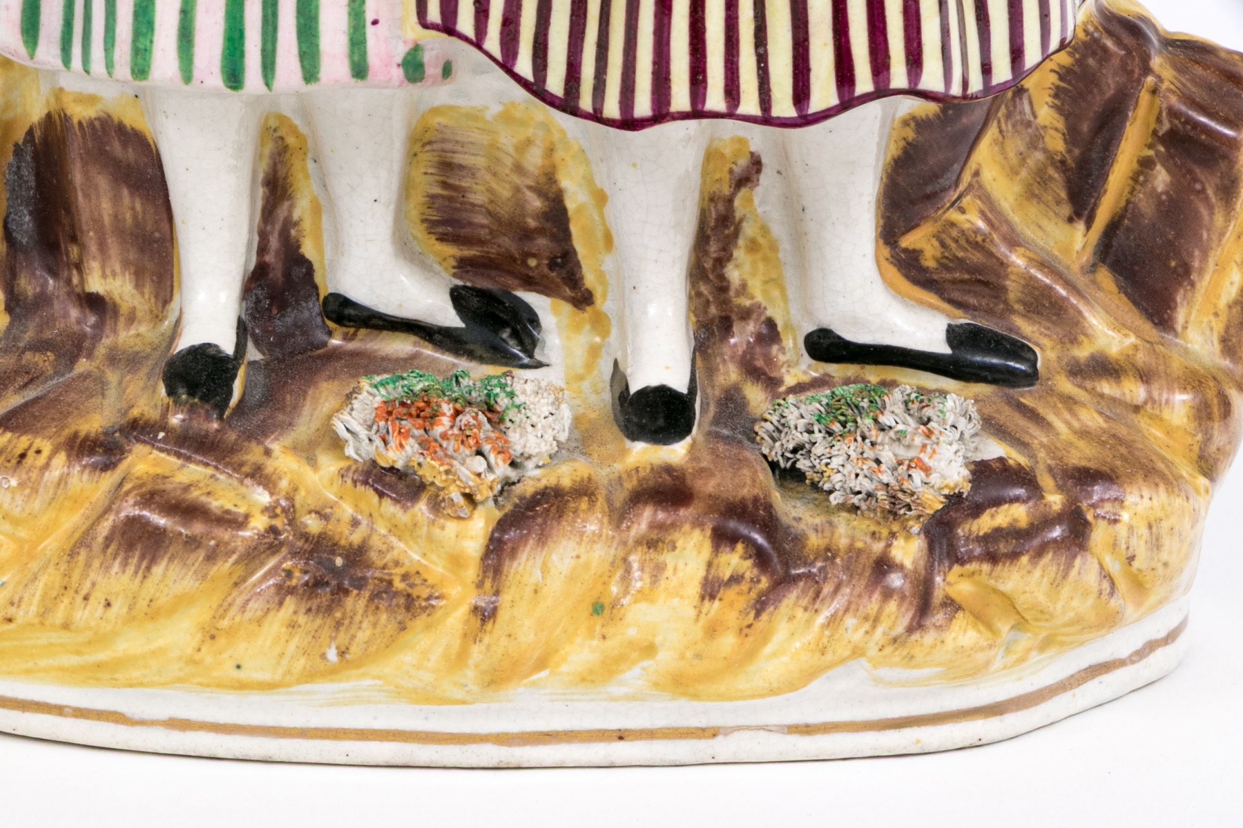 A 19th C., ca. 1820, hand-painted figural group depicting two fisher women, with fishing baskets in period attire. Both women stand next to one another on a singular oval platform base.