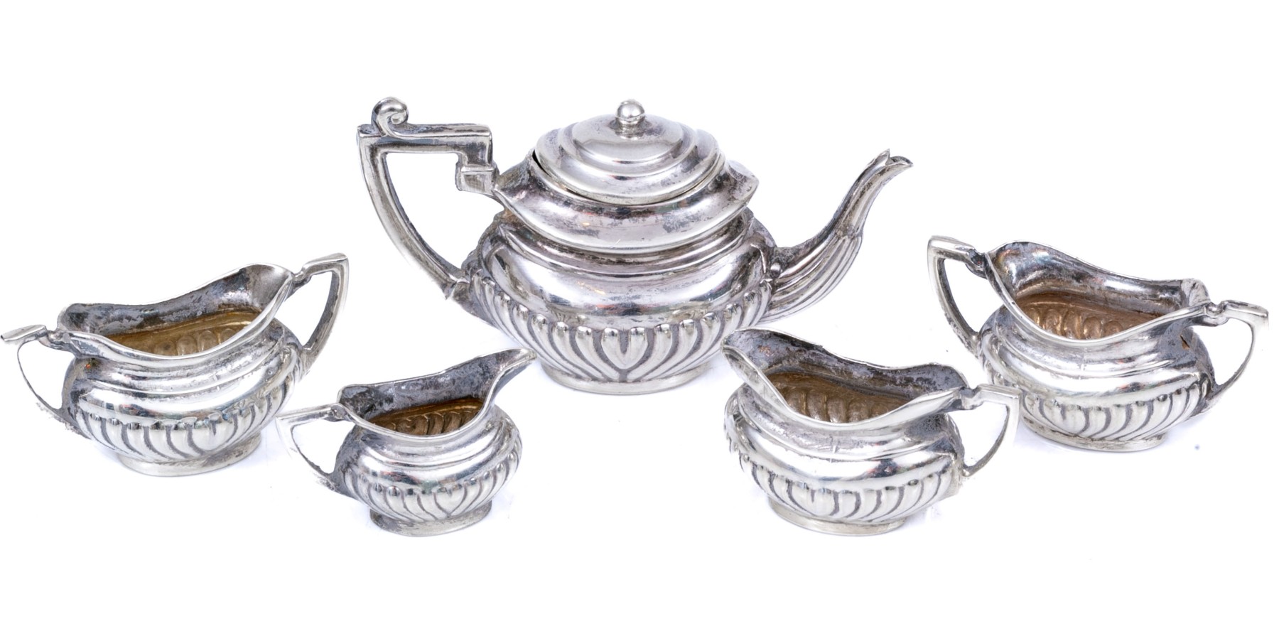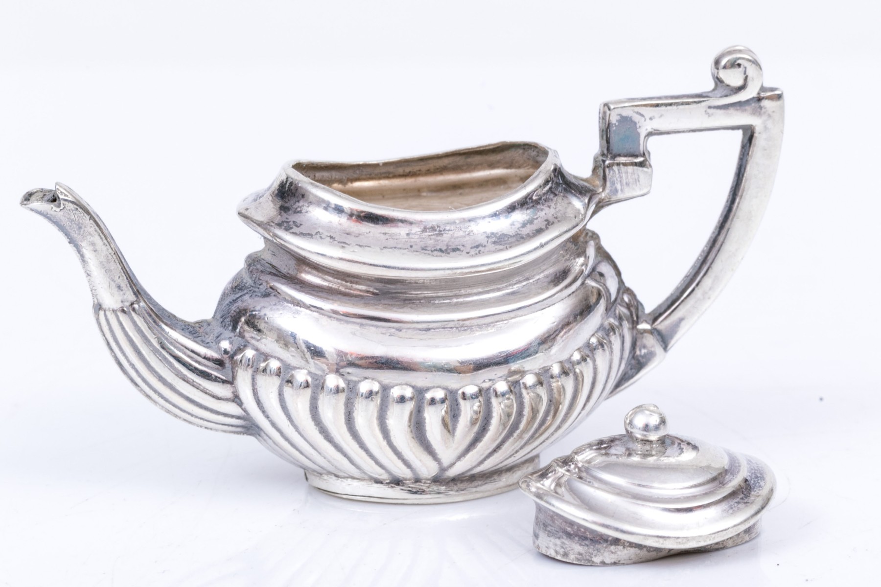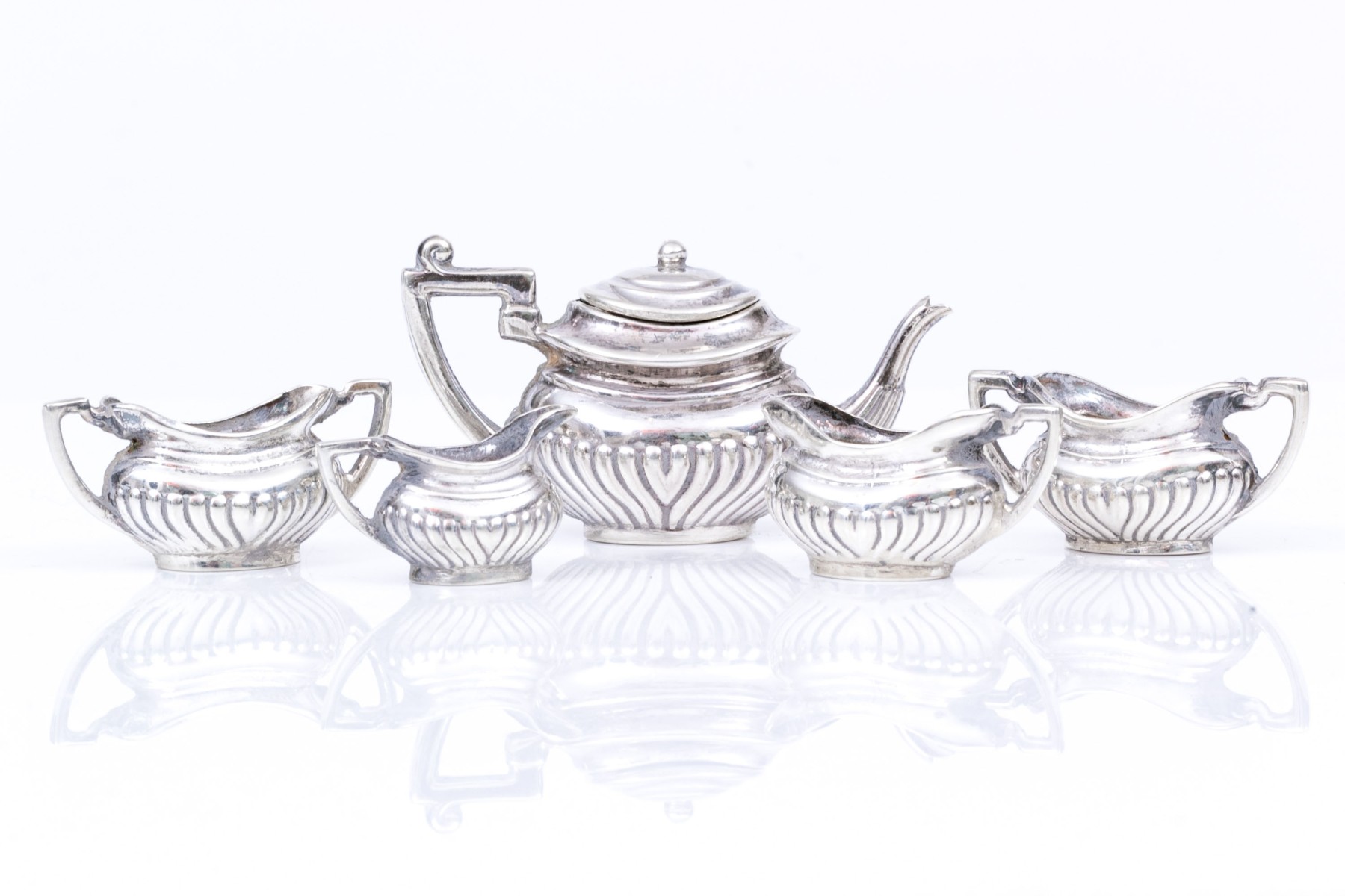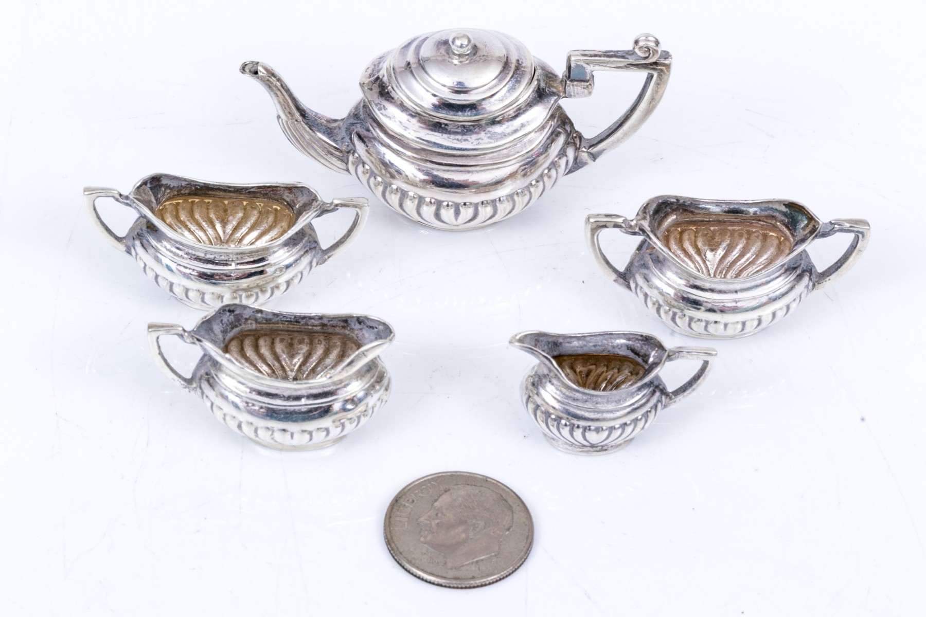 English sterling silver diminutive miniature tea set, featuring a tea pot, sugar, creamer, waster bowl and pitcher