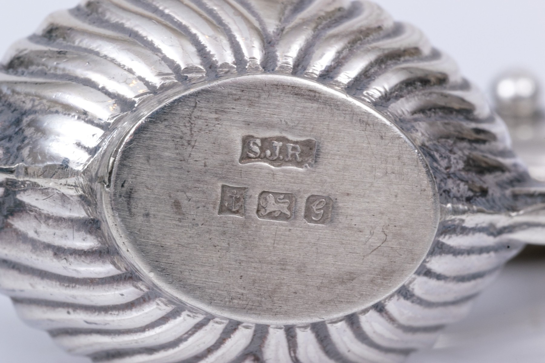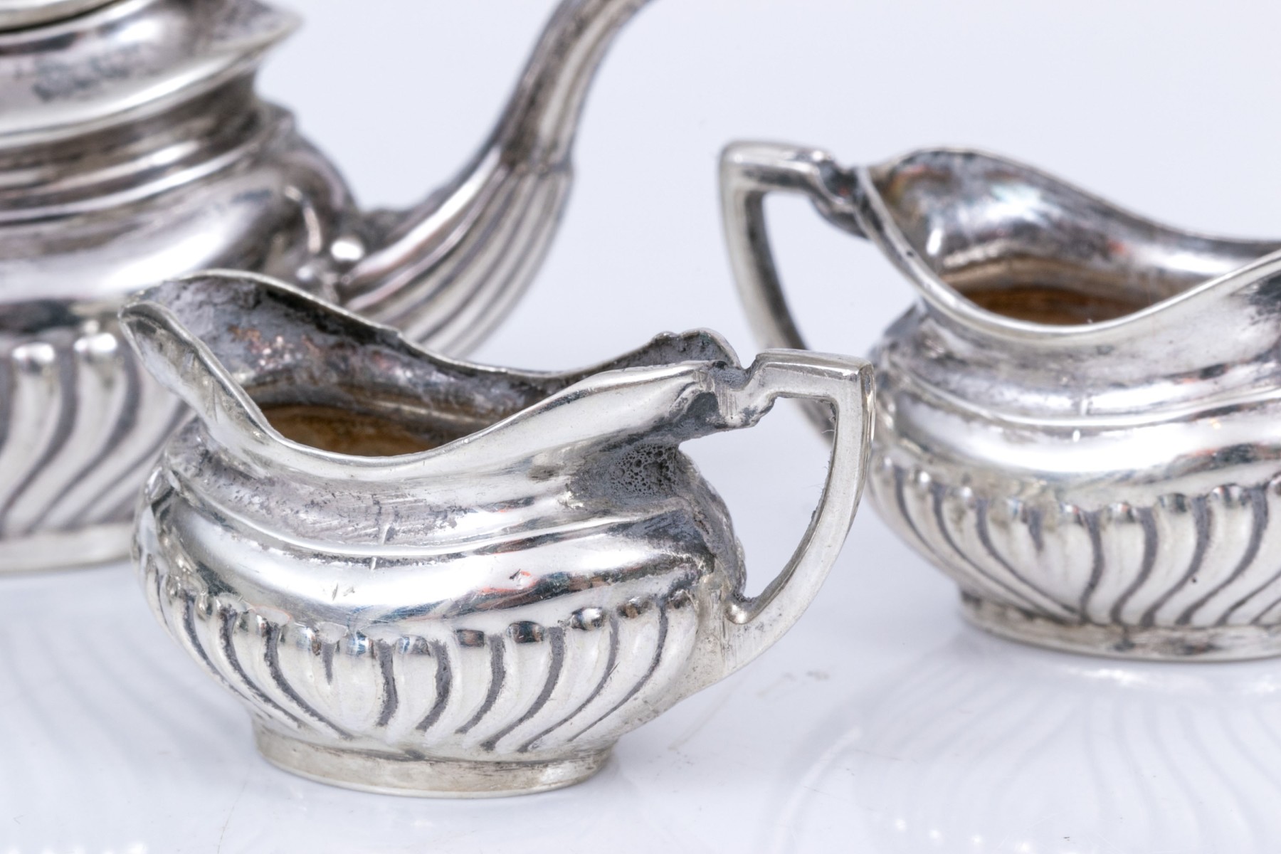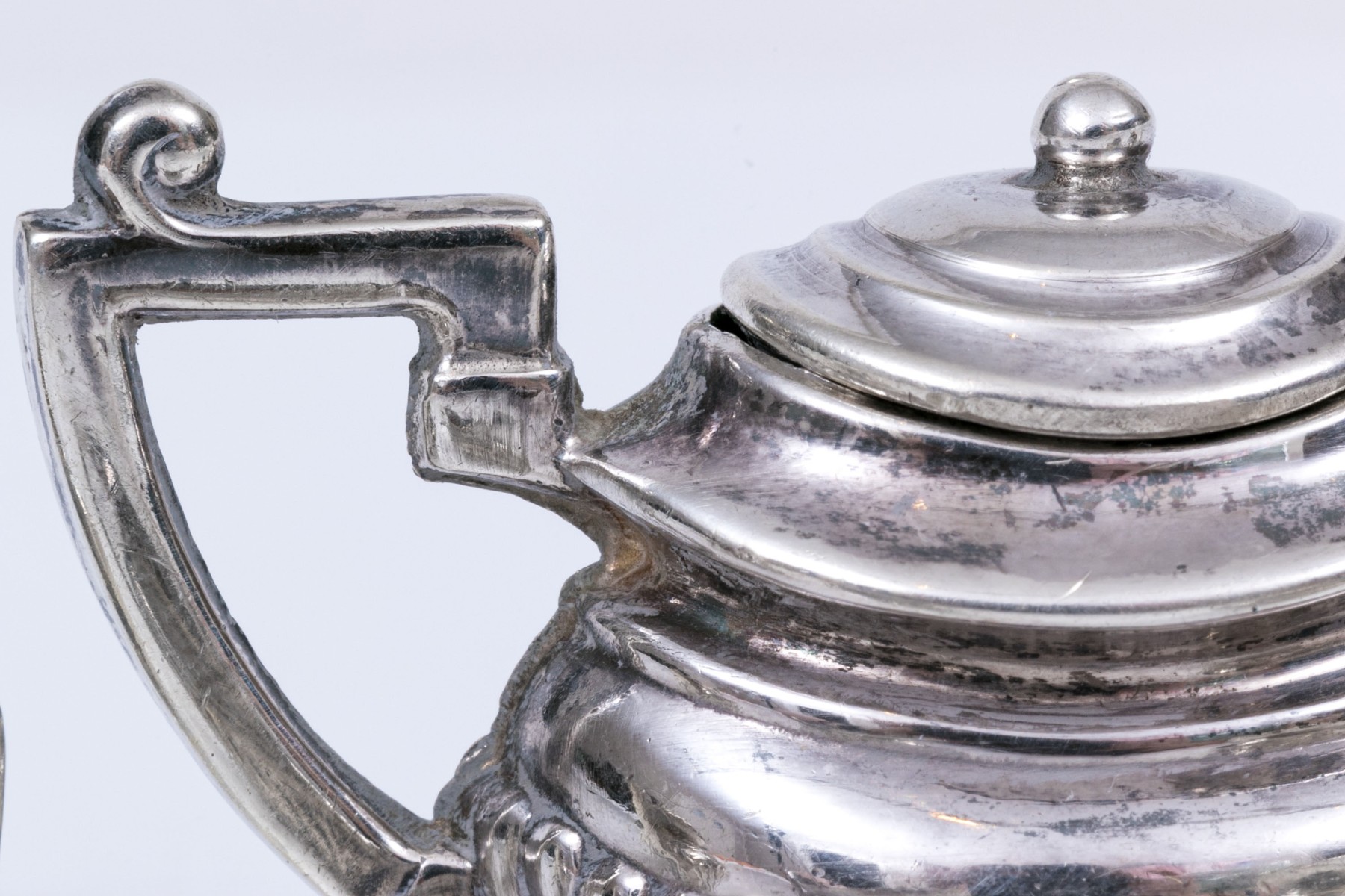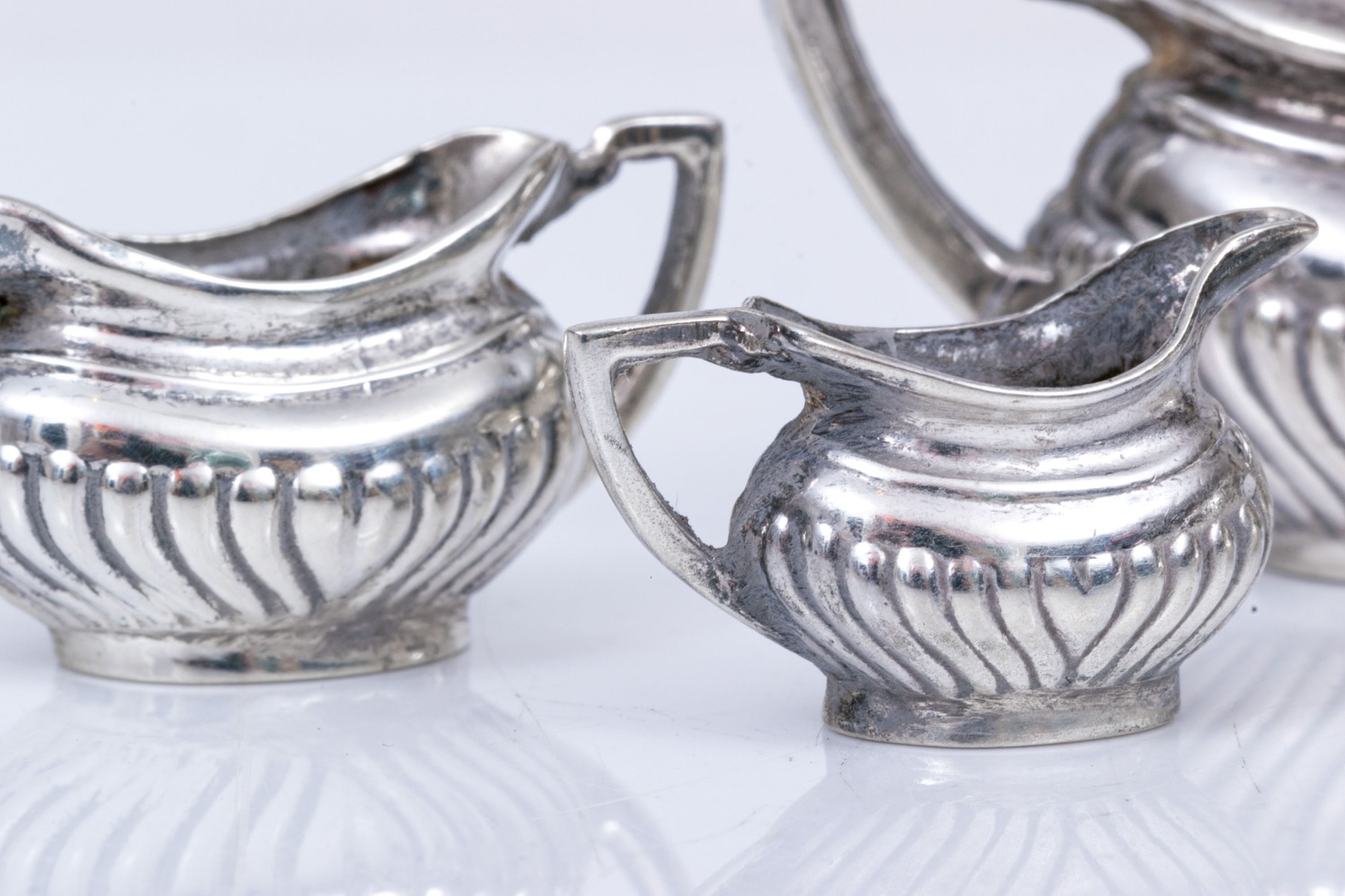 English sterling silver diminutive miniature tea set, featuring a tea pot, sugar, creamer, waster bowl and pitcher