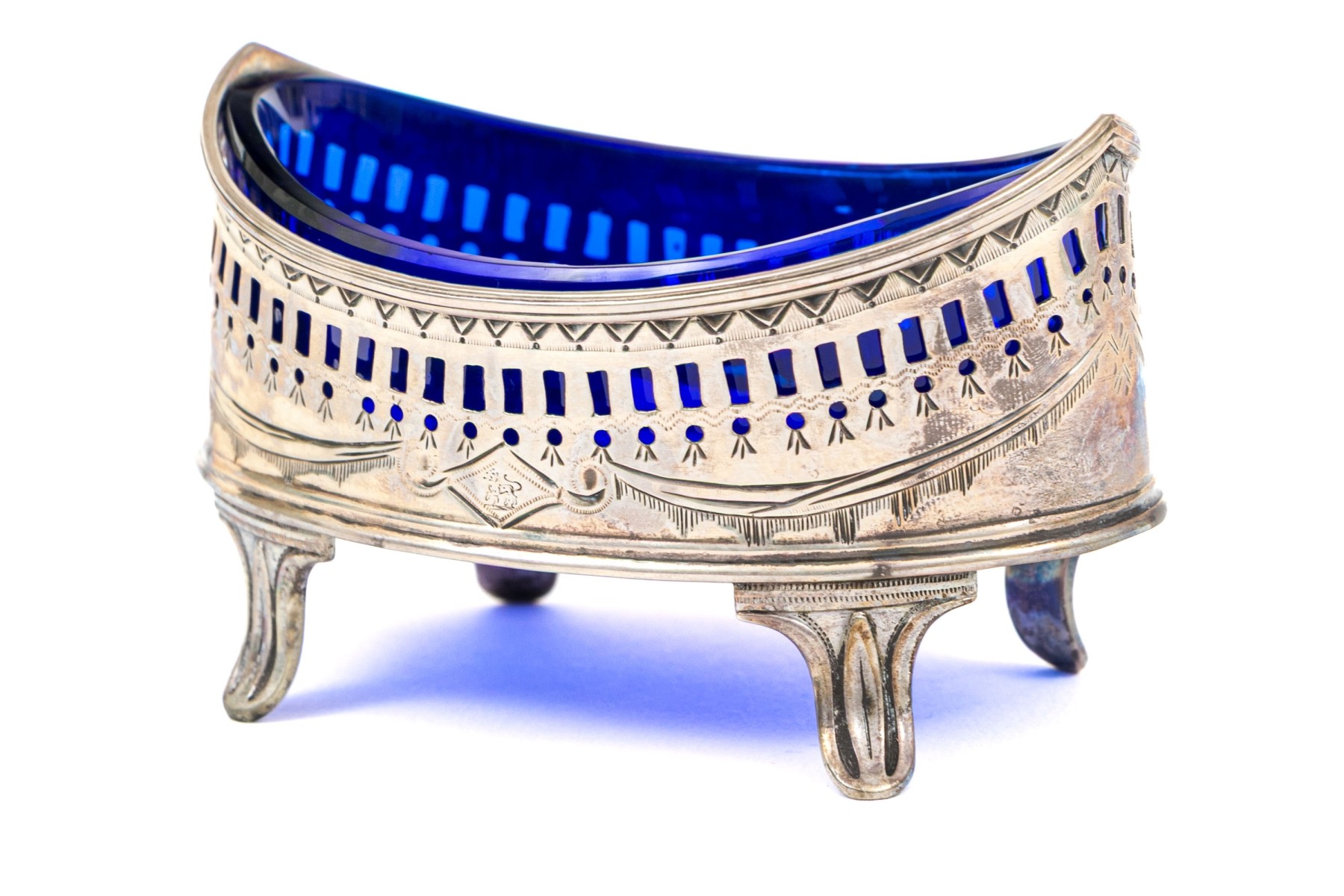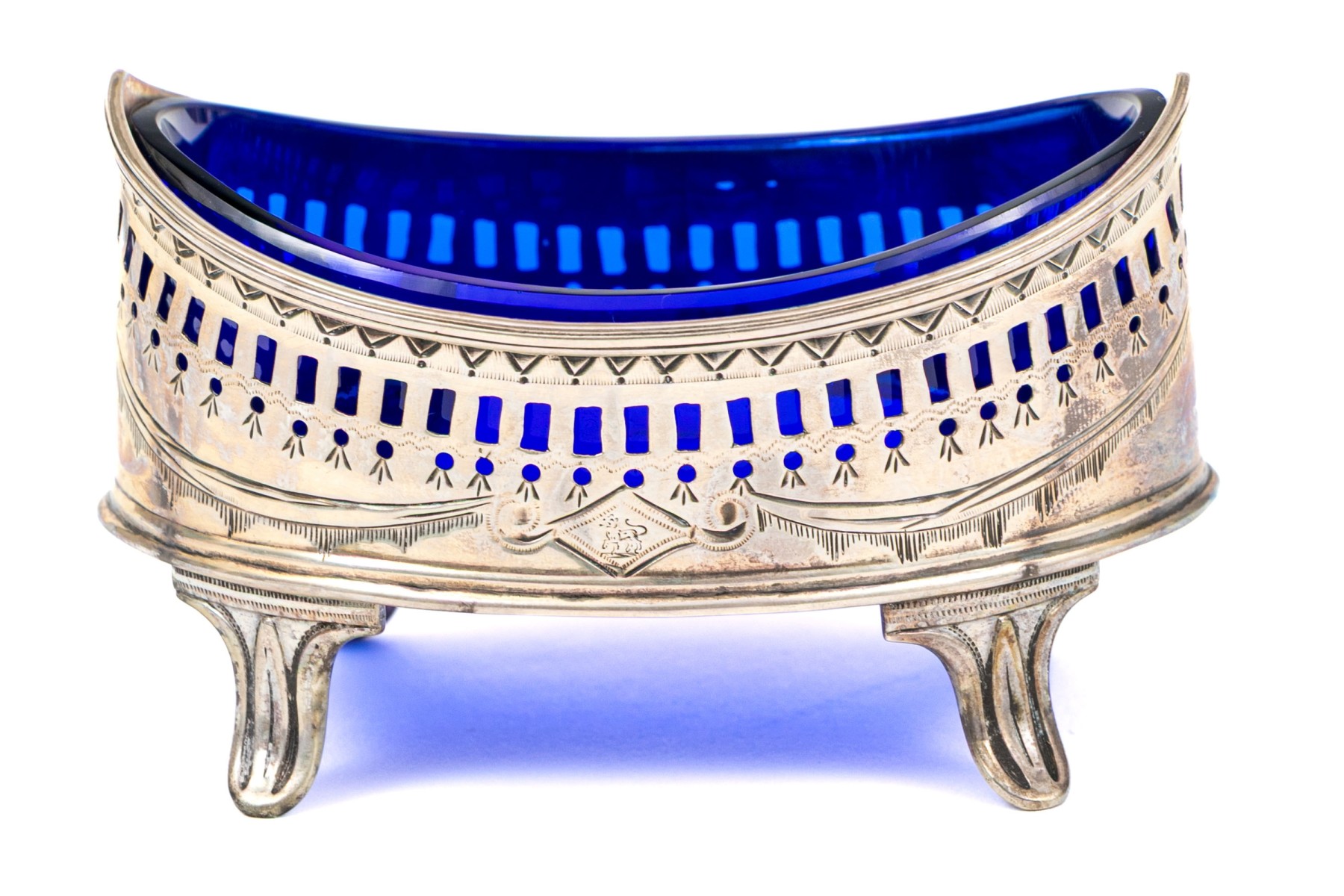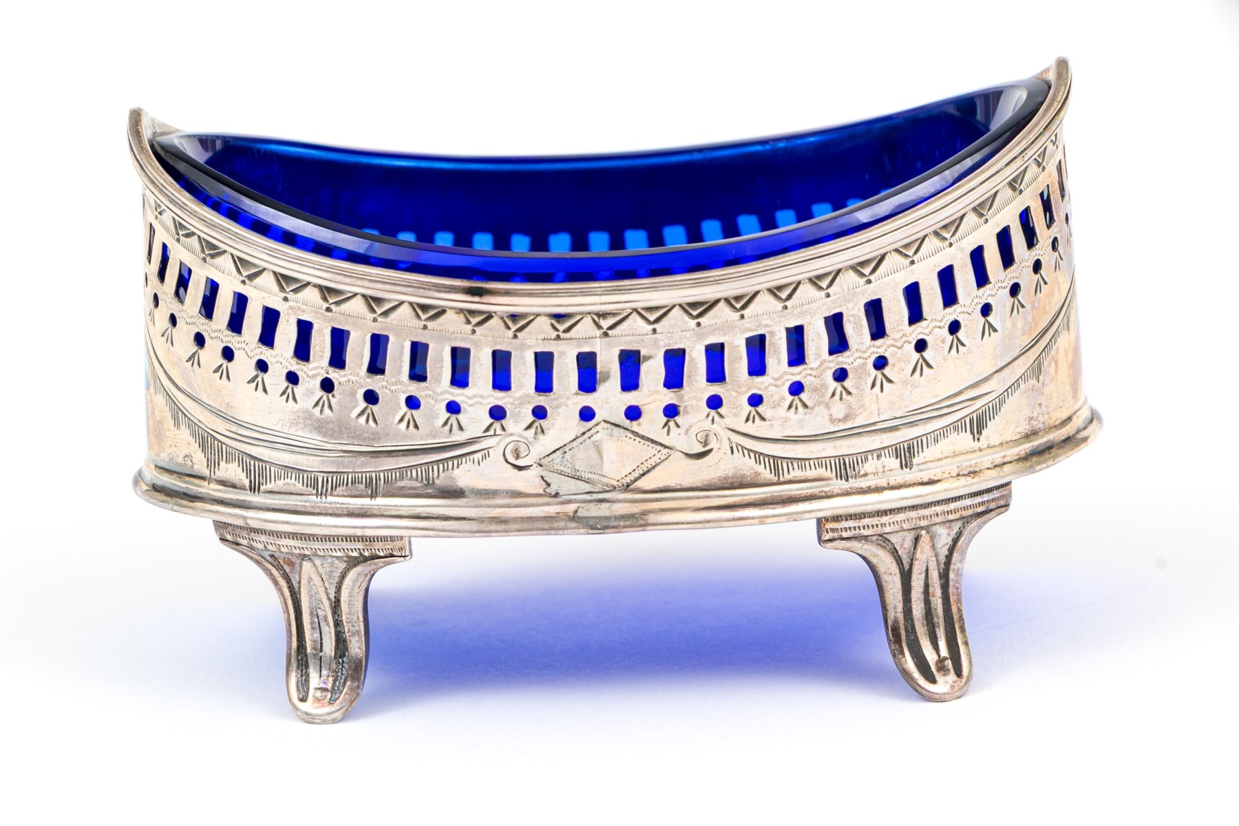 A classic English salt cellar featuring a cobalt glass liner in a sterling silver base. The cellar sports an elegant oval form with upwards swooping ends. The sterling base is hand-detailed with an upper border of triangular motifs, a pierced border of rectangles and circles, and lower border of swag-like arches flanking a central diamond medallion. Raised on gently flared and nicely decorated feet. Marked underneath.