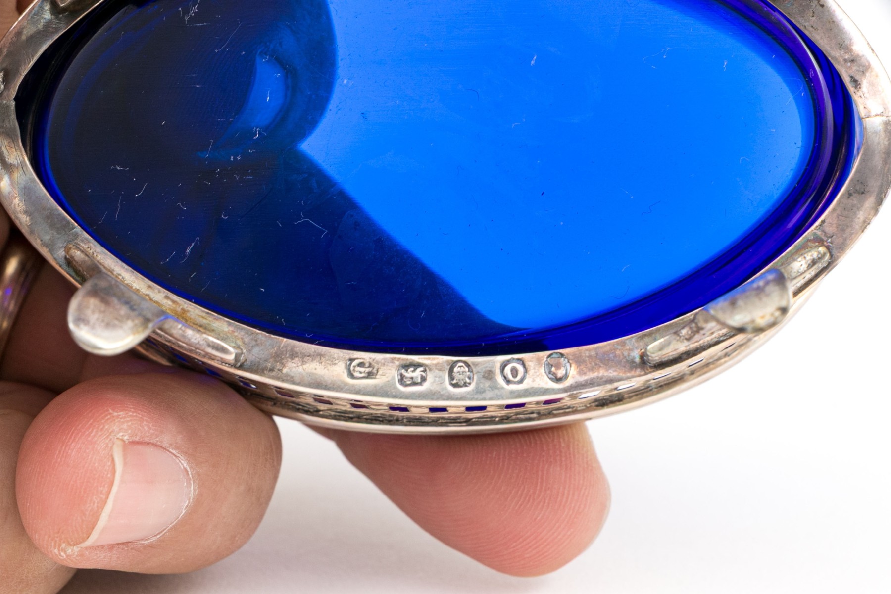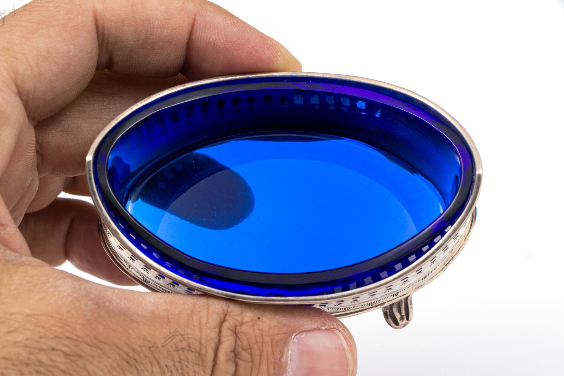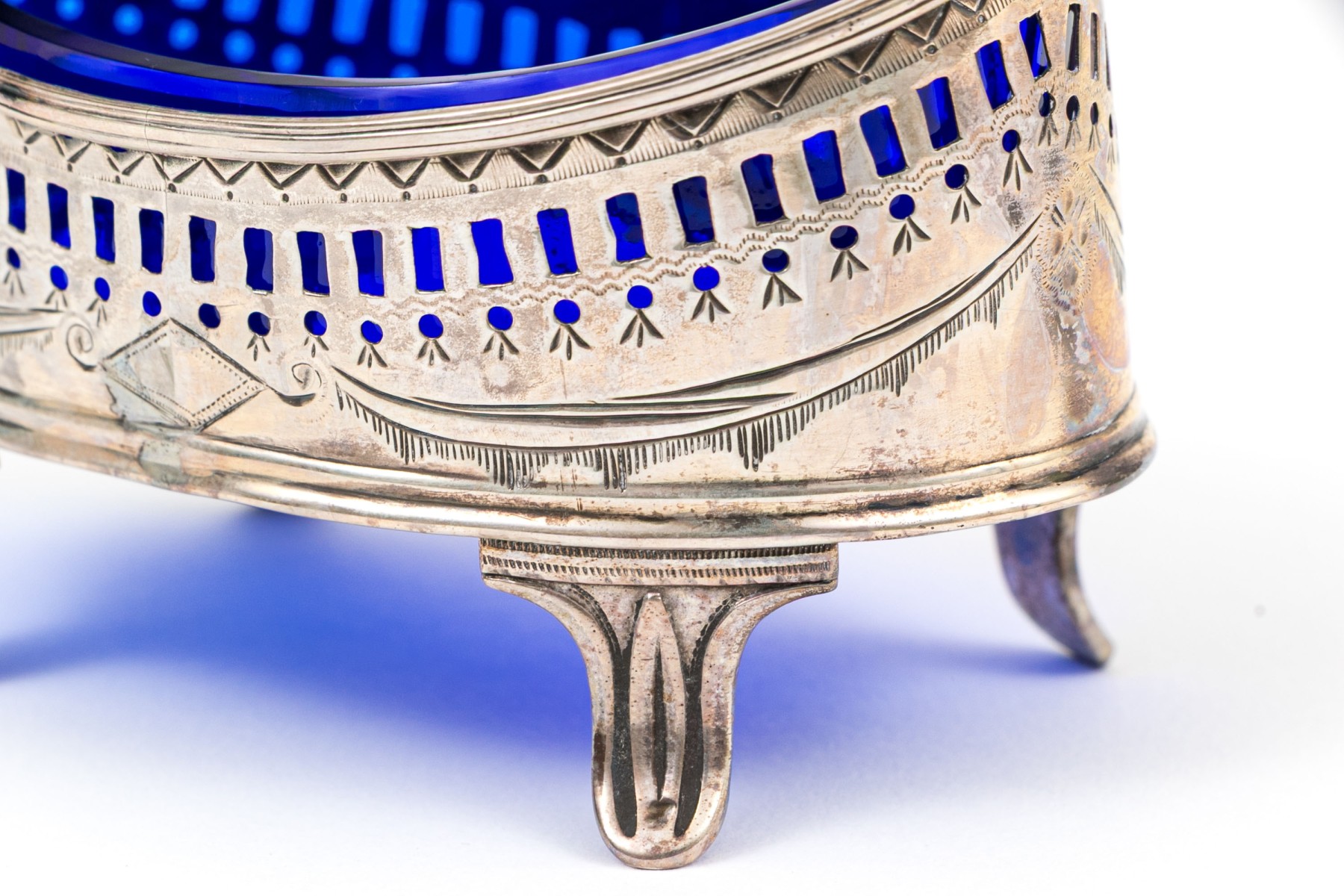 A classic English salt cellar featuring a cobalt glass liner in a sterling silver base. The cellar sports an elegant oval form with upwards swooping ends. The sterling base is hand-detailed with an upper border of triangular motifs, a pierced border of rectangles and circles, and lower border of swag-like arches flanking a central diamond medallion. Raised on gently flared and nicely decorated feet. Marked underneath.