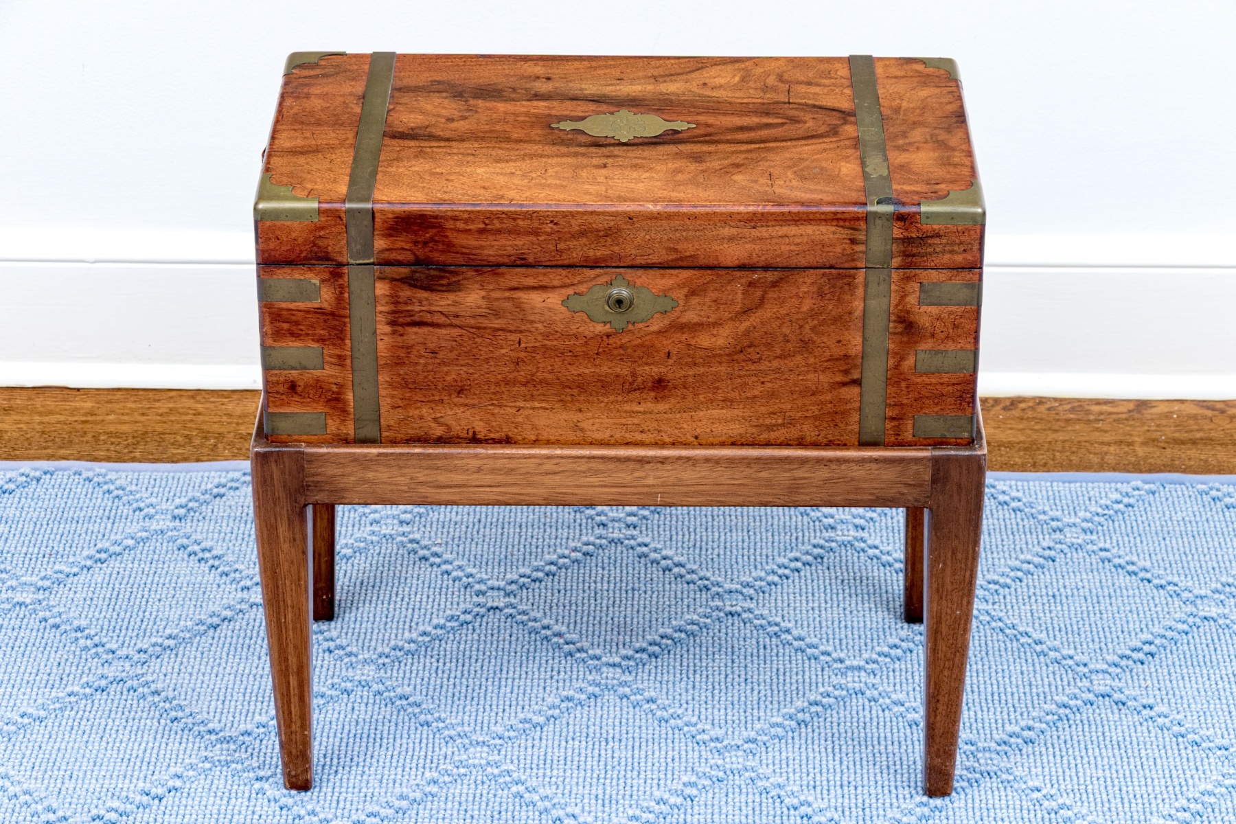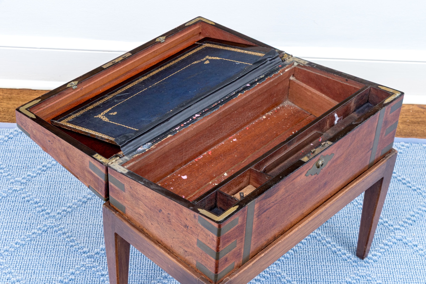 A fine Victorian campaign lap desk with stand circa 1850. The desk box is crafted in warm-toned medium brown mahogany with striking inlaid brass brackets, opening to a blue leather lined writing surface with gilt tooled borders concealing storage beneath. The desk box fits into a simple matching stand with straight, tapered legs.