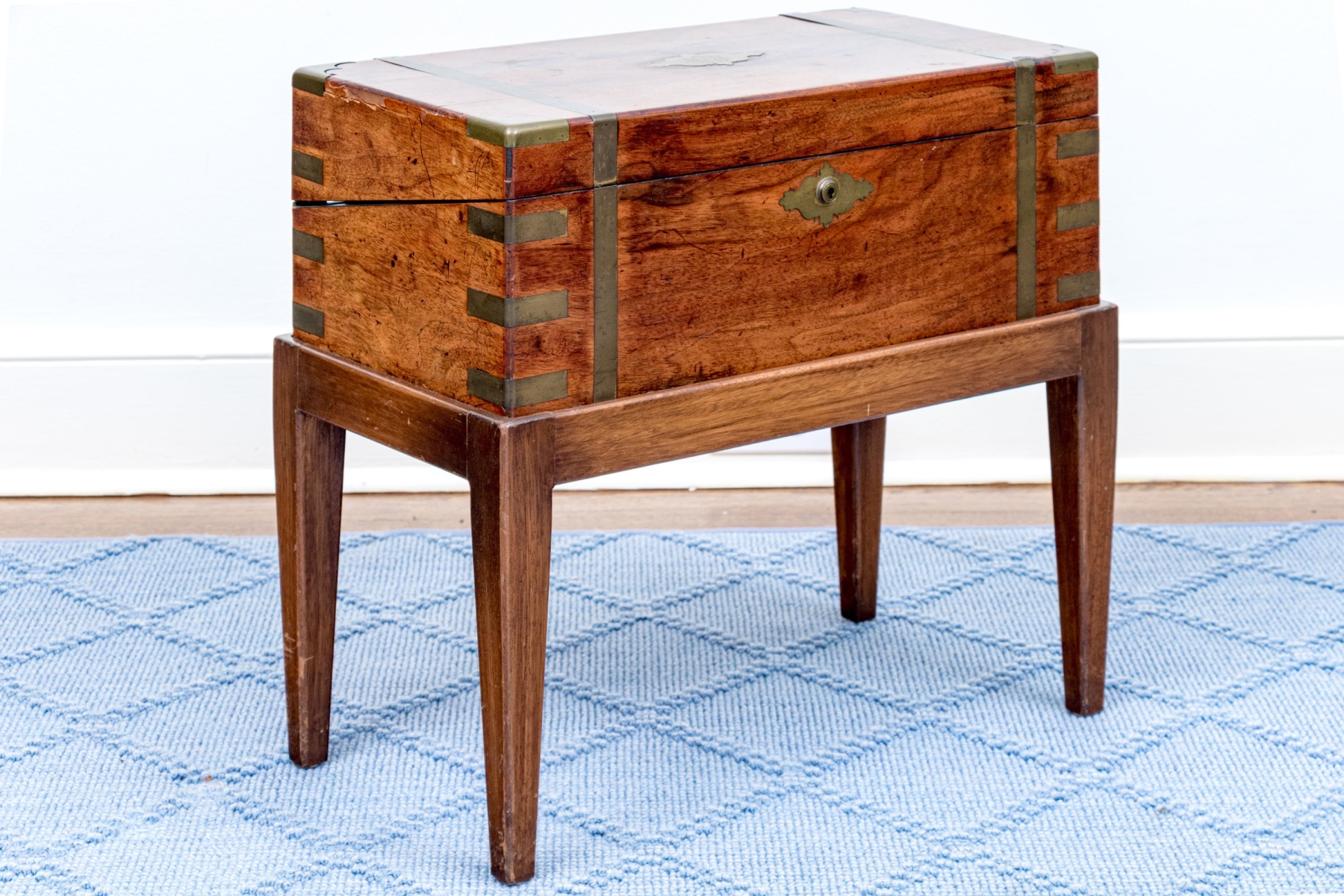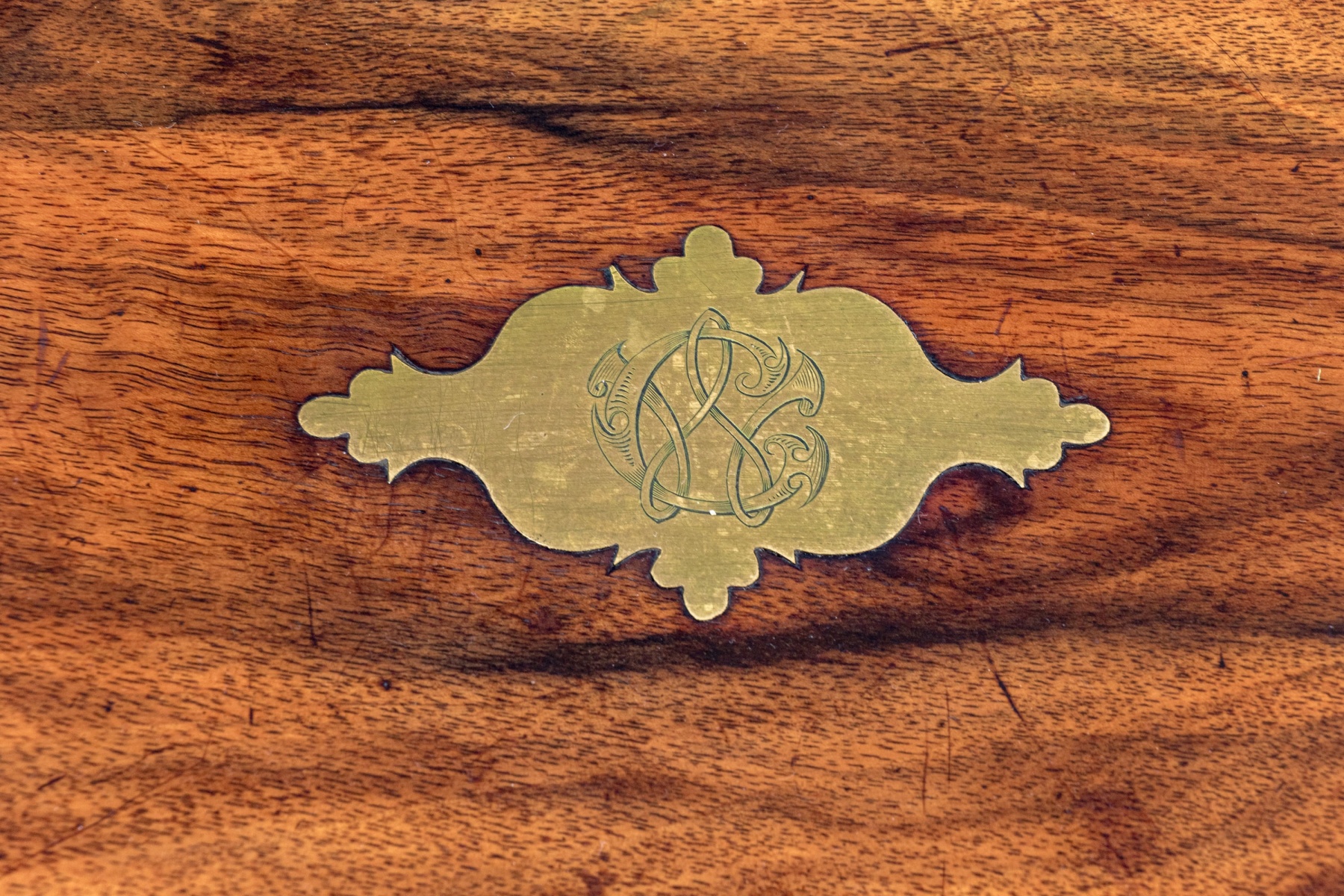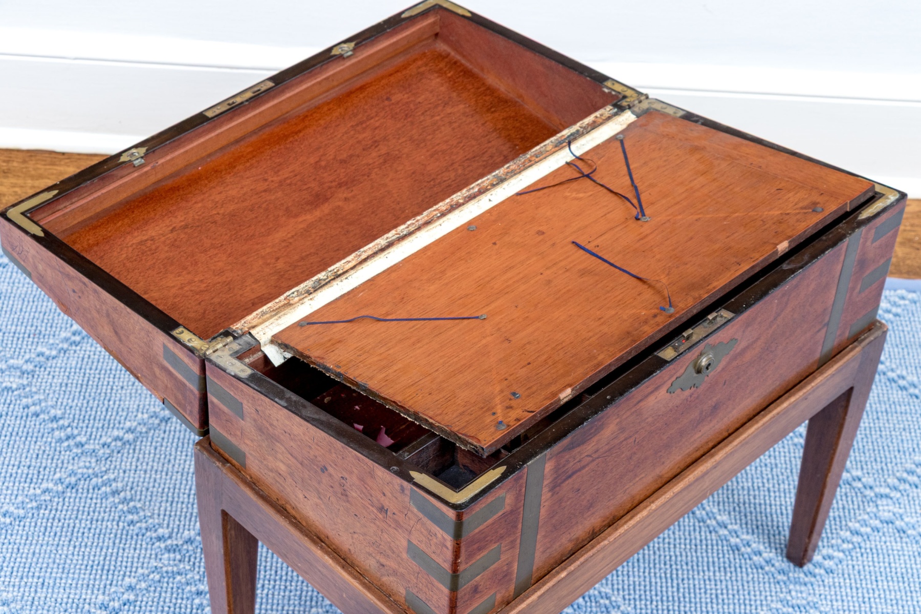 Interior with losses and loose sections in need of refurbishment. Wear is commensurate with age and use, but overall still a very handsome piece.