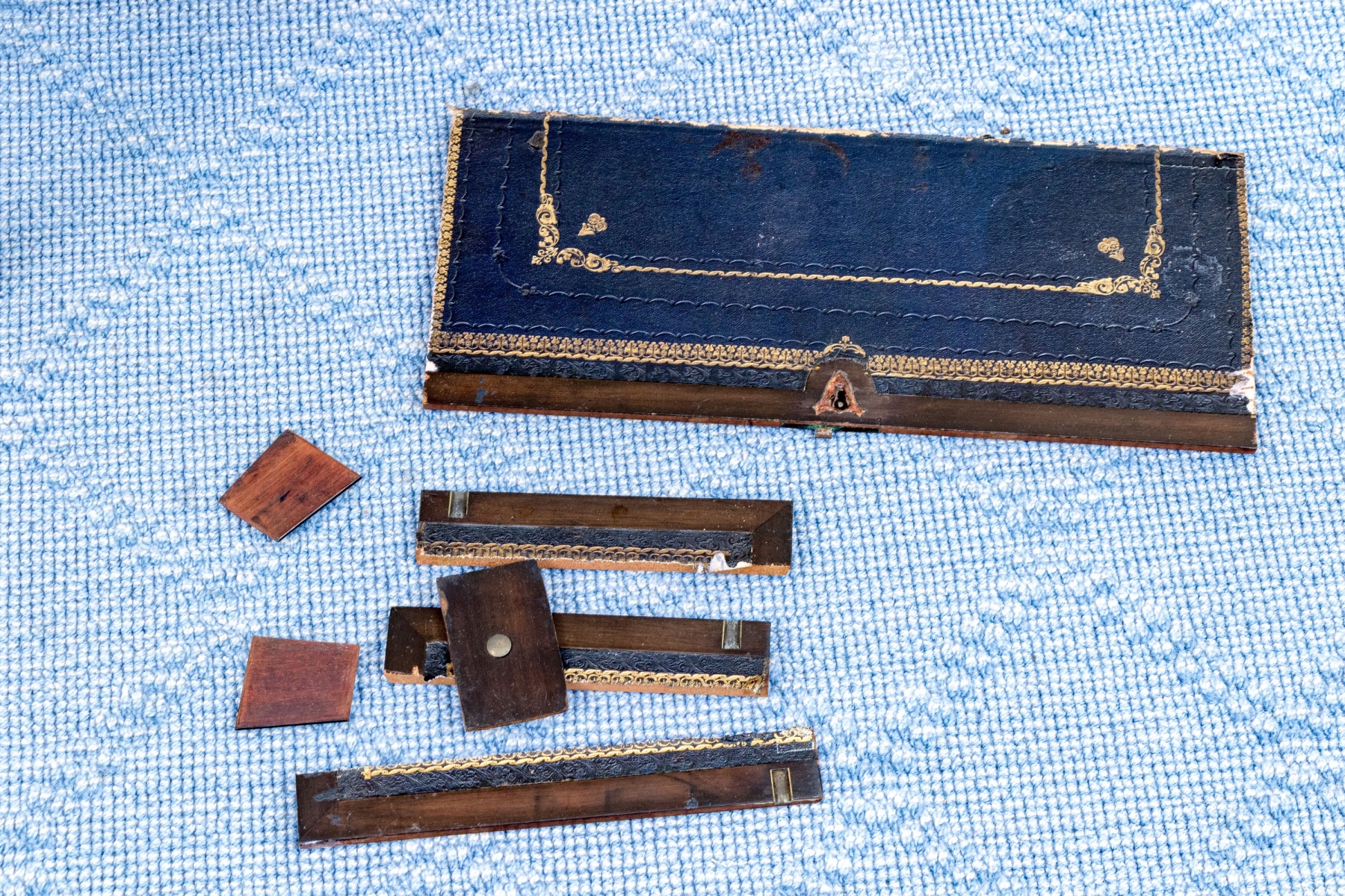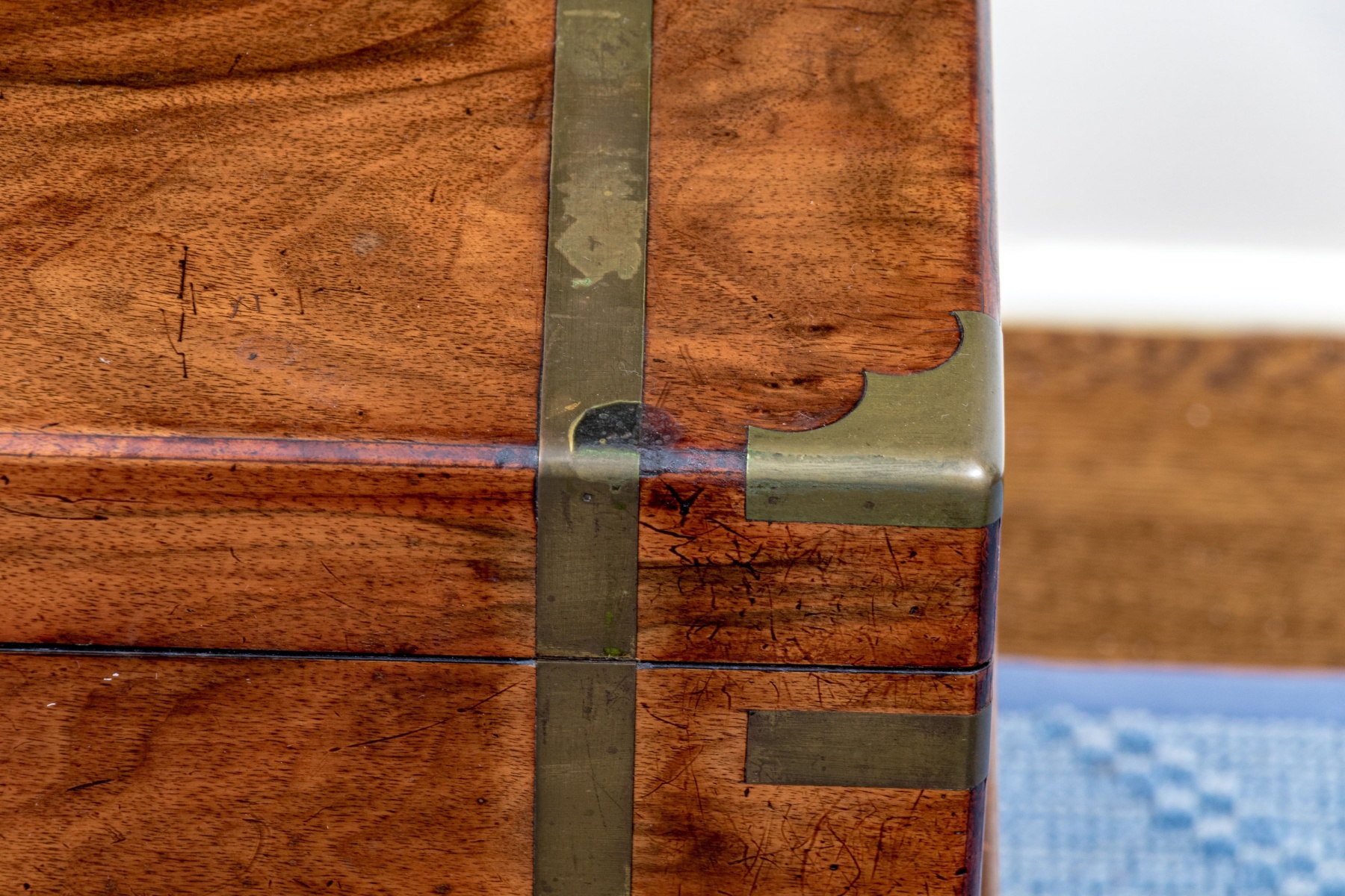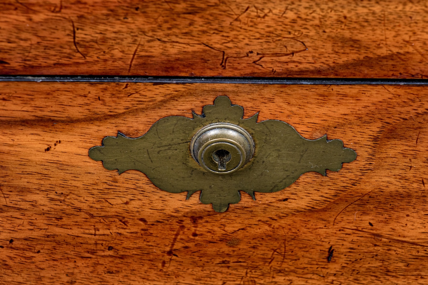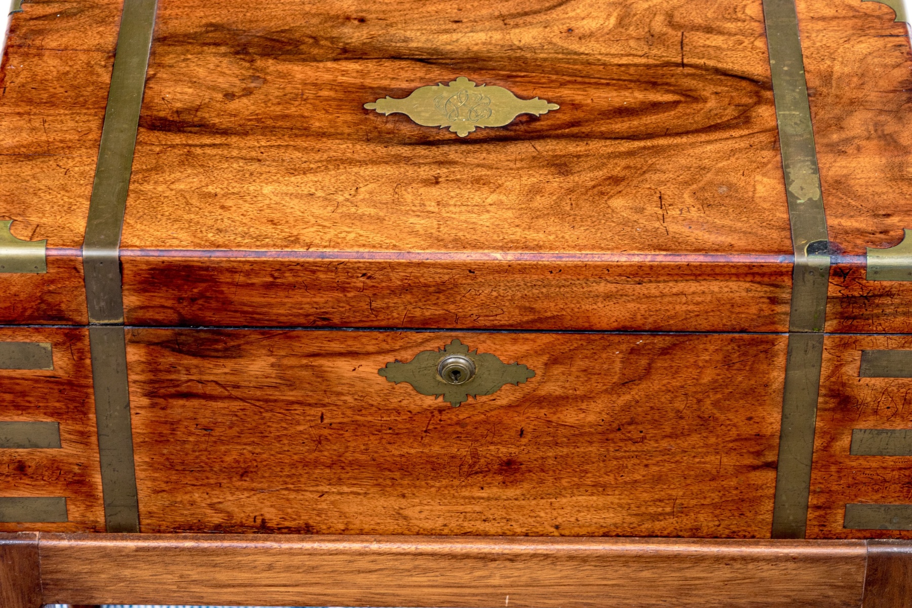 Interior with losses and loose sections in need of refurbishment. Wear is commensurate with age and use, but overall still a very handsome piece.