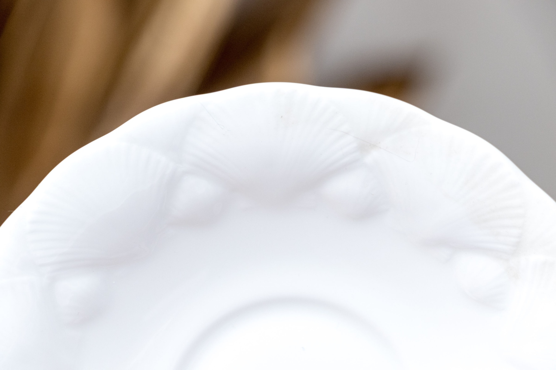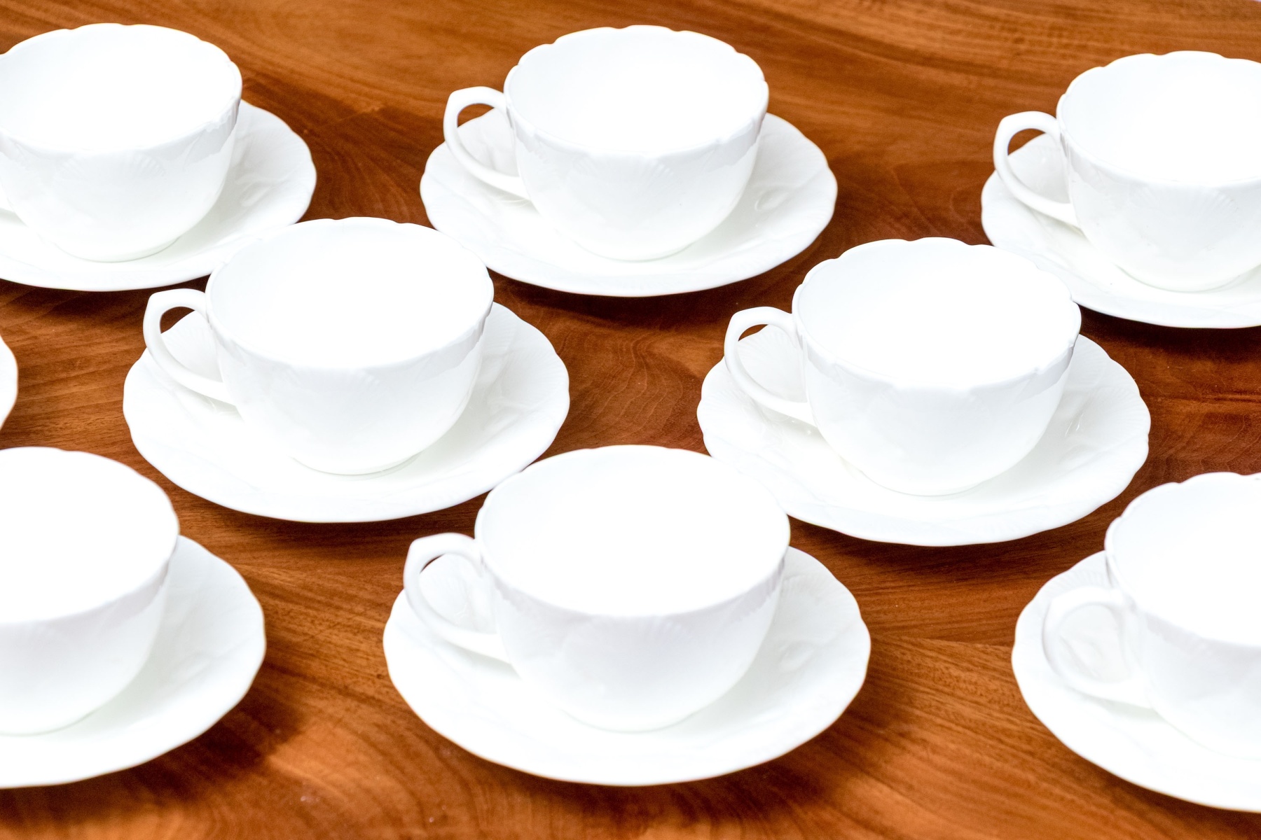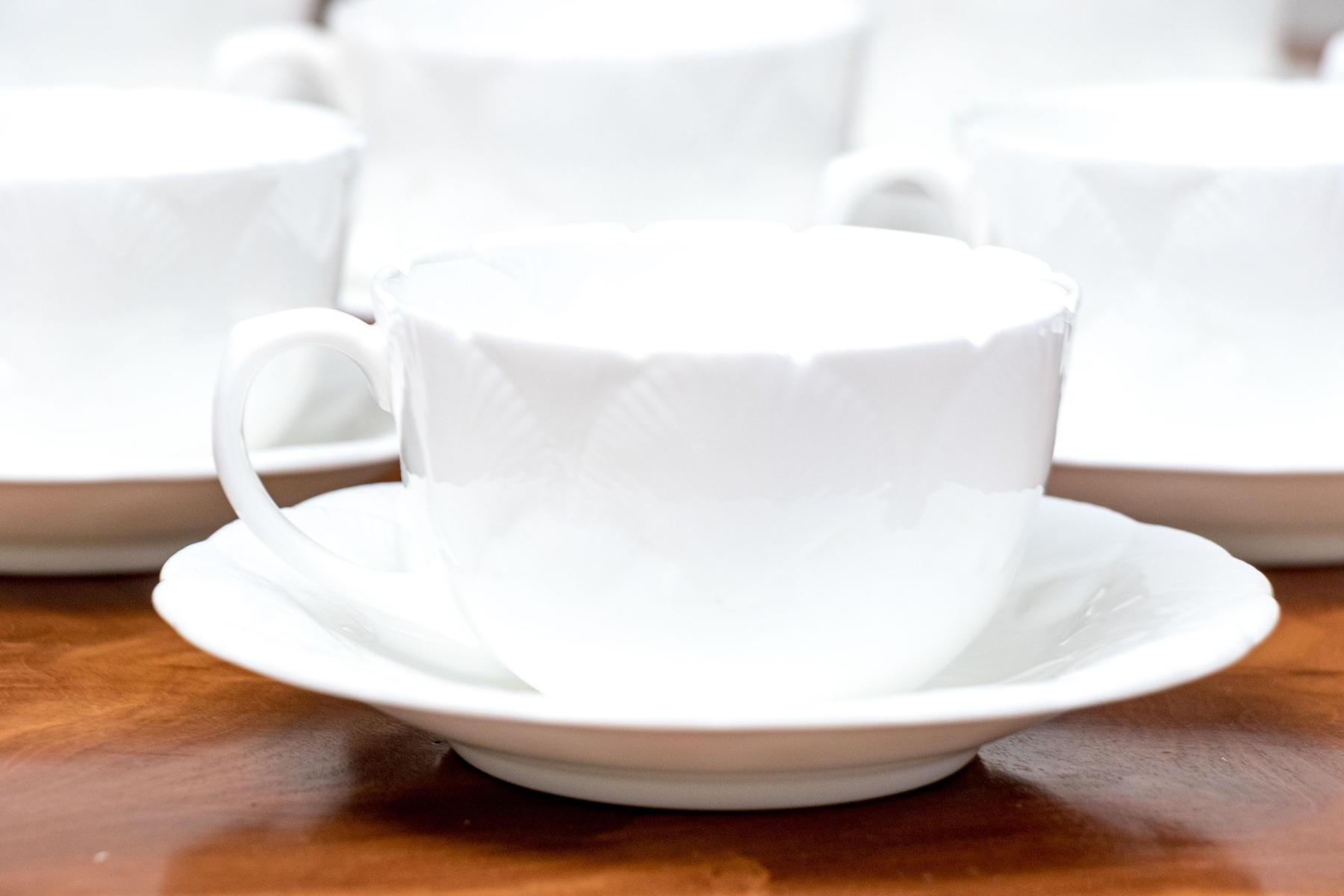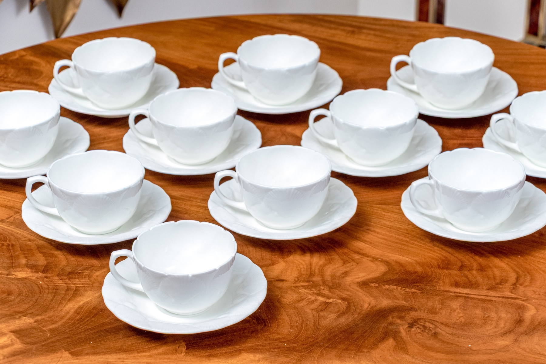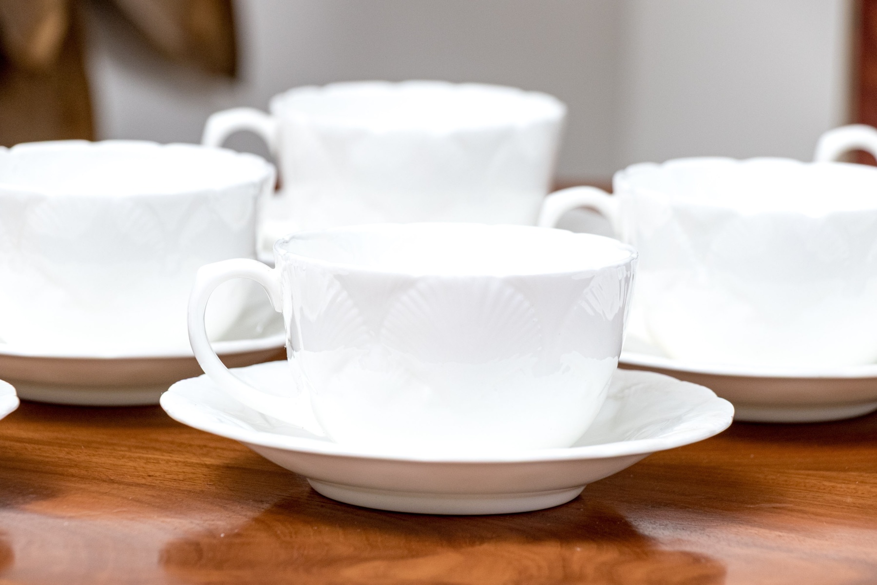 A delightful group of Wedgwood "Oceanside" bone china including eleven cups and eleven saucers. Pieces are designed with bright white bodies and fabulous tessellated bivalve shell motifs in relief, creating gently scalloped rims and beautiful understated texture. Marked underfoot.