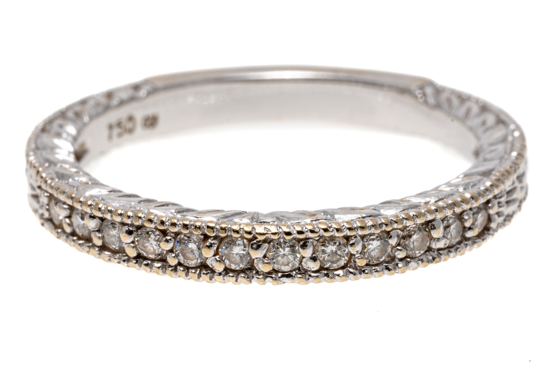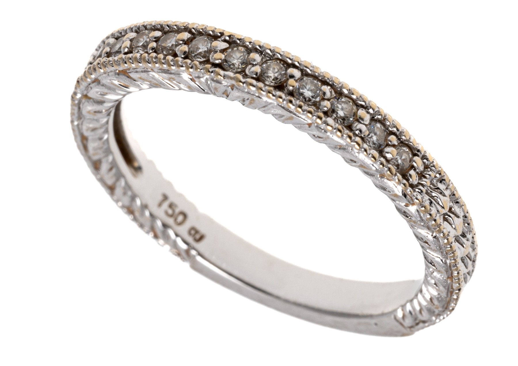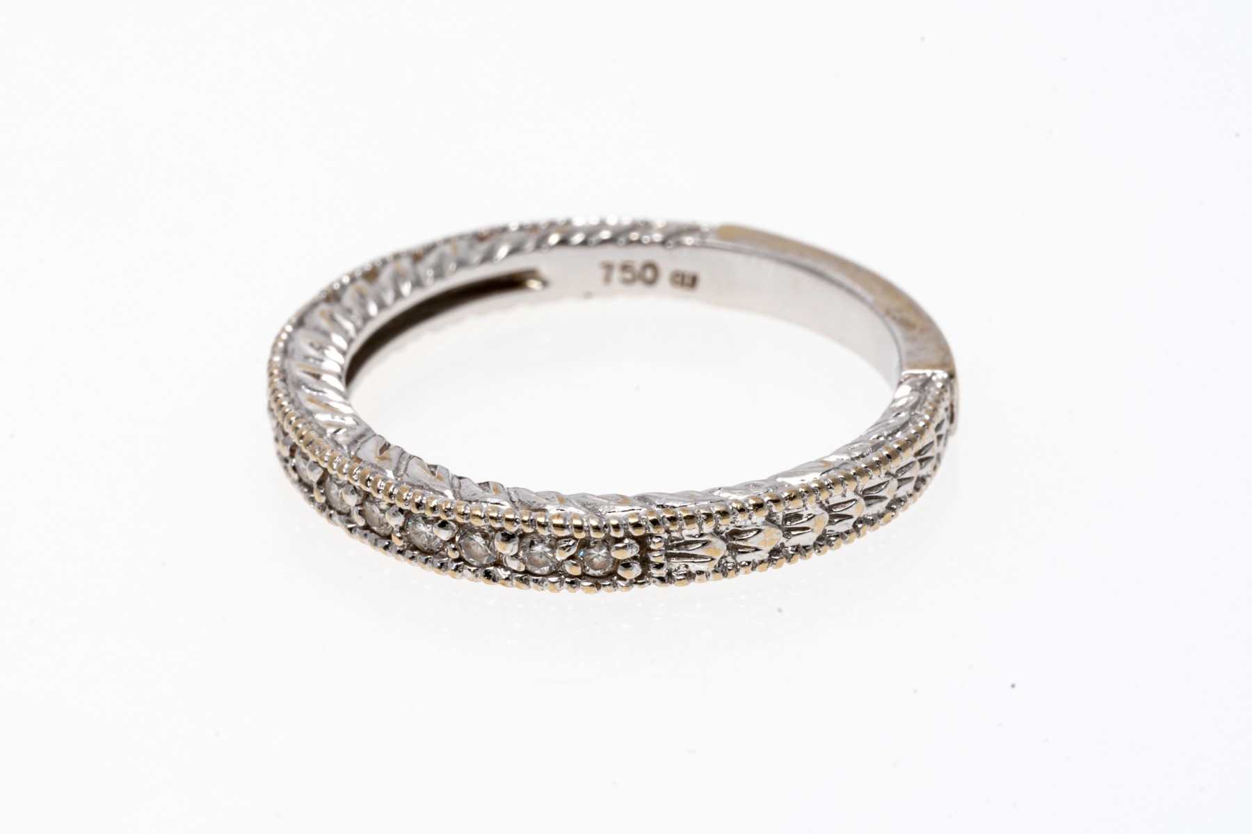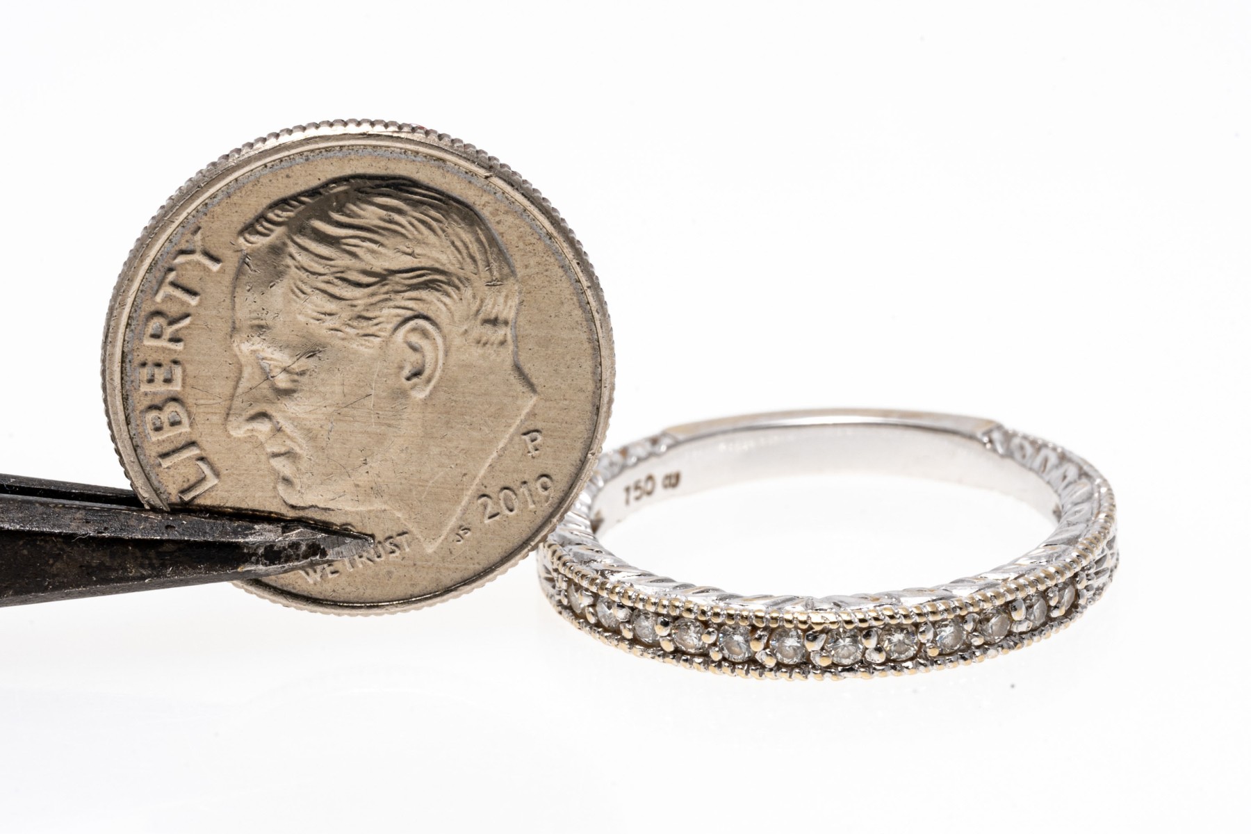 18K white gold ring. The ring is engraved along the sides and edges with milgrain. The top of the ring is set with a trail of brilliant cut diamonds, approximately 0.19 TCW. Ring size 6.75.