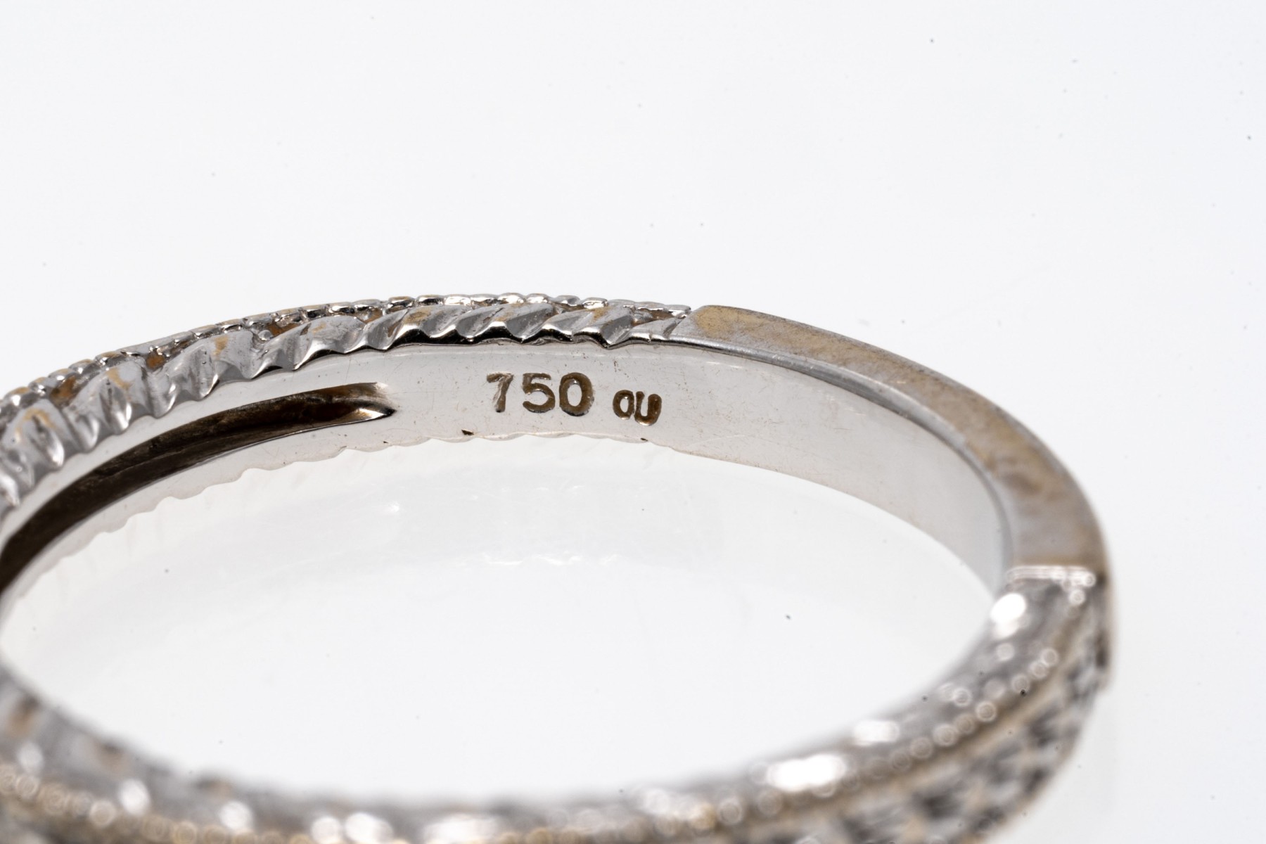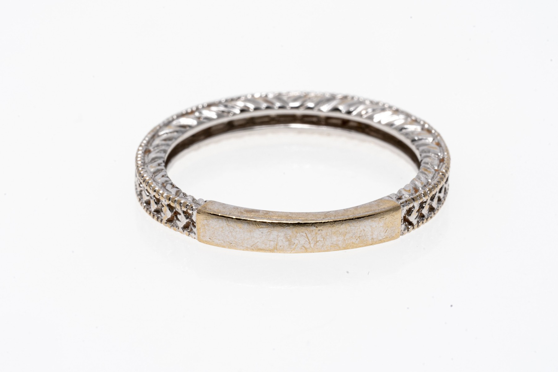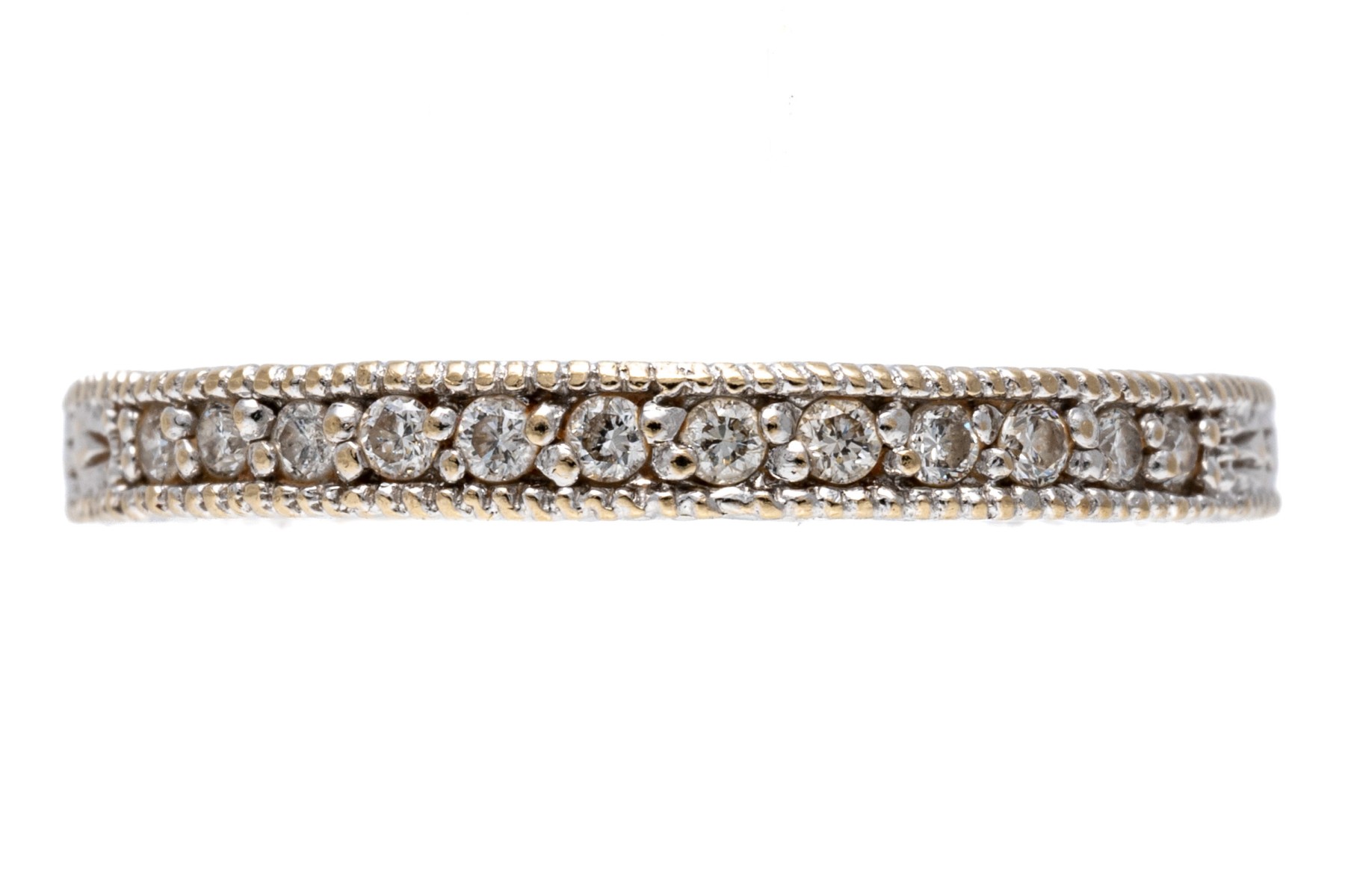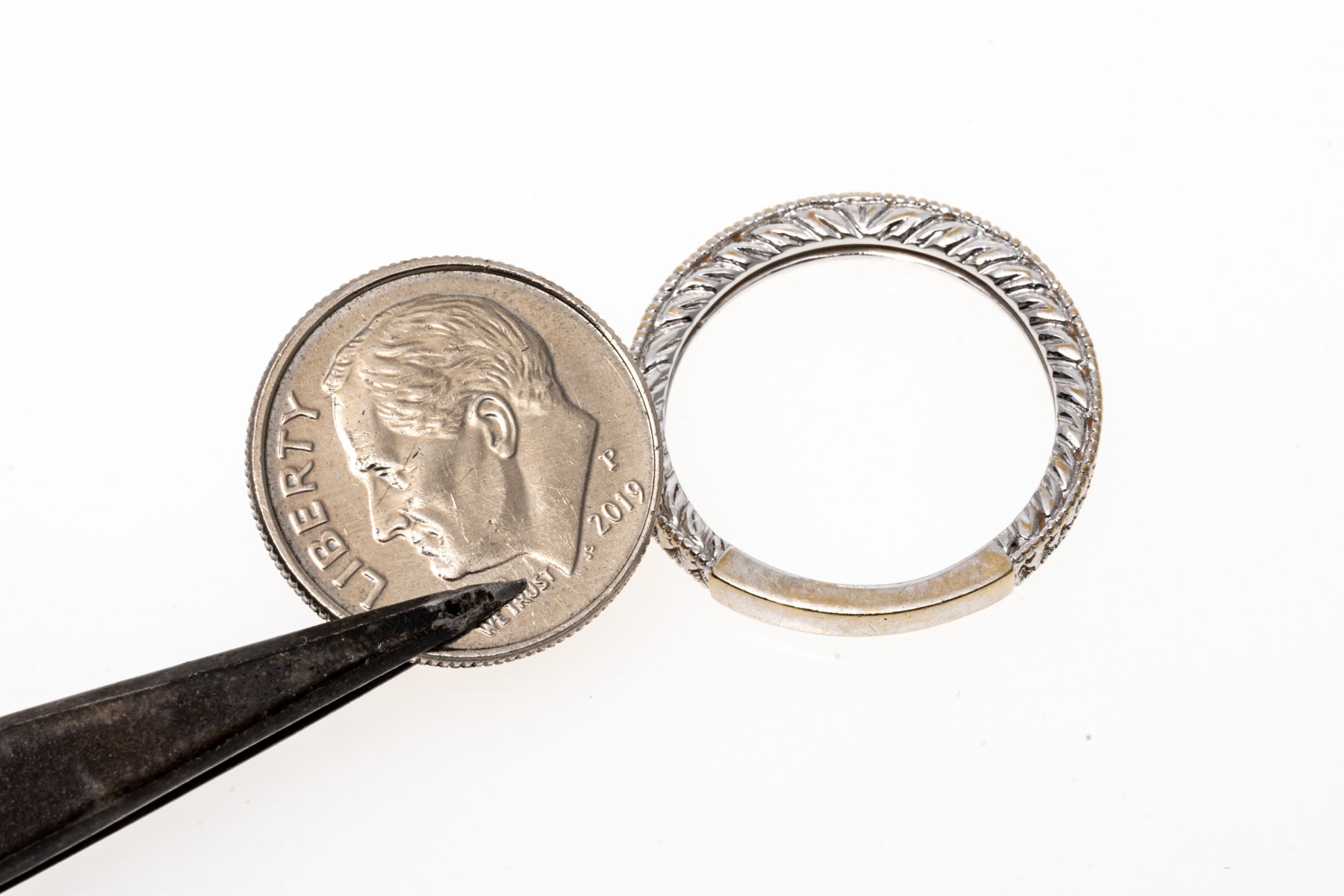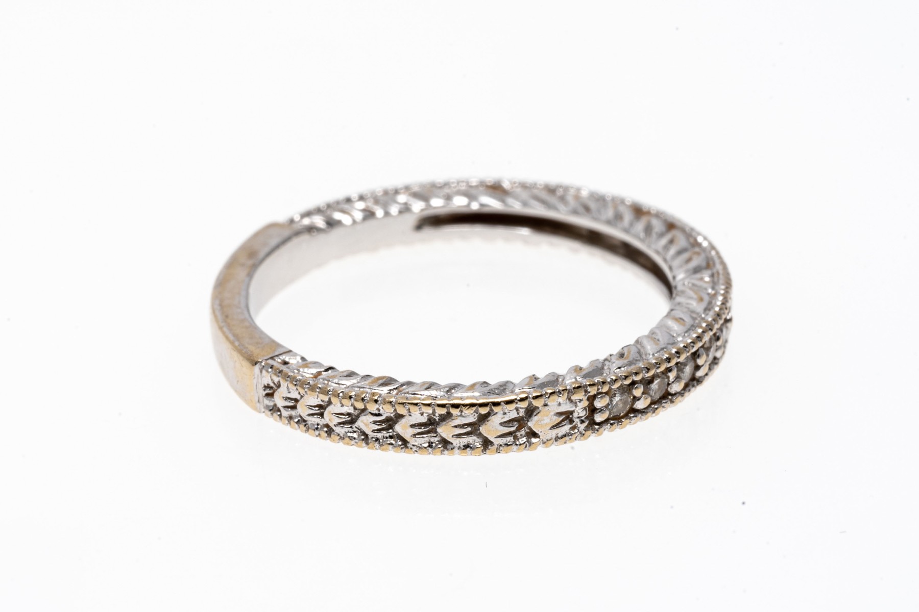 18K white gold ring. The ring is engraved along the sides and edges with milgrain. The top of the ring is set with a trail of brilliant cut diamonds, approximately 0.19 TCW. Ring size 6.75.