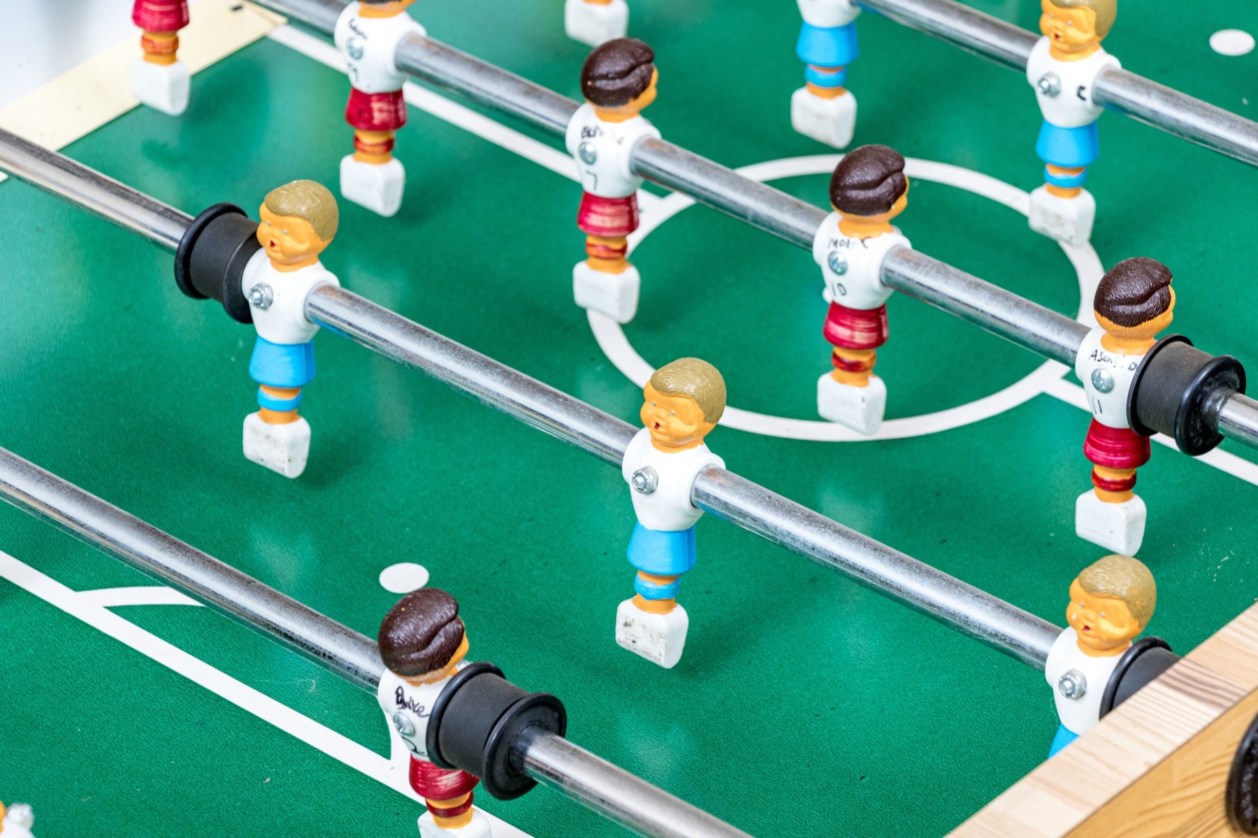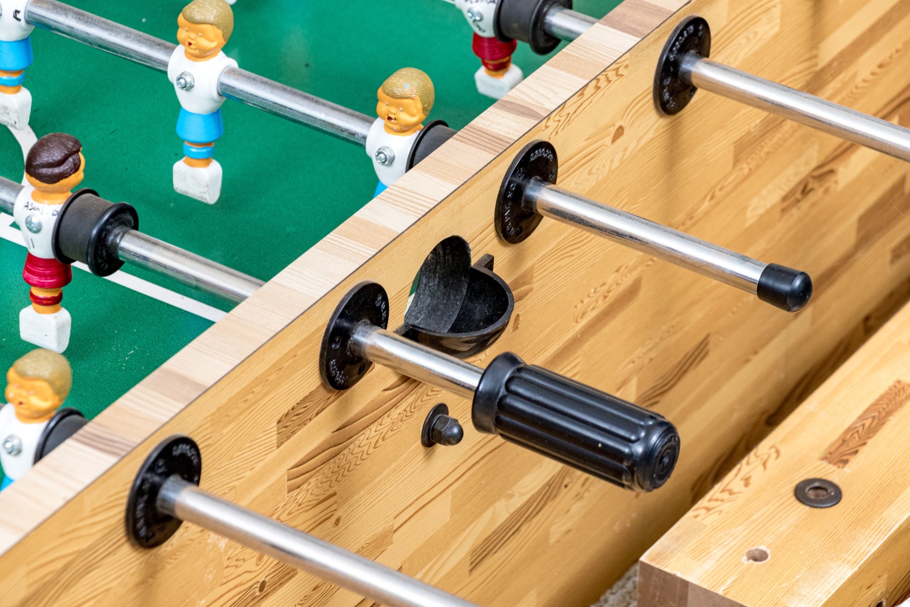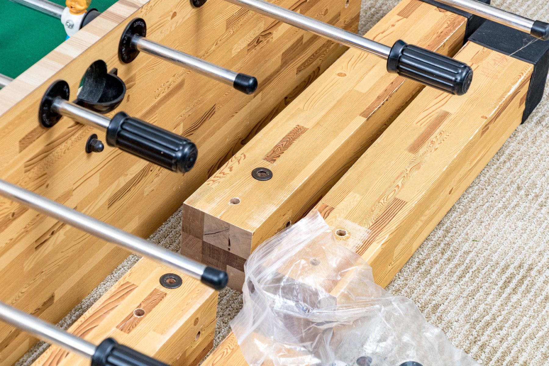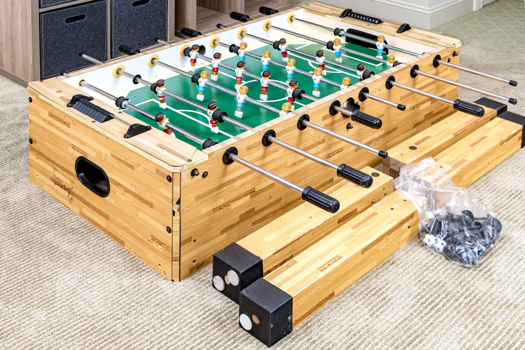 A classic foosball table in butcherblock style honeyed brown veneers and vibrant colors across the field and players. Comes disassembled with the four legs loose for easier transportation.