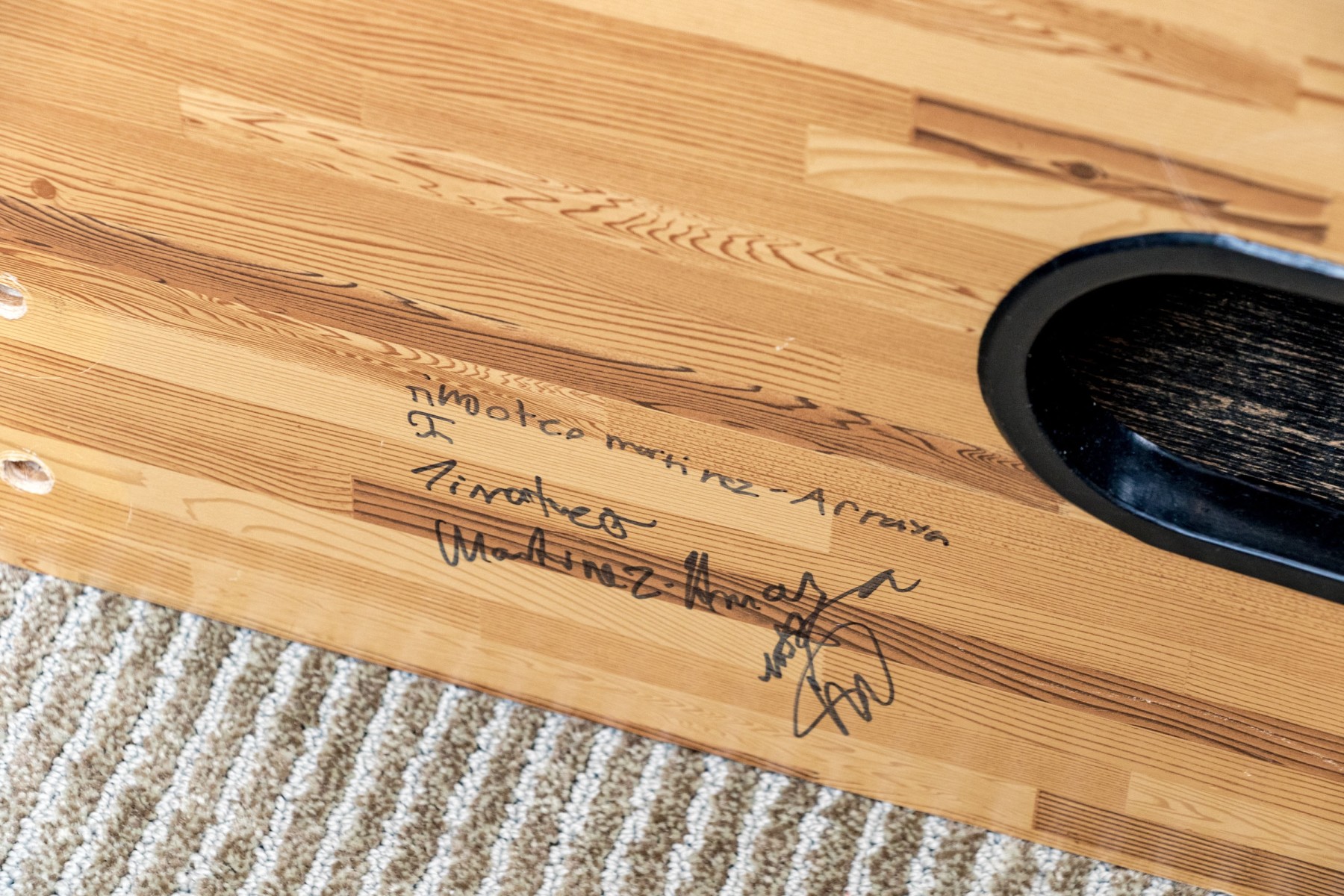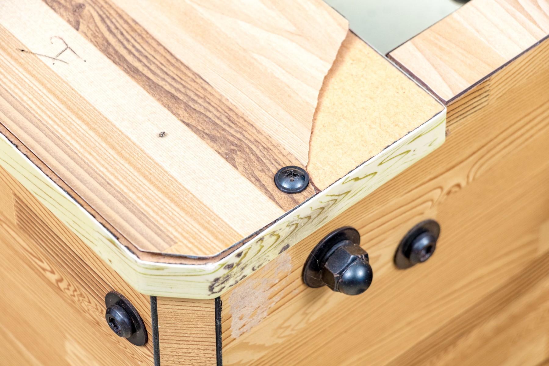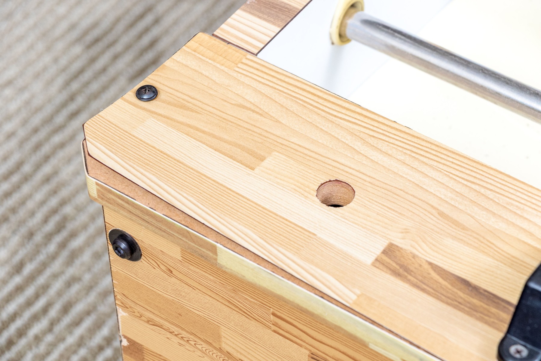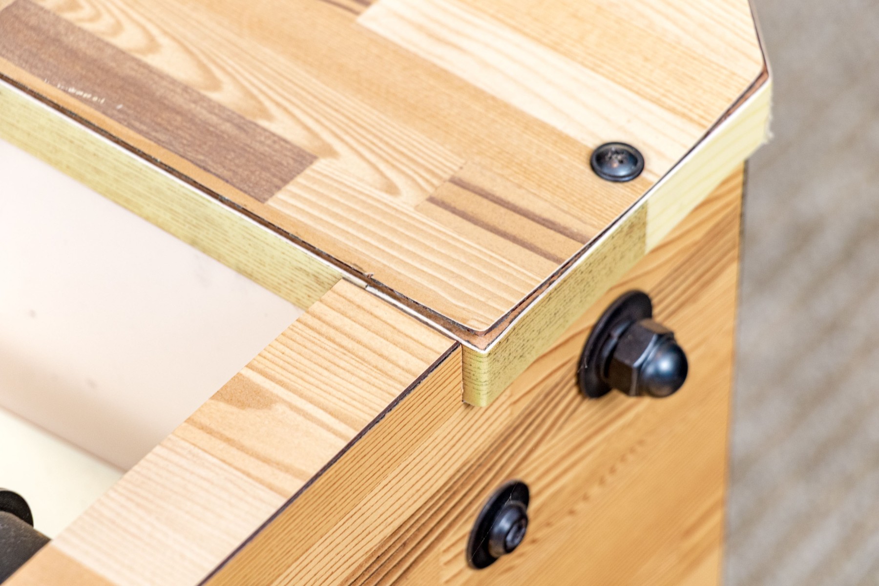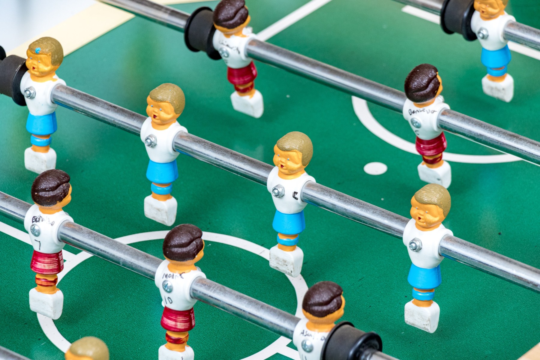 A classic foosball table in butcherblock style honeyed brown veneers and vibrant colors across the field and players. Comes disassembled with the four legs loose for easier transportation.
