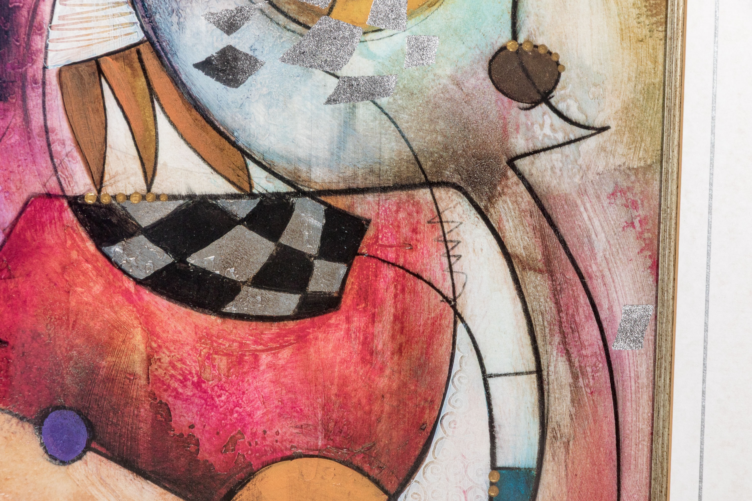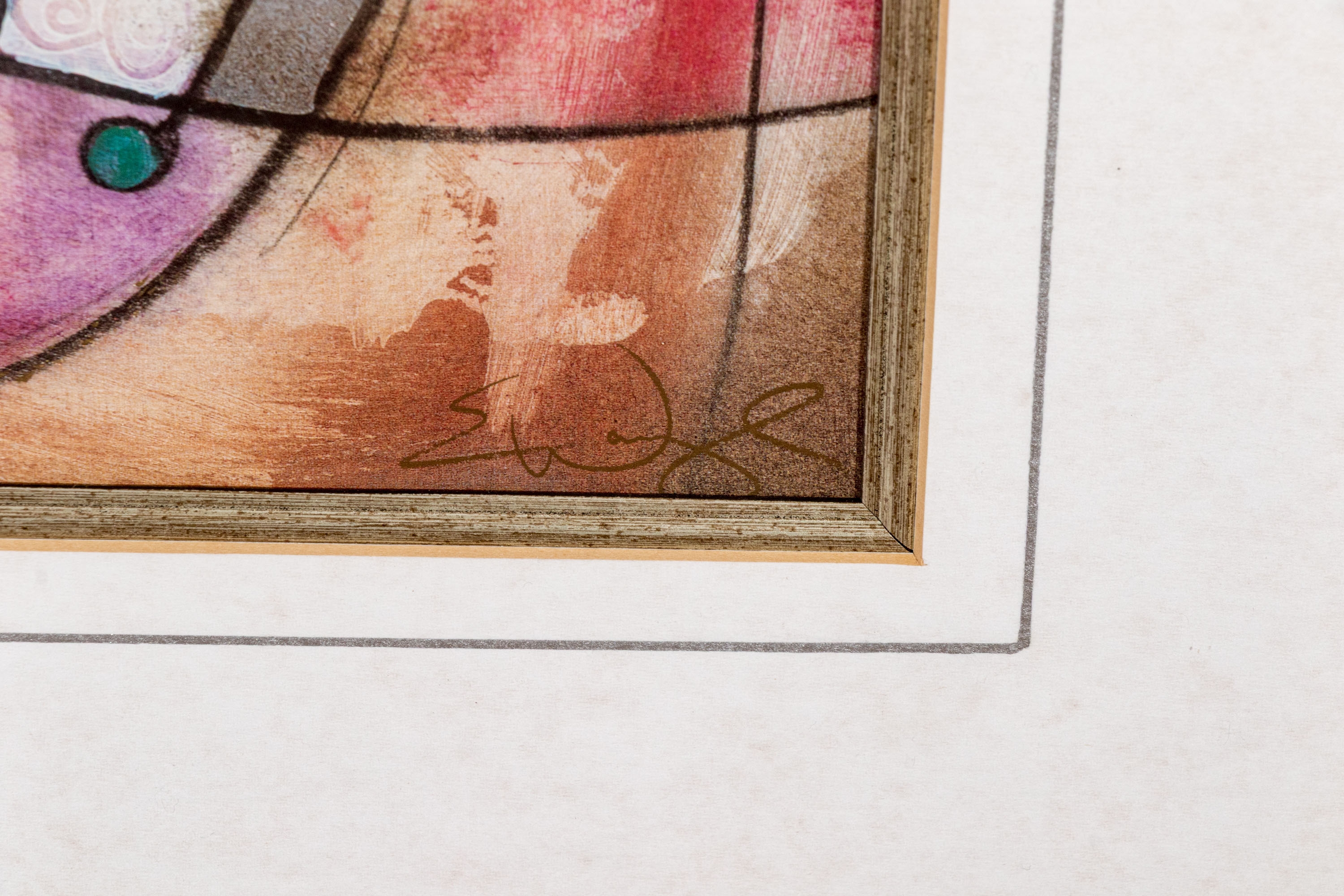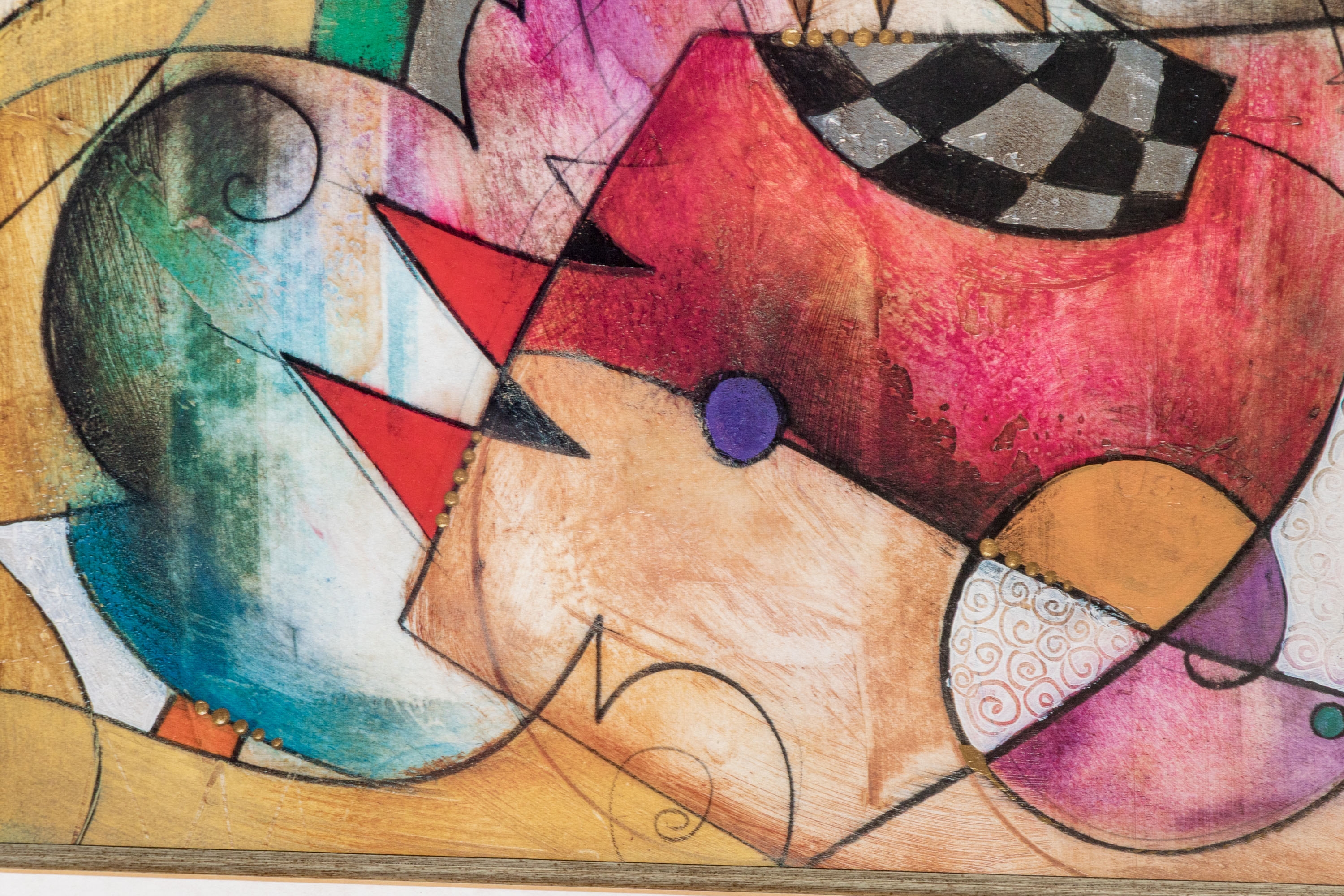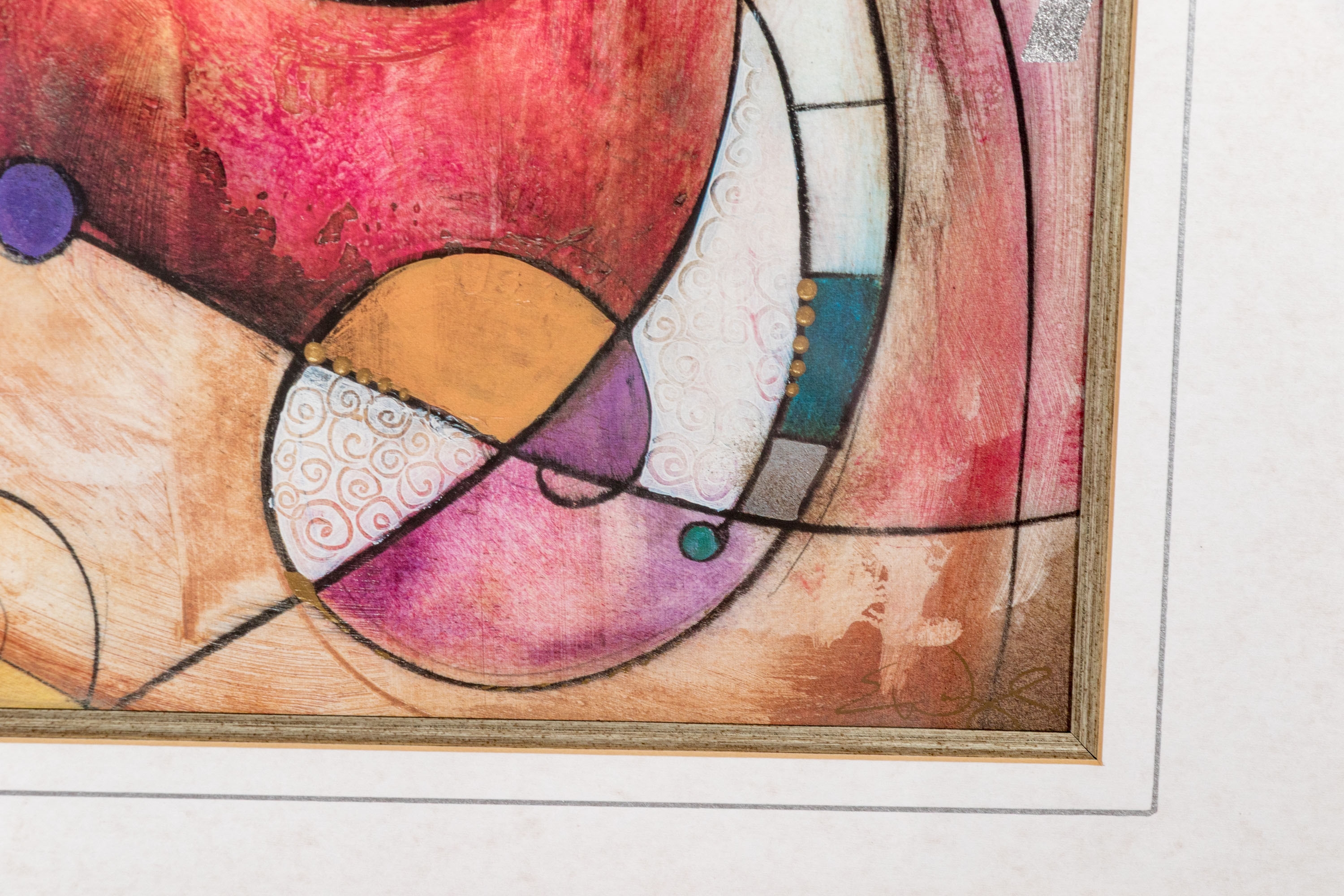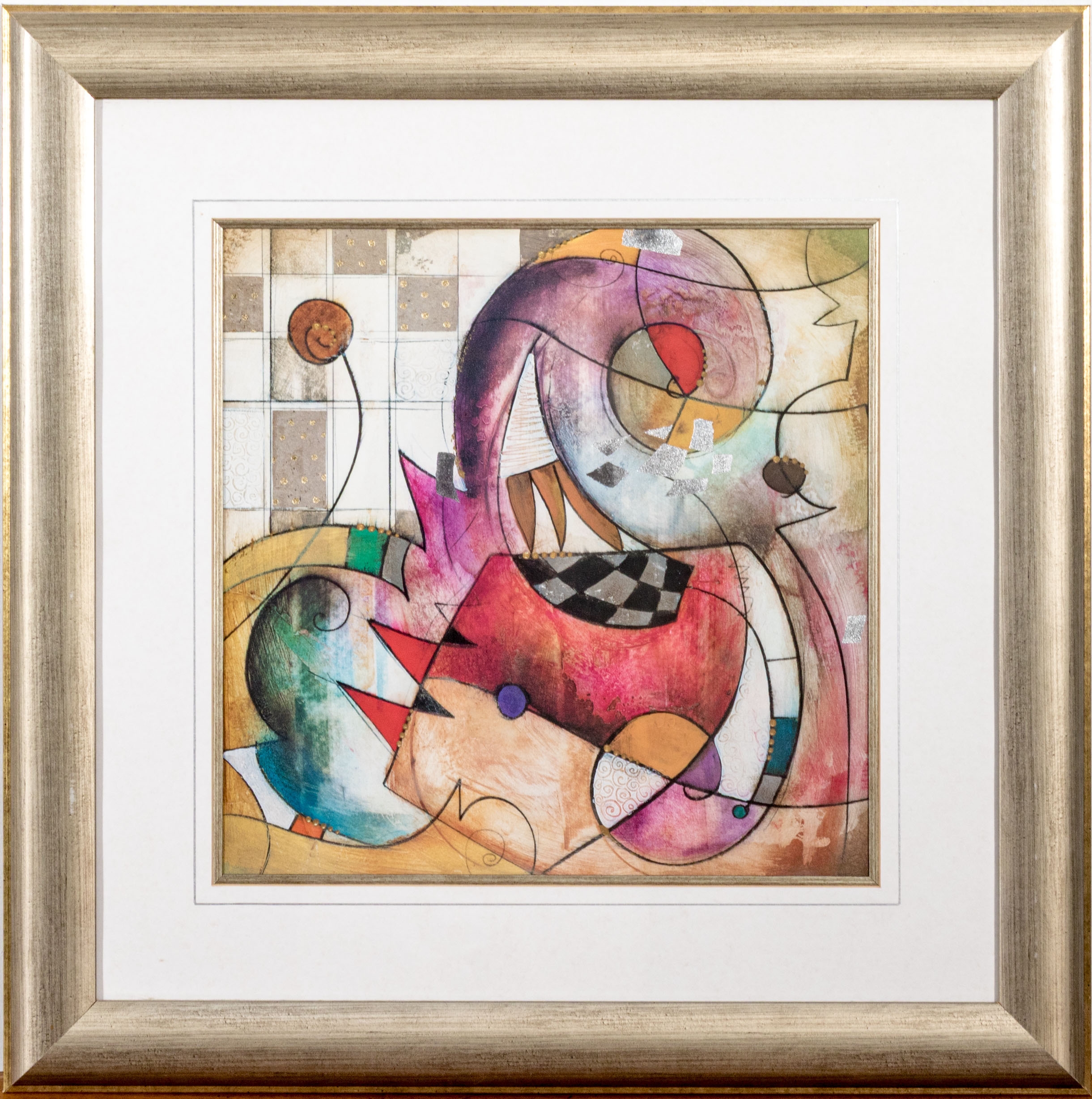 Signed in plate lower right. Abstract with grid background and biomorphic forms in vibrant colors. Presented custom matted and framed.