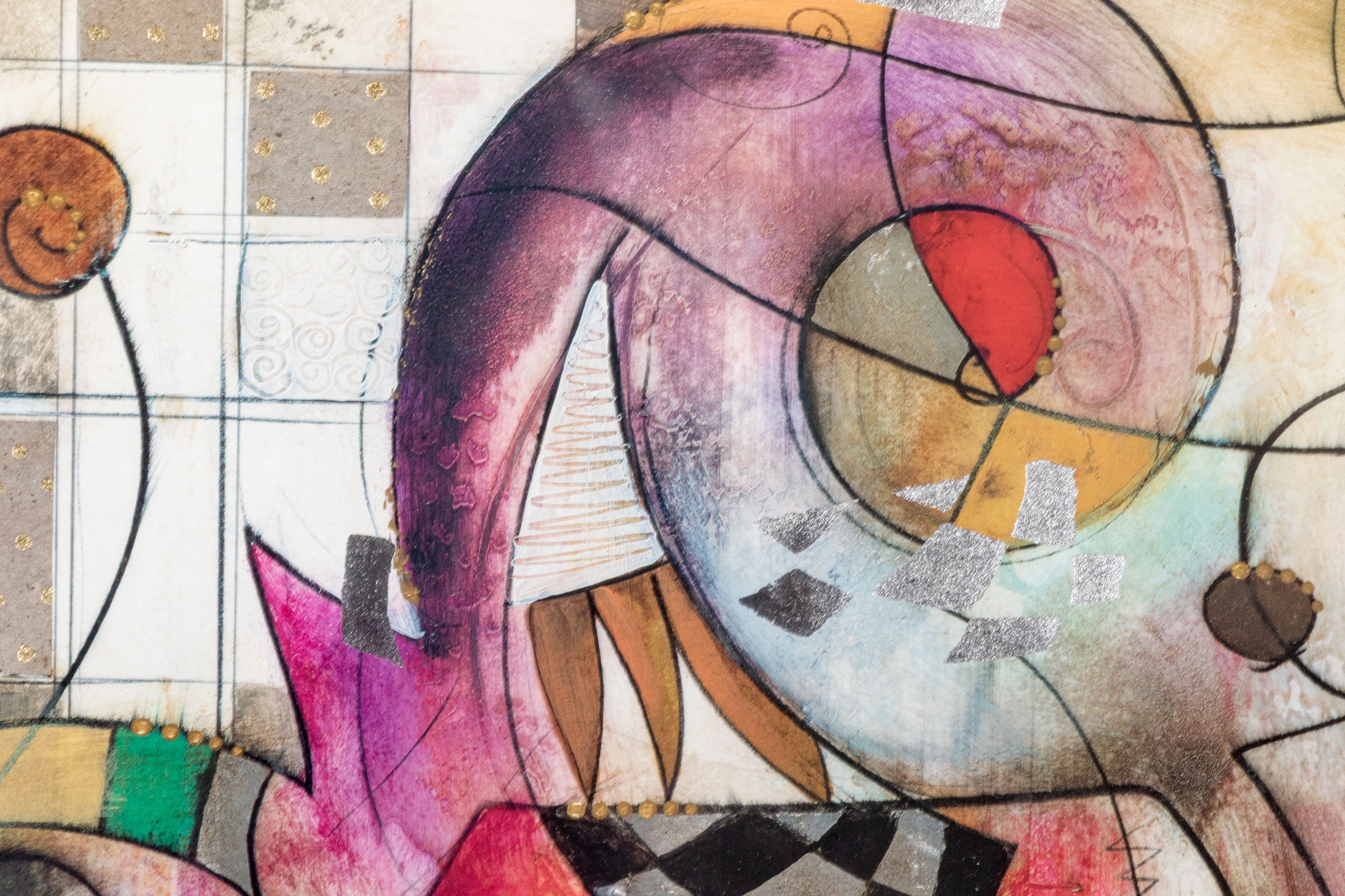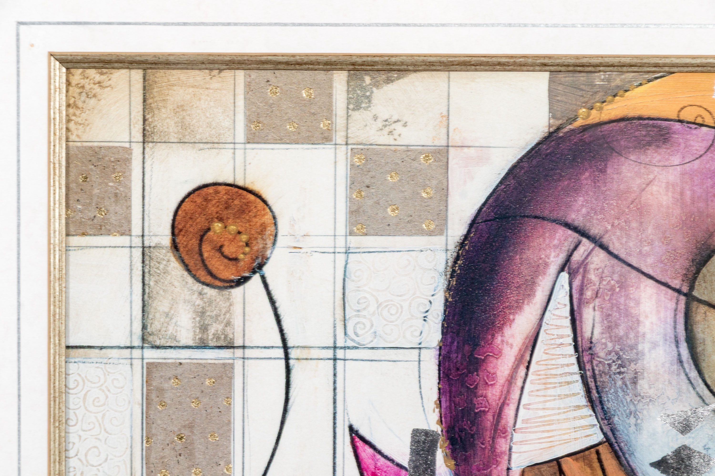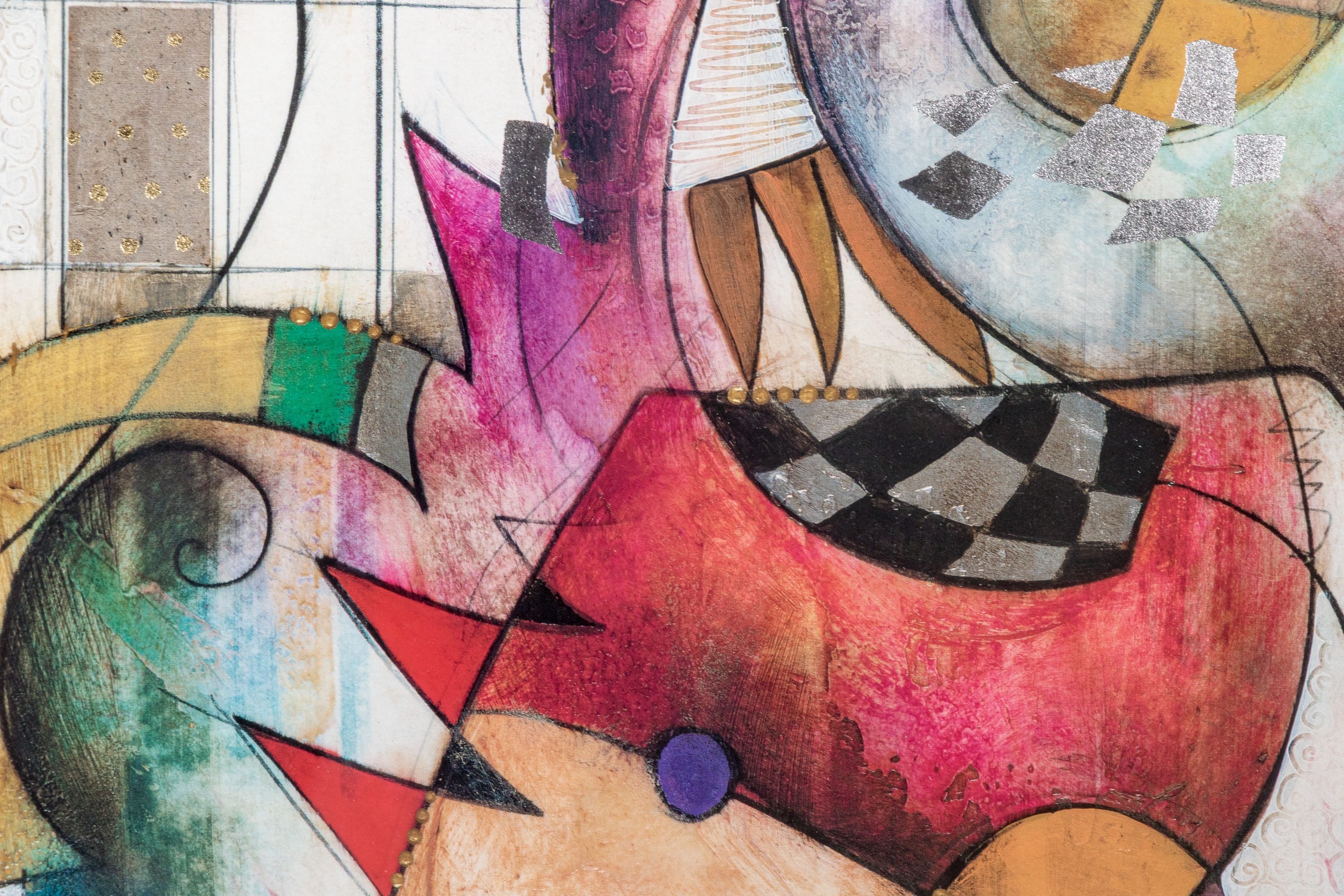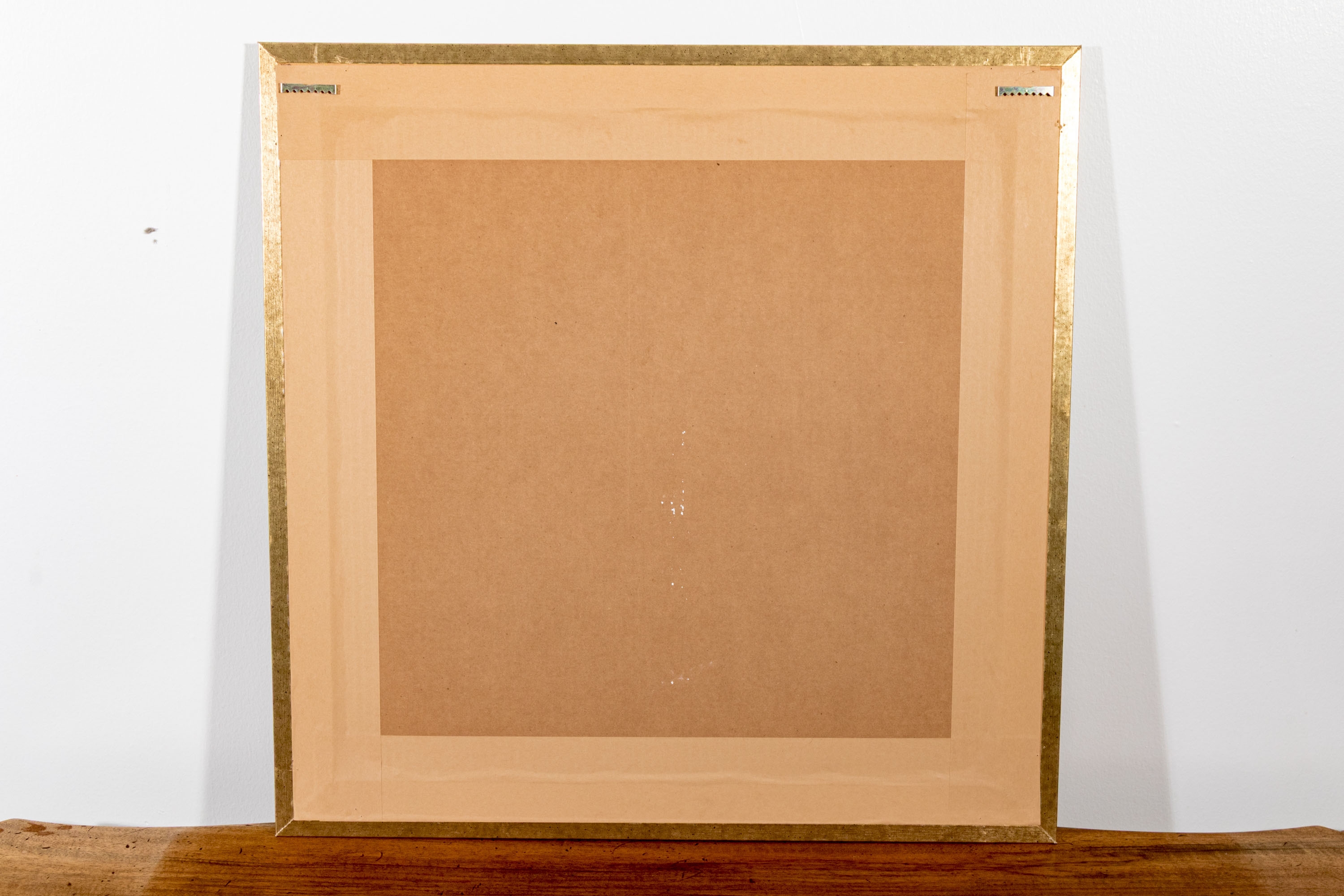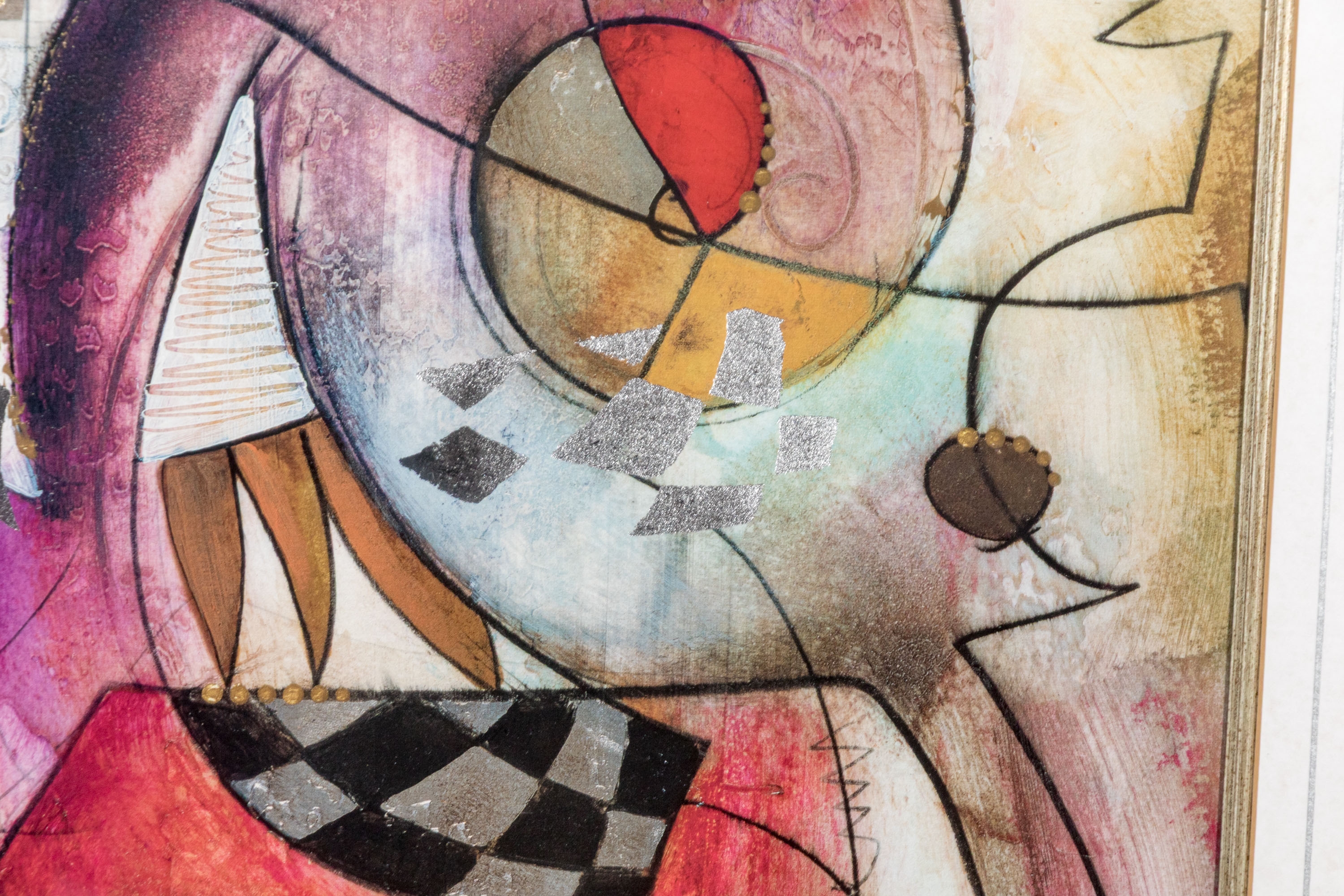 Signed in plate lower right. Abstract with grid background and biomorphic forms in vibrant colors. Presented custom matted and framed.