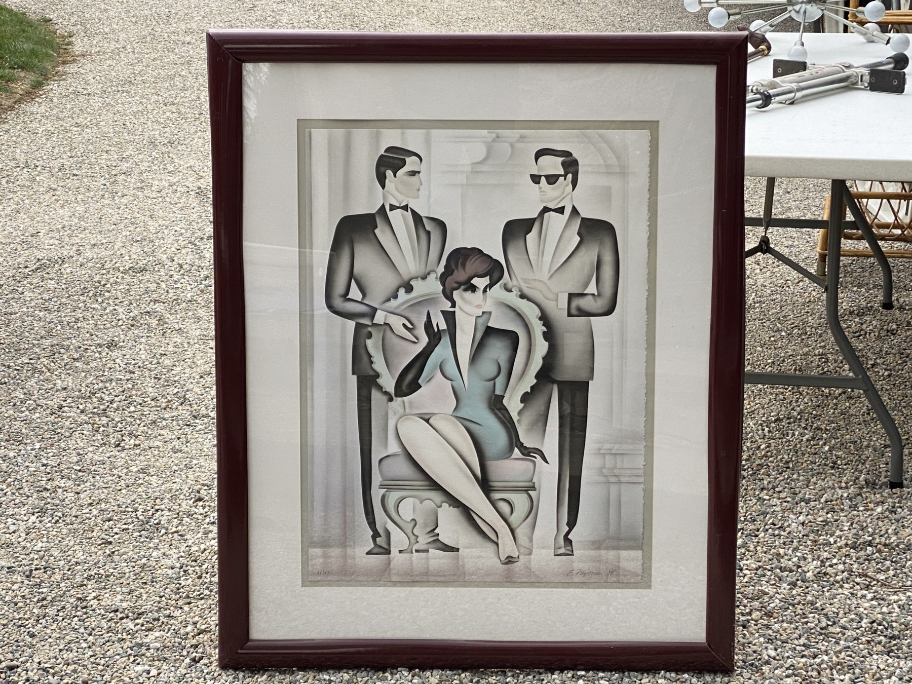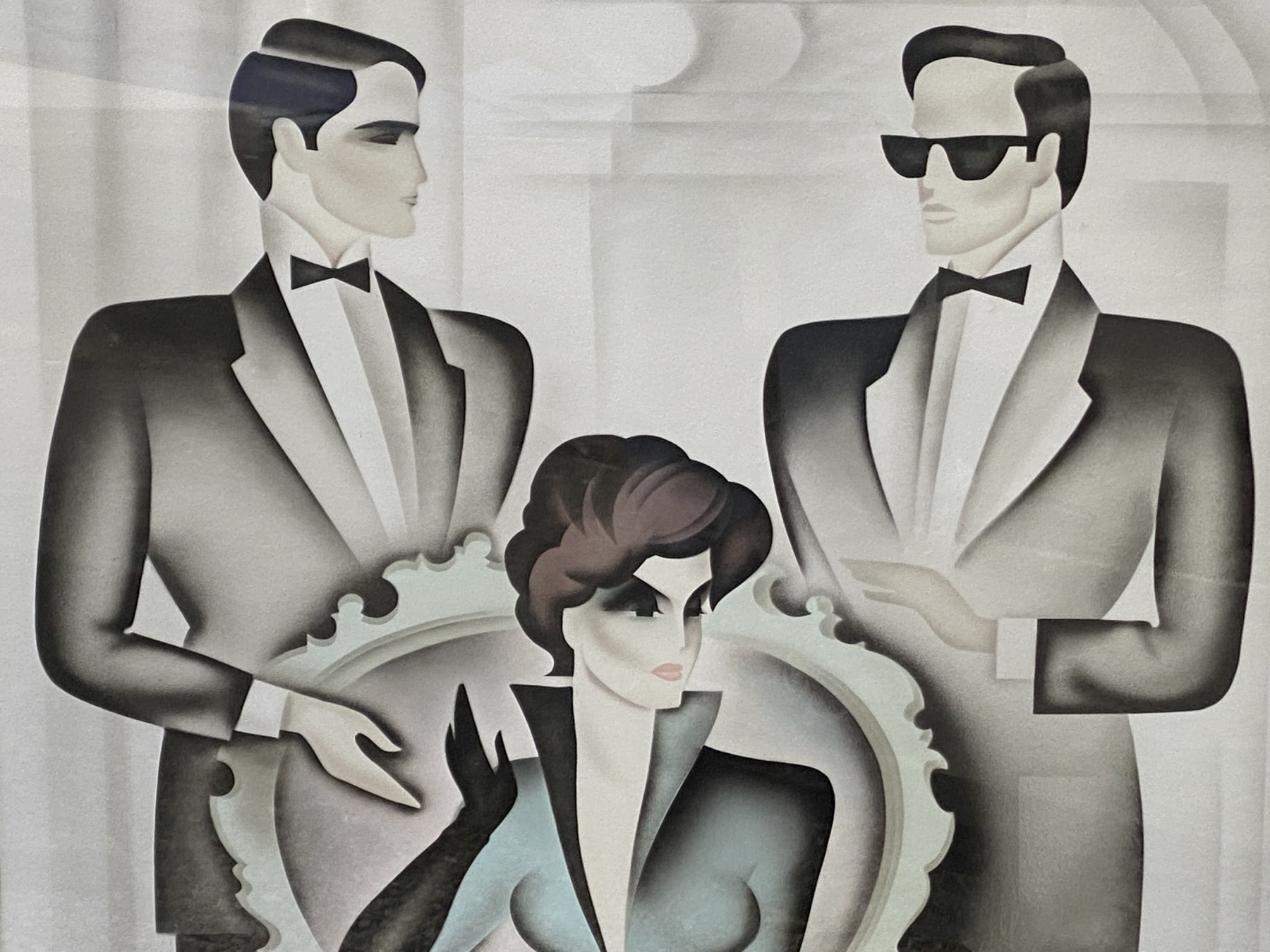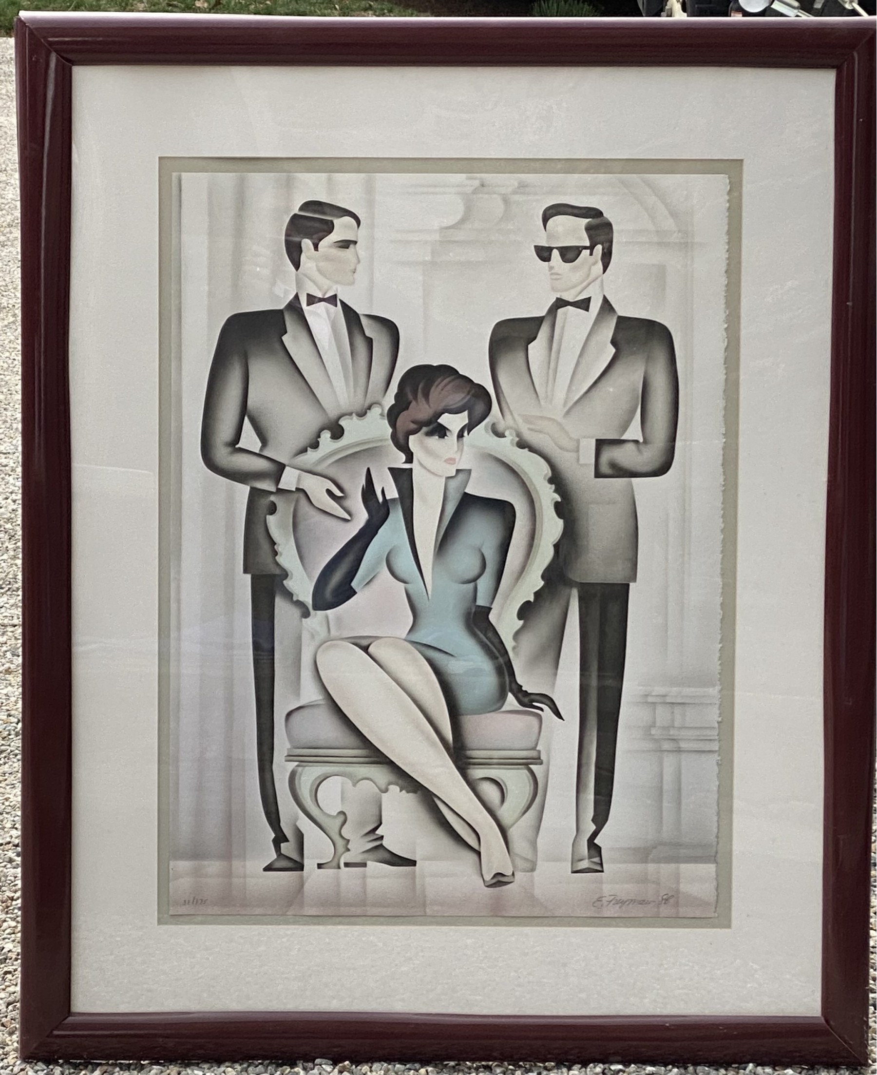 Erik Freyman (Russian-American, 1932-2018) print depicting a stylish Art deco woman in a blue dress seated in an elegant Louis XV style slipper chair. Two dapper gentlemen in suits guard her, standing behind the chair in a stately white stone interior with a polished tiled floor. Pencil signed lower right and numbered 31/175 lower left.