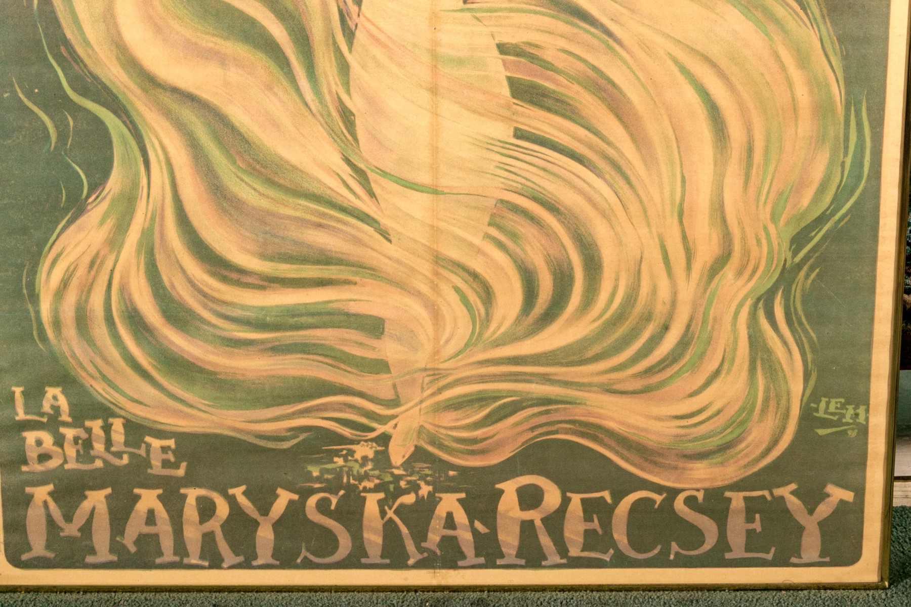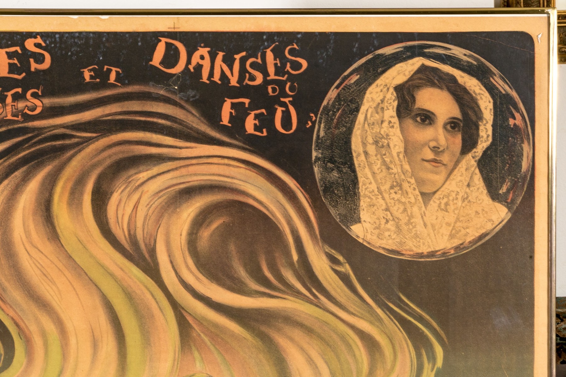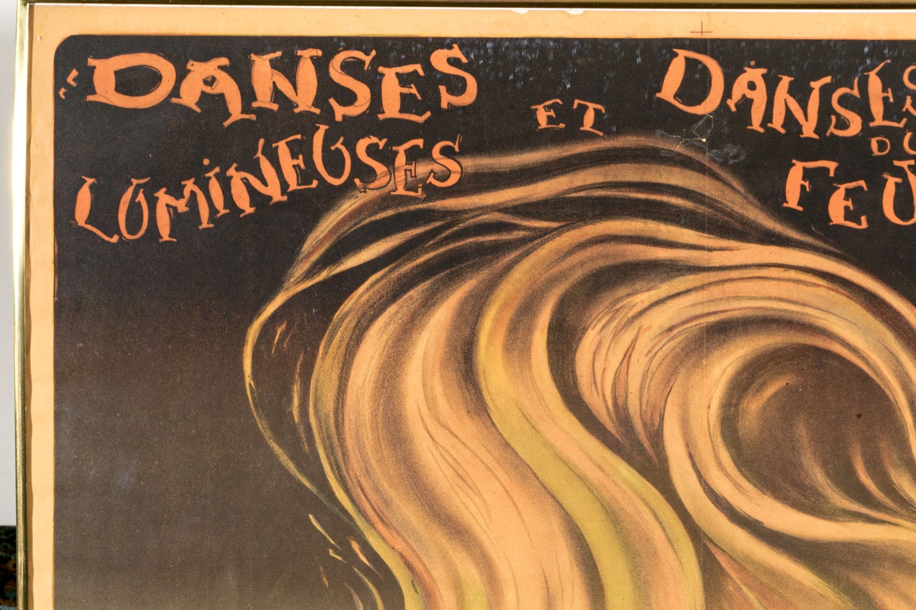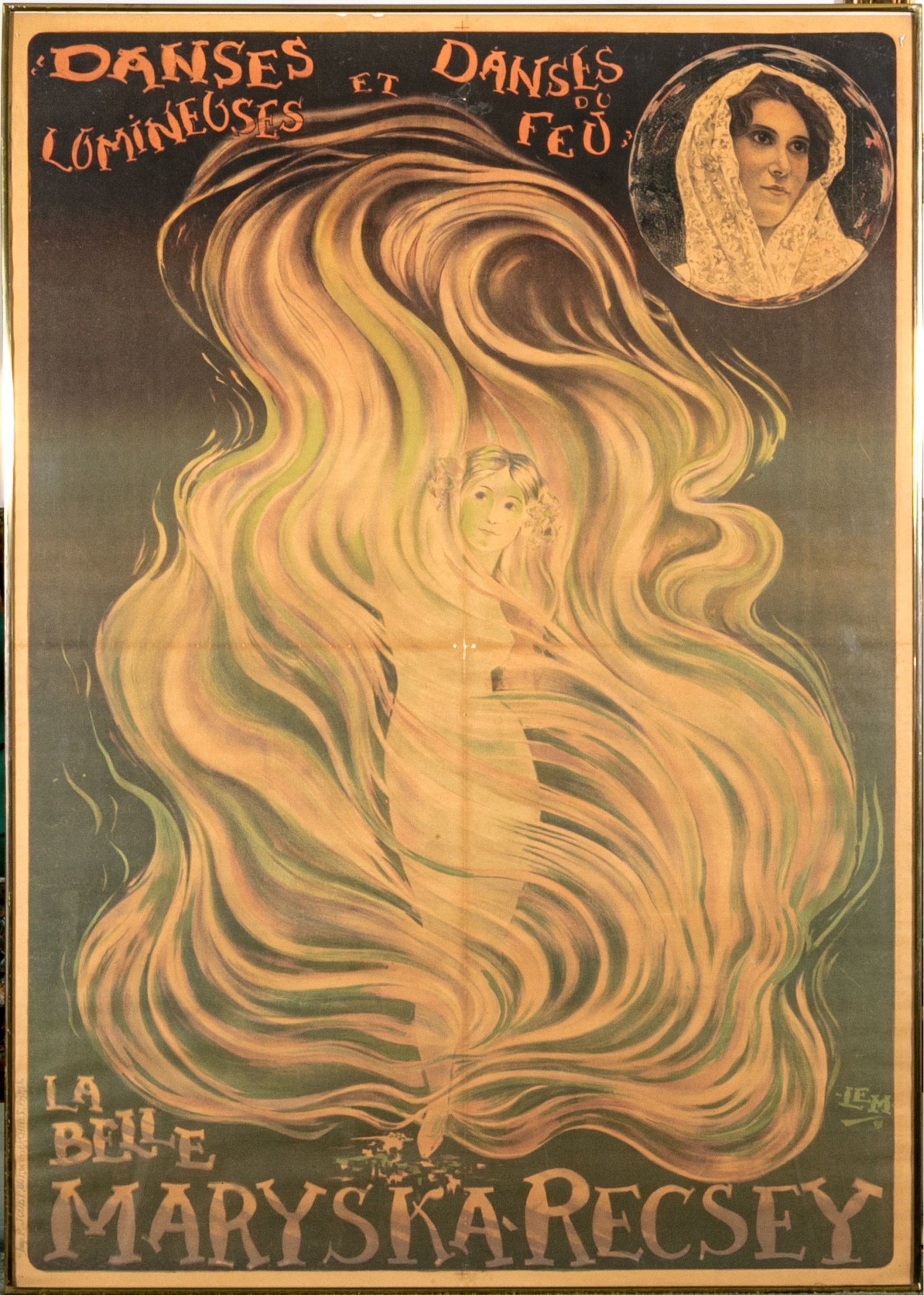 Ernest Barthelemy Lem (French, 1869-1930 lithographic poster for "Danses Lumineuses et Danses Du Feu" starring actress Maryska Recsey. The poster features an illustration depicting a woman emerging from swirling flames in yellow, pink, and green, creating an impressive and impactful display. Printed by P. Jouet. Displayed in a simple gilt frame.